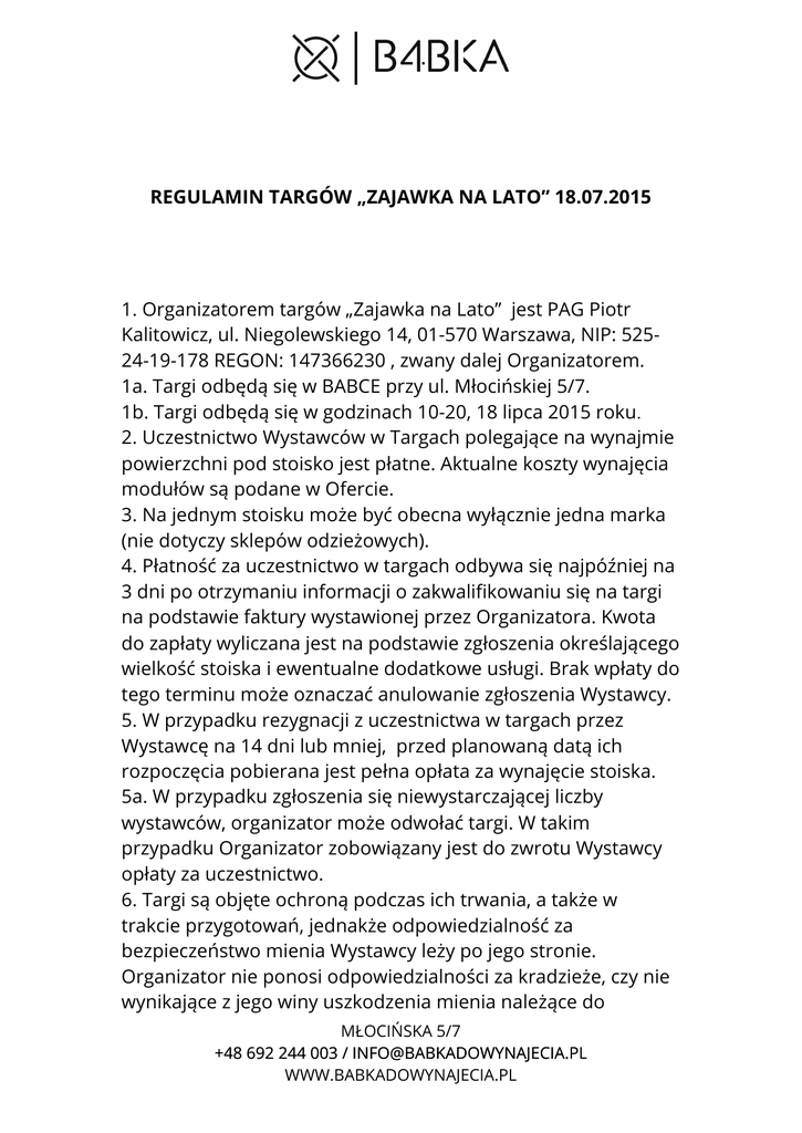 REGULAMIN TARGÓW „ZAJAWKA NA LATO” 18.07.2015 1. Organizatorem targów „Zajawka na Lato” jest PAG Piotr Kalitowicz, ul. Niegolewskiego 14, 01-570 Warszawa, NIP: 52524-19-178 REGON: 147366230 , zwany dalej Organizatorem. 1a. Targi odbędą się w BABCE przy ul. Młocińskiej 5/7. 1b. Targi odbędą się w godzinach 10-20, 18 lipca 2015 roku. 2. Uczestnictwo Wystawców w Targach polegające na wynajmie powierzchni pod stoisko jest płatne. Aktualne koszty wynajęcia modułów są podane w Ofercie. 3. Na jednym stoisku może być obecna wyłącznie jedna marka (nie dotyczy sklepów odzieżowych). 4. Płatność za uczestnictwo w targach odbywa się najpóźniej na 3 dni po otrzymaniu informacji o zakwalifikowaniu się na targi na podstawie faktury wystawionej przez Organizatora. Kwota do zapłaty wyliczana jest na podstawie zgłoszenia określającego wielkość stoiska i ewentualne dodatkowe usługi. Brak wpłaty do tego terminu może oznaczać anulowanie zgłoszenia Wystawcy. 5. W przypadku rezygnacji z uczestnictwa w targach przez Wystawcę na 14 dni lub mniej, przed planowaną datą ich rozpoczęcia pobierana jest pełna opłata za wynajęcie stoiska. 5a. W przypadku zgłoszenia się niewystarczającej liczby wystawców, organizator może odwołać targi. W takim przypadku Organizator zobowiązany jest do zwrotu Wystawcy opłaty za uczestnictwo. 6. Targi są objęte ochroną podczas ich trwania, a także w trakcie przygotowań, jednakże odpowiedzialność za bezpieczeństwo mienia Wystawcy leży po jego stronie. Organizator nie ponosi odpowiedzialności za kradzieże, czy nie wynikające z jego winy uszkodzenia mienia należące do MŁOCIŃSKA 5/7 +48 692 244 003 / [email protected] WWW.BABKADOWYNAJECIA.PL Wystawcy. 7. Wystawcy na swój koszt zapewniają wystrój stoisk, ich montaż, demontaż, wszelkie transporty, materiały promocyjne, stoły, krzesła, sztendery, wieszaki, personel pracujący przy stoisku, a także uprzątnięcie i zabezpieczenie stoisk oraz przywrócenie powierzchni na którym eksponowane było stoisko do stanu pierwotnego. 7a. Istnieje możliwość wypożyczenia stołów, krzeseł oraz innych produktów z dodatkowej oferty Organizatora. Usługa ta jest wyceniana oddzielnie, a kwota dodawana jest do faktury za uczestnictwo w Targach. 8. Wystawca jest zobowiązany do zapewnienia dostępności stoiska i obecności personelu pracującego przy stoisku w godzinach otwarcia Targów. W przypadku opóźnień w montażu stoiska, bądź braku personelu na stoisku, Organizator ma prawo do wykluczenia Wystawcy z Targów bez obowiązku zwrotu opłaty za stoisko. 9. W przypadku wystąpienia zniszczeń, bądź uszkodzeń obiektu powstałych z winy Wystawcy, bądź osób mu towarzyszących, będzie on zobowiązany do pokrycia kosztów ich napraw. 10. Wystawcy podczas Targów mają obowiązek przestrzegać zasad BHP oraz Regulaminu obiektu dostępnego w obiekcie. 12. Odpowiedzialność za treść jakichkolwiek materiałów, projektów, produktów eksponowanych i sprzedawanych przez Wystawców znajduje się po ich stronie. 13. Organizator zastrzega sobie prawo do zmiany miejsca, lub terminu Targów w przypadku wystąpienia okoliczności od niego niezależnych, po uprzednim poinformowaniu o tym fakcie Wystawcy. W przypadku zaistnienie powyższych okoliczności opłata za wynajem stoiska nie podlega zwrotowi. 14. Organizator zobowiązuje się do aktywnej promocji Targów w mediach, dbania o PR, a także do bieżącego informowania o Targach w mediach społecznościowych i w innych dostępnych mu kanałach informacji. 15. Aby zadbać o jak największe dotarcie do szerokiej grupy MŁOCIŃSKA 5/7 +48 692 244 003 / [email protected] WWW.BABKADOWYNAJECIA.PL odbiorców, Wystawcy mają obowiązek udostępnić informację o Targach (wydarzeniu) na firmowych profilach na facebooku oraz dokonać na nich co najmniej dwóch wpisów na temat swojego uczestnictwa w Targach przed ich rozpoczęciem. 16. Organizator ma prawo do wykonania dokumentacji zdjęciowej i filmowej podczas Targów oraz wykorzystywania tych materiałów do celów marketingowych. 17. Wszelkie zmiany niniejszego Regulaminu są możliwe, jednak jedynie w formie publikacji na stronie www.babkadowynajecia.pl MŁOCIŃSKA 5/7 +48 692 244 003 / [email protected] WWW.BABKADOWYNAJECIA.PL