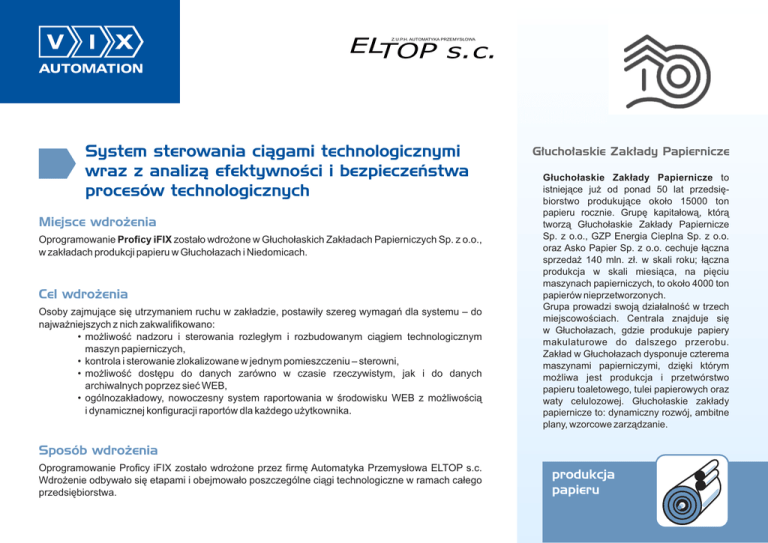 ELTOP s.c. Z.U.P.H. AUTOMATYKA PRZEMYSŁOWA System sterowania ciągami technologicznymi wraz z analizą efektywności i bezpieczeństwa procesów technologicznych Miejsce wdrożenia Oprogramowanie Proficy iFIX zostało wdrożone w Głuchołaskich Zakładach Papierniczych Sp. z o.o., w zakładach produkcji papieru w Głuchołazach i Niedomicach. Cel wdrożenia Osoby zajmujące się utrzymaniem ruchu w zakładzie, postawiły szereg wymagań dla systemu – do najważniejszych z nich zakwalifikowano: • możliwość nadzoru i sterowania rozległym i rozbudowanym ciągiem technologicznym maszyn papierniczych, • kontrola i sterowanie zlokalizowane w jednym pomieszczeniu – sterowni, • możliwość dostępu do danych zarówno w czasie rzeczywistym, jak i do danych archiwalnych poprzez sieć WEB, • ogólnozakładowy, nowoczesny system raportowania w środowisku WEB z możliwością i dynamicznej konfiguracji raportów dla każdego użytkownika. Głuchołaskie Zakłady Papiernicze Głuchołaskie Zakłady Papiernicze to istniejące już od ponad 50 lat przedsiębiorstwo produkujące około 15000 ton papieru rocznie. Grupę kapitałową, którą tworzą Głuchołaskie Zakłady Papiernicze Sp. z o.o., GZP Energia Cieplna Sp. z o.o. oraz Asko Papier Sp. z o.o. cechuje łączna sprzedaż 140 mln. zł. w skali roku; łączna produkcja w skali miesiąca, na pięciu maszynach papierniczych, to około 4000 ton papierów nieprzetworzonych. Grupa prowadzi swoją działalność w trzech miejscowościach. Centrala znajduje się w Głuchołazach, gdzie produkuje papiery makulaturowe do dalszego przerobu. Zakład w Głuchołazach dysponuje czterema maszynami papierniczymi, dzięki którym możliwa jest produkcja i przetwórstwo papieru toaletowego, tulei papierowych oraz waty celulozowej. Głuchołaskie zakłady papiernicze to: dynamiczny rozwój, ambitne plany, wzorcowe zarządzanie. Sposób wdrożenia Oprogramowanie Proficy iFIX zostało wdrożone przez firmę Automatyka Przemysłowa ELTOP s.c. Wdrożenie odbywało się etapami i obejmowało poszczególne ciągi technologiczne w ramach całego przedsiębiorstwa. produkcja papieru Wykorzystane moduły oprogramowania Podstawą systemu jest oprogramowanie Proficy HMI/SCADA iFIX. Wykorzystano następujące stanowiska: 3 x Stacja Server – Proficy iFIX 2.6 Runtime 3 x Stacja Server – Proficy iFIX 3.0 Runtime 3 x Stacja Server – Proficy iFIX 4.0 PLUS Runtime Proficy Historian Proficy Real Time Information Portal GŁUCHOŁAZY MASZYNA MP1 GŁUCHOŁAZY MASZYNA MP2 PLC PLC stacja operatorska Proficy iFIX 4.0 panel dotykowy GŁUCHOŁAZY MASZYNA MP3 stacja operatorska Proficy iFIX 3.0 panel dotykowy switch PLC stacja operatorska Proficy iFIX 4.0 panel dotykowy switch switch ETHERNET stacja serwerowa Proficy Portal Proficy Historian stacja operatorska Proficy iFIX 3.0 stacja operatorska Proficy iFIX 3.0 firewall PLC zdalny nadzór oprogramowanie zewnętrzne PLC internet GŁUCHOŁAZY MASZYNA MP5 GŁUCHOŁAZY PRZYGOTOWANIE MASY NIEDOMICE MASZYNA MP1 firewall stacja operatorska Proficy iFIX 4.0 panel dotykowy switch PLC Schemat instalacji Zakres wdrożenia i jego przebieg Przed wdrożeniem zautomatyzowanego systemu sterowania produkcją, większość procesów produkcyjnych była sterowana ręcznie lub półautomatycznie. W przedsiębiorstwie nie było nowoczesnych układów automatyki oraz systemów SCADA Jako pierwsze, w 1998 roku, zostało wdrożone oprogramowanie FIX 32, w ciągu technologicznym maszyny papierniczej MP3. W kolejnych latach, wraz z modernizacją pozostałych maszyn, wprowadzano oprogramowanie iFIX 2.6 i 3.0 na maszynach MP1, MP2 i MP5 oraz ciągu przygotowania masy papierniczej (iFIX 3.0). W 2007 roku została przeprowadzona duża inwestycja w oddziale w Niedomicach. Na bazie starej maszyny papierniczej wybudowano nową, wraz z ciągami technologicznym przygotowania i oczyszczania masy papierniczej, przygotowaniem wody, oczyszczaniem ścieków. Jako system SCADA wykorzystano tutaj oprogramowanie iFIX 4.0. W międzyczasie modernizowano również ciepłownie w GZP – Głuchołazy w oparciu o oprogramowanie iFiX 3.0 oraz przyzakładową oczyszczalnie ścieków – iFIX 4.0. W roku 2009 kolejną dużą inwestycją była modernizacja maszyny MP3, w czasie której zrezygnowano z systemu Fix 32. Nowy, bardzo rozbudowany ciąg technologiczny nadzoruje iFIX 4.0. Jako dopełnienie systemu w 2008 roku użyto oprogramowania iHistorian i Proficy Portal. Zakończone sukcesem poszczególne etapy wdrożeń w pełni spełniły pokładane w nich oczekiwania. System umożliwia pełną wizualizację, sterowanie i rejestrację danych archiwalnych. System wyposażono w rozbudowane opcje generowania alarmów, a całość procesu technologicznego jest prezentowana na licznych ekranach synoptycznych. Z każdej synoptyki operator ma możliwość dwukierunkowej komunikacji, czyli włączania lub wyłączania urządzeń, czy też całych węzłów technologicznych. Możliwe jest również zadawanie wartości regulatorów. Proficy Portal w połączeniu z Historianem umożliwia generowanie przejrzystych raportów oraz zdalny podgląd z wykorzystaniem sieci globalnej parametrów ciągów technologicznych i maszyn. Ma to szczególne znaczenie przy nadzorowaniu pracy maszyny w oddziale w Niedomicach. System w dalszym ciągu jest rozbudowywany i modernizowany. Wysoka niezawodność sprawdzona w ponad 350 000 zakładów produkcyjnych na całym świecie Od 25 lat na polskim rynku Polska wersja językowa Podtrzymanie pracy systemu w przypadku awarii dzięki zaawansowanej technologii redundacji Duża elastyczność dzięki wbudowanemu językowi skryptowemu i technologii .NET Szybkie wdrożenie i łatwa integracja (MES, Workflow i ERP) Sprawdzona komunikacja z większością urządzeń automatyki Bezpieczna, przemysłowa baza danych z wbudowaną kompresją Wysoce niezawodna architektura, gwarantująca dostęp do danych 24/7/365 Obsługa ponad 10 milionów tagów na jednym serwer