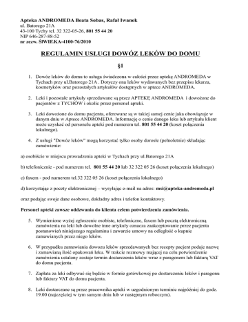 Apteka ANDROMEDA Beata Sobas, Rafał Iwanek ul. Batorego 21A 43-100 Tychy tel. 32 322-05-26, 801 55 44 20 NIP 646-287-88-52 nr zezw. ŚlWIF.KA-4100-76/2010 REGULAMIN USŁUGI DOWÓZ LEKÓW DO DOMU §1 1. Dowóz leków do domu to usługa świadczona w całości przez aptekę ANDROMEDA w Tychach przy ul.Batorego 21A . Dotyczy ona leków wydawanych bez przepisu lekarza, kosmetyków oraz pozostałych artykułów dostępnych w aptece ANDROMEDA. 2. Leki i pozostałe artykuły sprzedawane są przez APTEKĘ ANDROMEDA i dowożone do pacjentów z TYCHÓW i okolic przez personel apteki. 3. Leki dowożone do domu pacjenta, oferowane są w takiej samej cenie jaka obowiązuje w danym dniu w Aptece ANDROMEDA. Informację o cenie danego leku lub artykułu klient może uzyskać od personelu apteki pod numerem tel. 801 55 44 20 (koszt połączenia lokalnego). 4. Z usługi "Dowóz leków" mogą korzystać tylko osoby dorosłe (pełnoletnie) składając zamówienie: a) osobiście w miejscu prowadzenia apteki w Tychach przy ul.Batorego 21A b) telefonicznie - pod numerem tel. 801 55 44 20 lub 32 322 05 26 (koszt połączenia lokalnego) c) faxem - pod numerem tel.32 322 05 26 (koszt połączenia lokalnego) d) korzystając z poczty elektronicznej – wysyłając e-mail na adres: [email protected] oraz podając swoje dane osobowe, dokładny adres i telefon kontaktowy. Personel apteki zawsze oddzwania do klienta celem potwierdzenia zamówienia. 5. Wymienione wyżej zgłoszenie osobiste, telefoniczne, faxem lub pocztą elektroniczną zamówienia na leki lub dowolne inne artykuły oznacza zaakceptowanie przez pacjenta postanowień niniejszego regulaminu i zawarcie umowy na odległość o kupnie zamawianych przez niego leków. 6. W przypadku zamawiania dowozu leków sprzedawanych bez recepty pacjent podaje nazwę i zamawianą ilość opakowań leku. W trakcie rozmowy mającej na celu potwierdzenie zamówienia ustalony zostaje termin dostarczenia leków wraz z paragonem lub fakturą VAT do domu pacjenta. 7. Zapłata za leki odbywać się będzie w formie gotówkowej po dostarczeniu leków i paragonu lub faktury VAT do domu pacjenta. 8. Leki dostarczane są przez pracownika apteki w uzgodnionym terminie najpóźniej do godz. 19.00 (najczęściej w tym samym dniu lub w następnym roboczym). 9. Dojazd do domu pacjenta w rejonie do 15 km (odległość liczona w jedną stronę) od siedziby apteki odbywa się GRATIS (pacjent nie ponosi żadnej dodatkowej opłaty). Za każdy dodatkowy 1 km powyżej 15 km apteka pobiera opłatę w wys. 1,00- zł netto (1,23 zł brutto). 10. Apteka zastrzega sobie prawo odmowy przyjęcia zamówienia i dowozu leków. 11. Każde zamówienie jest rozpatrywane indywidualnie. W przypadku wartości zamówienia powyżej 150,00- zł brutto pacjent ma prawo negocjować cenę danego produktu. 12. Na wszystkie pytania i wątpliwości pacjentów odpowiadamy pod numerem tel.: 801 55 44 20. §2 - ZWROTY 1. Kupujący ma prawo odstąpienia od umowy sprzedaży i zwrócenia zakupionego towaru bez podania przyczyny w terminie 10 dni od otrzymania przesyłki, zgodnie z Dz. U. nr 22 poz. 271 z późniejszymi zmianami z dnia 2 marca 2000 r. O ochronie praw konsumentów. 2. Zgodnie z ustawą z dnia 6 września 2001 r. Prawo farmaceutyczne Art. 96. (Dz. U. nr 126 poz. 1381 z późniejszymi zmianami): Produkty lecznicze i wyroby medyczne wydane z apteki nie podlegają zwrotowi. Przepis ten nie dotyczy produktu leczniczego lub wyrobu medycznego zwracanego aptece z powodu wady jakościowej lub niewłaściwego wydania. 3. Zwracany towar nie może być używany, ani uszkodzony. Musi posiadać oryginalne, nienaruszone opakowanie z serią i datą ważności zgodną z fakturą zakupu. 4. Zwracany towar wraz dołączoną fakturą VAT lub paragonem oraz pisemnym uzasadnieniem zwrotu należy przesłać na własny koszt lub dostarczyć osobiście na adres: APTEKA ANDROMEDA UL . Batorego 21A 43-100 TYCHY 5. Zwracany towar musi być zapakowany w sposób gwarantujący jego bezpieczny transport. 6. Inna forma zwrotu nie będzie rozpatrywana przez Aptekę. 7. Po otrzymaniu Państwa zwrotu, stwierdzeniu jego prawidłowej zawartości oraz pozytywnym rozpatrzeniu uzasadnienia zwrotu gwarantujemy zwrot kwoty zakupu. Zwrot należności za towar nastąpi w ciągu 5 dni roboczych od daty otrzymania towaru przelewem pieniężnym na wskazane konto bankowe, przelewem pocztowym na wskazany adres lub gotówką do rąk własnych osoby, która dokonała zakupu. 8. Koszty dostawy i odesłania towaru nie podlegają zwrotowi. §3 - REKLAMACJE 1. Towary dostępne w Aptece ANDROMEDA objęte są gwarancją producenta. 2. Każda reklamacja klienta rozpatrywana jest indywidualnie w terminie max. 14 dni roboczych od jej zgłoszenia. 3. Pozytywne rozpatrzenie reklamacji jest równoznaczne z wymianą towaru na nowy lub zwrotem kwoty równej cenie towaru na wskazane przez Państwo konto bankowe, przekazem pieniężnym na podany adres lub gotówką do rąk własnych osoby, która dokonała zakupu.
