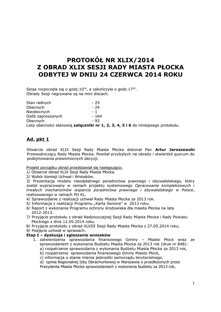 PROTOKÓŁ NR XLIX/2014 Z OBRAD XLIX SESJI RADY MIASTA PŁOCKA ODBYTEJ W DNIU 24 CZERWCA 2014 ROKU Sesja rozpoczęła się o godz.1010, a zakończyła o godz.1720. Obrady Sesji nagrywane są na mini discach. Stan radnych - 25 Obecnych - 24 Nieobecnych -1 Osób zaproszonych - 164 Obecnych - 93 Listy obecności stanowią załączniki nr 1, 2, 3, 4, 5 i 6 do niniejszego protokołu. Ad. pkt 1 Otwarcia obrad XLIX Sesji Rady Miasta Płocka dokonał Pan Artur Jaroszewski Przewodniczący Rady Miasta Płocka. Powitał przybyłych na obrady i stwierdził quorum do podejmowania prawomocnych decyzji. Projekt porządku obrad przedstawiał się następująco: 1/ Otwarcie obrad XLIX Sesji Rady Miasta Płocka. 2/ Wybór Komisji Uchwał i Wniosków. 3/ Prezentacja modelu nieodpłatnego poradnictwa prawnego i obywatelskiego, który został wypracowany w ramach projektu systemowego Opracowanie kompleksowych i trwałych mechanizmów wsparcia poradnictwa prawnego i obywatelskiego w Polsce, realizowanego w ramach PO KL. 4/ Sprawozdanie z realizacji uchwał Rady Miasta Płocka za 2013 rok. 5/ Informacja z realizacji Programu „Karta Seniora” w 2013 roku. 6/ Raport z wykonania Programu ochrony środowiska dla miasta Płocka na lata 2012-2013. 7/ Przyjęcie protokołu z obrad Nadzwyczajnej Sesji Rady Miasta Płocka i Rady Powiatu Płockiego z dnia 12.05.2014 roku. 8/ Przyjęcie protokołu z obrad XLVIII Sesji Rady Miasta Płocka z 27.05.2014 roku. 9/ Podjęcie uchwał w sprawach: Etap I – dyskusja i zgłaszanie wniosków 1. zatwierdzenia sprawozdania finansowego Gminy – Miasto Płock wraz ze sprawozdaniem z wykonania Budżetu Miasta Płocka za 2013 rok (druk nr 848): a) rozpatrzenie sprawozdania z wykonania Budżetu Miasta Płocka za 2013 rok, b) rozpatrzenie sprawozdania finansowego Gminy Miasto Płock, c) informacja o stanie mienia jednostki samorządu terytorialnego, d) opinia Regionalnej Izby Obrachunkowej w Warszawie o przedłożonych przez Prezydenta Miasta Płocka sprawozdaniach z wykonania budżetu za 2013 rok, 1 2. udzielenia absolutorium Prezydentowi Miasta Płocka z tytułu wykonania Budżetu Miasta Płocka za 2013 rok (druk nr 849): a) stanowisko Komisji Rewizyjnej w sprawie absolutorium dla Prezydenta Miasta Płocka za 2013 rok, b) opinia Regionalnej Izby Obrachunkowej w Warszawie o przedłożonym przez Komisję Rewizyjną Rady Miasta Płocka wniosku w sprawie udzielenia absolutorium Prezydentowi Miasta, 3. zmiany Wieloletniej Prognozy Finansowej Gminy – Miasto Płock na lata 2014-2030 (druk nr 855), 4. zmieniająca Uchwałę Budżetową Miasta Płocka na rok 2014 (druk 856), 5. zmiany Statutu Miejskiego Ośrodka Pomocy Społecznej w Płocku (druk nr 850), 6. zmiany Uchwały nr 352/XXIV/08 Rady Miasta Płocka z dnia 27 maja 2008 r. w sprawie ustalenia zasad sprzedaży lokali mieszkalnych będących własnością gminy, zmienionej Uchwałą Nr 360/XXV/08 Rady Miasta Płocka z dnia 24 czerwca 2008 r., Uchwałą Nr 818/LVII/10 Rady Miasta Płocka z dnia 28 września 2010r. oraz Uchwałą Nr 644/XXXVII/13 Rady Miasta Płocka z dnia 27 sierpnia 2013 r. (druk nr 851), 7. ustalenia regulaminu porządkowego Miejskiego Ogrodu Zoologicznego w Płocku (druk nr 852), 8. zmiany uchwały nr 487/XXIX/2012 Rady Miasta Płocka z dnia 27 listopada 2012 r. w sprawie określenia rozkładu godzin pracy aptek ogólnodostępnych na terenie Płocka (druk nr 853), 9. wyrażenia zgody na zamianę prawa własności nieruchomości o numerach ewidencyjnych 85/1 i 86 położonych przy ul. Jędrzejewo o łącznej pow. 1,9798 ha stanowiących własność osób prywatnych na nieruchomość położoną przy ul. Urodzajnej o numerze ewidencyjnym 87/3 o pow. 2,0178 ha stanowiącej własność Gminy – Miasto Płock (druk nr 854), 10. Miejscowego planu zagospodarowania przestrzennego „Trzepowo” w Płocku (druk nr 857). Etap II – głosowanie nad zgłoszonymi wnioskami i projektami uchwał 10/ Sprawozdanie Prezydenta Miasta Płocka z pracy między Sesjami Rady Miasta Płocka. 11/ Sprawozdanie Przewodniczącego Rady Miasta Płocka z pracy między Sesjami Rady Miasta Płocka. 12/ Interpelacje i zapytania radnych. 13/ Odpowiedzi na interpelacje. 14/ Sprawy różne. 15/ Zamknięcie obrad XLIX Sesji Rady Miasta Płocka. Pan Artur Jaroszewski Przewodniczący Rady Miasta Płocka powiedział: „[...] Szanowni Państwo, nim zaczniemy realizację porządku obrad, smutna chwila. Kilka dni temu zmarła Pani redaktor Magdalena Walewska – Randak. Zeszła niespodziewanie i zdecydowanie przedwcześnie. Pasjonatka dziennikarstwa. Przez blisko dwadzieścia lat współtworzyła płocką telewizję. Bardzo często pracowała również w ratuszowej auli. Wielokrotnie była obecna na sesjach Rady Miasta. Uśmiechnięta, sympatyczna, pełna kultury osobistej. Trudno wyobrazić sobie lokalne programy telewizyjne bez Magdy. Była nie tylko dziennikarzem. Była również społecznikiem, między innymi kwestarzem akcji ratowania Płockich Powązek. Nie była obojętna na to, co dzieje się w Płocka. Mówiła i myślała o swoim rodzinnym mieście również przez pryzmat swojej córki Kingi, którą osierociła. Miała zaledwie 44 lata. Szanowni Państwo, odszedł człowiek dobry. Uczcijmy pamięć Pani redaktor Magdy Walewskiej - Randak minutą ciszy.[...]” 2 Ad. pkt 2 Do składu Komisji Uchwał i Wniosków zostali zaproponowani: Pani radna Grażyna Cieślik (zgłoszenia dokonał Pan radny Paweł Kolczyński), Pan radny Artur Kras (zgłoszenia dokonał Pan radny Grzegorz Lewicki). Zgłoszeni radni wyrazili zgodę na kandydowanie do składu Komisji Uchwał i Wniosków. Wynik głosowania: za – 12, 0 - przeciw, 0 - wstrzymujących. Pan Artur Jaroszewski Przewodniczący Rady Miasta Płocka powiedział: „[...] Szanowni Państwo, prosiłbym o powtórzenie tego głosowania. Ja na przykład zauważyłem, że moja aparatura była w tym głosowaniu niesprawna. Jednocześnie prosiłbym Państwa o naciśnięcie obydwu guzików. Ponawiamy głosowanie.