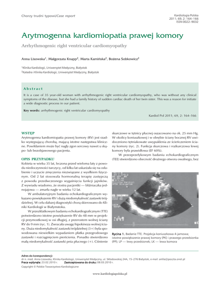 Kardiologia Polska 2011; 69, 2: 164–166 ISSN 0022–9032 Chorzy trudni typowi/Case report Arytmogenna kardiomiopatia prawej komory Arrhythmogenic right ventricular cardiomyopathy Anna Lisowska1, Małgorzata Knapp2, Marta Kamińska2, Bożena Sobkowicz2 1Klinika Kardiologii, Uniwersytet Medyczny, Białystok 2Katedra i Klinika Kardiologii, Uniwersytet Medyczny, Białystok Abstract It is a case of 35 year-old woman with arrhythmogenic right ventricular cardiomyopathy, who was without any clinical symptoms of the disease, but she had a family history of sudden cardiac death of her twin sister. This was a reason for initiate a wide diagnostic process in our patient. Key words: arrhythmogenic right ventricular cardiomyopathy Kardiol Pol 2011; 69, 2: 164–166 WSTĘP Arytmogenna kardiomiopatia prawej komory (RV) jest rzadko występującą chorobą, mającą istotne następstwa kliniczne. Powikłaniem może być nagły zgon sercowy nawet u skąpo- lub bezobjawowego pacjenta. OPIS PRZYPADKU Kobieta w wieku 35 lat, leczona przed wieloma laty z powodu niedoczynności tarczycy, od kilku lat uskarżała się na osłabienie i uczucie zmęczenia niezwiązane z wysiłkiem fizycznym. Od 2 lat stosowała hormonalną terapię zastępczą z powodu przedwczesnego wygaśnięcia funkcji jajników. Z wywiadu wiadomo, że siostra pacjentki — bliźniaczka jednojajowa — zmarła nagle w wieku 12 lat. W ambulatoryjnym badaniu echokardiograficznym wykazano powiększenie RV i dużą niedomykalność zastawki trójdzielnej. W celu dalszej diagnostyki chorą skierowano do Kliniki Kardiologii w Białymstoku. W przezklatkowym badaniu echokardiograficznym (TTE) potwierdzono istotne powiększenie RV do 48 mm w projekcji przymostkowej w osi długiej, z przerostem wolnej ściany RV do 9 mm (ryc. 1). Zwracała uwagę hipokineza wolnej ściany. Duża niedomykalność zastawki trójdzielnej (3+) była spowodowana niewielkim wypadaniem płatka przegrodowego zastawki i rozciągnięciem pierścienia. Ponadto stwierdzono małą niedomykalność zastawki pnia płucnego (+). Ciśnienie skurczowe w tętnicy płucnej oszacowano na ok. 25 mm Hg. W okolicy koniuszkowej i w obrębie ściany bocznej RV uwidoczniono tętniakowate uwypuklenia ze ścieńczeniem ściany komory (ryc. 2). Funkcja skurczowa i rozkurczowa lewej komory była prawidłowa (EF 60%). W przezprzełykowym badaniu echokardiograficznym (TEE) stwierdzono obecność drożnego otworu owalnego, bez Rycina 1. Badanie TTE. Projekcja koniuszkowa 4-jamowa; istotne powiększenie prawej komory (PK) i prawego przedsionka (PP); LP — lewy przedsionek; LK — lewa komora Adres do korespondencji: dr n. med. Anna Lisowska, Klinika Kardiologii, Uniwersytet Medyczny, ul. Skłodowskiej 24A, 15–276 Białystok, e-mail: [email protected] Praca wpłynęła: 23.02.2010 r. Zaakceptowana do druku: 08.03.2010 r. Copyright © Polskie Towarzystwo Kardiologiczne www.kardiologiapolska.pl 165 Arytmogenna kardiomiopatia prawej komory Rycina 2. Badanie TTE. Projekcja koniuszkowa 4-jamowa zmodyfikowana; zrotowana na prawą komorę (PK); w obszarze koniuszka PK widoczne tętniakowate uwypuklenie ściany (strzałki); PP — prawy przedsionek; LK — lewa komora; LP — lewy przedsionek Rycina 3. Badanie TEE. Projekcja pośrednia, kąt 59o; prawidłowa morfologia zastawki trójdzielnej (strzałki); PP — prawy przedsionek; PK — prawa komora znaczenia hemodynamicznego, i potwierdzono obecność istotnej niedomykalności zastawki trójdzielnej. Całość obrazu nie tłumaczyła znacznego powiększenia RV i nieprawidłowości morfologicznych w jej budowie (ryc. 3). Z podejrzeniem arytmogennej kardiomiopatii RV pacjentkę skierowano na rezonans magnetyczny serca, który potwierdził wstępne rozpoznanie. Ze względu na obciążony wywiad rodzinny oraz zaburzenia rytmu i przewodzenia (epizody niepodtrzymującego się częstoskurczu komorowego, epizody bloku przedsionkowo-komorowego II° w 24-godzinnej rejestracji EKG metodą Holtera) pacjentce implantowano kardiowerter-defibrylator w ramach prewencji pierwotnej nagłego zgonu sercowego. morfologii i czynności RV z powodu jej geometrii jest ograniczona — u opisywanej chorej zmiany morfologiczne w obrębie ściany RV były ograniczone i łatwe do przeoczenia w standardowej TTE — uwidoczniono je dopiero w zmodyfikowanych projekcjach koniuszkowych. U 85% pacjentów stwierdza się obniżenie frakcji wyrzutowej prawej komory (RVEF < < 50%), która odznacza się 73-procentową czułością i 95-procentową swoistością w rozpoznanwaniu ARVC [3]. Jednak ze względu na złożoną budowę RV precyzyjna ocena EF w badaniu echokardiograficznym będzie możliwa z chwilą upowszechnienia echokardiografii trójwymiarowej. W echokardiograficznej ocenie funkcji skurczowej RV pomocne są zarówno dopler tkankowy, jak i parametry odkształcania RV (strain). Według Prakasa i wsp. [5] maksymalna prędkość skurczowa mięśnia RV < 7,5 cm/s oraz szczytowy strain < 18% najlepiej identyfikują uszkodzenie RV w przebiegu ARVC. Do niedawna niepodważalne kryterium diagnostyczne ARVC, czyli obecność tkanki tłuszczowej w ścianie RV stwierdzona na podstawie rezonansu magnetycznego, jest obarczone ryzykiem rozpoznań fałszywie dodatnich (trudności w różnicowaniu miedzy fizjologicznym tłuszczem osierdziowym a podnasierdziowymi obszarami mięśnia komory). Również negatywny wynik biopsji mięśnia nie wyklucza choroby ze względu na ogniskowy charakter zmian w RV [6]. Jeśli chodzi o postawienie diagnozy w opisywanym przypadku, to były spełnione warunki: 1 duże kryterium diagnostyczne — istotne powiększenie RV i upośledzenie jej funkcji skurczowej oraz tętniaki RV, oraz 2 małe kryteria — przedwczesny nagły zgon (< 35. rż.) w rodzinie oraz epizody nieutrwalonego częstoskurczu komorowego o morfologii bloku lewej odnogi pęczka Hisa stwierdzone w 24-godzinnym monitorowaniu EKG metodą Holtera. Ważna jest również diagnostyka różnicowa — u opisanej ch