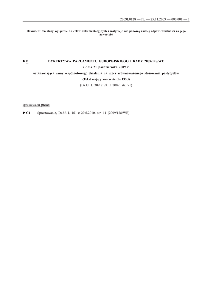 2009L0128 — PL — 25.11.2009 — 000.001 — 1 Dokument ten służy wyłącznie do celów dokumentacyjnych i instytucje nie ponoszą żadnej odpowiedzialności za jego zawartość ►B DYREKTYWA PARLAMENTU EUROPEJSKIEGO I RADY 2009/128/WE z dnia 21 października 2009 r. ustanawiająca ramy wspólnotowego działania na rzecz zrównoważonego stosowania pestycydów (Tekst mający znaczenie dla EOG) (Dz.U. L 309 z 24.11.2009, str. 71) sprostowana przez: ►C1 Sprostowanie, Dz.U. L 161 z 29.6.2010, str. 11 (2009/128/WE) 2009L0128 — PL — 25.11.2009 — 000.001 — 2 ▼B DYREKTYWA PARLAMENTU EUROPEJSKIEGO I RADY 2009/128/WE z dnia 21 października 2009 r. ustanawiająca ramy wspólnotowego działania zrównoważonego stosowania pestycydów na rzecz (Tekst mający znaczenie dla EOG) PARLAMENT EUROPEJSKI I RADA UNII EUROPEJSKIEJ, uwzględniając Traktat ustanawiający w szczególności jego art. 175 ust. 1, Wspólnotę Europejską, uwzględniając wniosek Komisji, uwzględniając opinię Europejskiego Komitetu Ekonomiczno-Społecz nego (1), uwzględniając opinię Komitetu Regionów (2), stanowiąc zgodnie z procedurą określoną w art. 251 Traktatu (3), a także mając na uwadze, co następuje: (1) Zgodnie z art. 2 i 7 decyzji nr 1600/2002/WE Parlamentu Euro pejskiego i Rady z dnia 22 lipca 2002 r. ustanawiającej szósty wspólnotowy program działań w zakresie środowiska natural nego (4) należy ustanowić wspólne ramy prawne dla zapewnienia zrównoważonego stosowania pestycydów, biorąc pod uwagę podejście zapobiegawcze i profilaktyczne. (2) Niniejsza dyrektywa powinna mieć obecnie zastosowanie do pestycydów, które są środkami ochrony roślin. Przewidziane jest jednak rozszerzenie w przyszłości zakresu zastosowania niniejszej dyrektywy o produkty biobójcze. (3) Środki przewidziane w niniejszej dyrektywie powinny mieć charakter uzupełniający i nie powinny wpływać na środki prze widziane w innych powiązanych przepisach prawnych Wspól noty, w szczególności w dyrektywie Rady 79/409/EWG z dnia 2 kwietnia 1979 r. w sprawie ochrony dzikiego ptactwa (5), dyrektywie Rady 92/43/EWG z dnia 21 maja 1992 r. w sprawie ochrony siedlisk przyrodniczych oraz dzikiej fauny i flory (6), dyrektywie 2000/60/WE Parlamentu Europejskiego i Rady z dnia 23 października 2000 r. ustanawiającej ramy wspólnotowego działania w dziedzinie polityki wodnej (7), rozpo rządzeniu (WE) nr 396/2005 Parlamentu Europejskiego i Rady (1) Dz.U. C 161 z 13.7.2007, s. 48. (2) Dz.U. C 146 z 30.6.2007, s. 48. (3) Opinia Parlamentu Europejskiego z dnia 23 października 2007 r. (Dz.U. C 263 E z 16.10.2008, s. 158), wspólne stanowisko Rady z dnia 19 maja 2008 r. (Dz.U. C 254 E z 7.10.2008, s. 1) i stanowisko Parlamentu Euro pejskiego z dnia 13 stycznia 2009 r. (dotychczas nieopublikowane w Dzienniku Urzędowym). Decyzja Rady z dnia 24 września 2009 r. (4) Dz.U. L 242 z 10.9.2002, s. 1. (5) Dz.U. L 103 z 25.4.1979, s. 1. (6) Dz.U. L 206 z 22.7.1992, s. 7. (7) Dz.U. L 327 z 22.12.2000, s. 1. 2009L0128 — PL — 25.11.2009 — 000.001 — 3 ▼B z dnia 23 lutego 2005 r. w sprawie najwyższych dopuszczalnych poziomów pozostałości pestycydów w żywności i paszy pocho dzenia roślinnego i zwierzęcego oraz na ich powierzchni (1) oraz rozporządzeniu Parlamentu Europejskiego i Rady (WE) nr 1107/2009 z dnia 21 października 2009 r. w sprawie wprowa dzania do obrotu środków ochrony roślin (2). Środki te nie powinny również stanowić uszczerbku dla środków podejmowa nych dobrowolnie w kontekście rozporządzeń dotyczących funduszy strukturalnych lub rozporządzenia Rady (WE) nr 1698/2005 z dnia 20 września 2005 r. w sprawie wsparcia rozwoju obszarów wiejskich przez Europejski Fundusz Rolny na rzecz Rozwoju Obszarów Wiejskich (EFRROW) (3). (4) Instrumenty ekonomiczne mogą odegrać kluczową rolę w osiągnięciu celów związanych ze zrównoważonym stosowa niem pestycydów. Należy zatem zachęcać do stosowania takich instrumentów na odpowiednim szczeblu, z jednoczesnym położe niem nacisku na to, że poszczególne państwa członkowskie mogą postanowić o ich stosowaniu bez uszczerbku dla stosowania prze pisów dotyczących pomocy państwa. (5) By ułatwić wprowadzanie niniejszej dyrektywy, państwa człon kowskie powinny stosować krajowe plany działania mające na celu ustalenie celów ilościowych, środków, miar, harmono gramów i wskaźników zmierzających do zmniejszenia zagrożenia związanego ze stosowaniem pestycydów i wpływu ich stoso wania na zdrowie ludzi i na środowisko oraz zachęcanie do opracowania i stosowania integrowanej ochrony roślin i alternatywnych podejść lub technik mających na celu zmniej szenie zależności od stosowania pestycydów. Państwa członkow skie powinny monitorować stosowanie środków ochrony roślin zawierających substancje czynne budzące szczególne obawy oraz stworzyć harmonogramy i wyznaczyć cele dotyczące zmniej szenia ich stosowania, zwłaszcza w przypadkach gdy jest to odpowiedni sposób na osiągnięcie celów dotyczących zmniej szenia zagrożenia. Krajowe plany działania powinny być skoor dynowane z planami wdrożenia zgodnymi z innymi stosownymi przepisami prawnymi Wspólnoty i mogłyby posłużyć do zgrupo wania celów, jakie mają zostać osiągnięte zgodnie z innymi prze pisami prawnymi Wspólnoty odnoszącymi się do pestycydów. (6) Wymiana informacji dotyczących celów i działań państw człon kowskich, ustalonych w ramach krajowych planów działania, jest bardzo ważnym elementem realizacji celów niniejszej dyrektywy. Zasadne jest więc żądanie, by państwa członkowskie składały Komisji i innym państwom członkowskim regularne sprawozda nia, w szczególności na temat wprowadzania i rezultatów krajo wych planów działania oraz swoich doświadczeń. W oparciu o informacje przekazywane przez państwa członkowskie Komisja powinna przedstawiać Parlamentowi Europejskiemu i Radzie odnośne sprawozdan