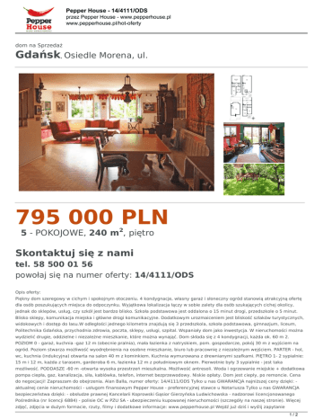 Pepper House - 14/4111/ODS przez Pepper House - www.pepperhouse.pl www.pepperhouse.pl/hot-oferty dom na Sprzedaż Gdańsk, Osiedle Morena, ul. 795 000 PLN 5 - POKOJOWE, 240 m2, piętro Skontaktuj się z nami tel. 58 500 01 56 powołaj się na numer oferty: 14/4111/ODS Opis oferty: Piękny dom szeregowy w cichym i spokojnym otoczeniu. 4 kondygnacje, własny garaż i słoneczny ogród stanowią atrakcyjną ofertę dla osób poszukujących miejsca do odpoczynku. Wyjątkowa lokalizacja łączy w sobie zalety dla osób szukających cichej okolicy, jednak do sklepów, usług, czy szkół jest bardzo blisko. Szkoła podstawowa jest oddalona o 15 minut drogi, przedszkole o 5 minut. Blisko sklepy, komunikacja miejska i główne drogi komunikacyjne. Dodatkowym urozmaiceniem jest bliskość szlaków turystycznych, widokowych i dostęp do lasu.W odległości jednego kilometra znajdują się 3 przedszkola, szkoła podstawowa, gimnazjum, liceum, Politechnika Gdańska, przychodnia zdrowia, poczta, sklepy, usługi, szpital. Wspaniały dom jako inwestycja. W nieruchomości można wydzielić drugie, oddzielne i niezależne mieszkanie, które można wynająć. Dom składa się z 4 kondygnacji, każda ok. 60 m 2. POZIOM 0 - garaż, kuchnia -gaz 12 m (obecnie pralnia), mała łazienka z natryskiem, pom. gospodarcze, pokój 30 m z wyjściem na ogród. Poziom stwarza możliwość wyodrębnienia na osobne mieszkanie, biuro lub pracownię z niezależnym wejściem. PARTER - hol, wc, kuchnia (indukcyjna) otwarta na salon 40 m z kominkiem. Kuchnia wymurowana z drewnianymi szafkami. PIĘTRO 1- 2 sypialnie: 15 m i 12 m, każda z tarasem, garderoba 6 m, łazienka 12 m z południowym oknem. Pierwotnie były 3 sypialnie - jest taka możliwość. PODDASZE -60 m -otwarta wysoka przestrzeń mieszkalna. Możliwość antresoli. Woda i ogrzewanie miejskie + dodatkowa pompa ciepła, gaz, kanalizacja, siła, kablówka, telefon, internet bezprzewodowy. Niskie opłaty. Dom jest ciepły, po remoncie. Cena do negocjacji! Zapraszam do obejrzenia. Alan Balla, numer oferty: 14/4111/ODS Tylko u nas GWARANCJA najniższej ceny dzięki: aktualnej cenie nieruchomości - usługom finansowym Pepper House - preferencyjnej stawce u Notariusza Tylko u nas GWARANCJA bezpieczeństwa dzięki: - obsłudze prawnej Kancelarii Koprowski Gąsior Gierzyńska Ludwichowska - nadzorowi licencjonowanego Pośrednika (nr licencji 6884) - polisie OC w PZU SA - ubezpieczeniu kupowanej nieruchomości (szczegóły na naszej stronie). Więcej zdjęć, zdjęcia w dużym formacie, rzuty, filmy i dodatkowe informacje: www.pepperhouse.pl Wejdź już dziś i wyślij zapytanie 1/2 Pepper House - 14/4111/ODS przez Pepper House - www.pepperhouse.pl www.pepperhouse.pl/hot-oferty bezpośrednio z naszej strony. 2/2 Powered by TCPDF (www.tcpdf.org)