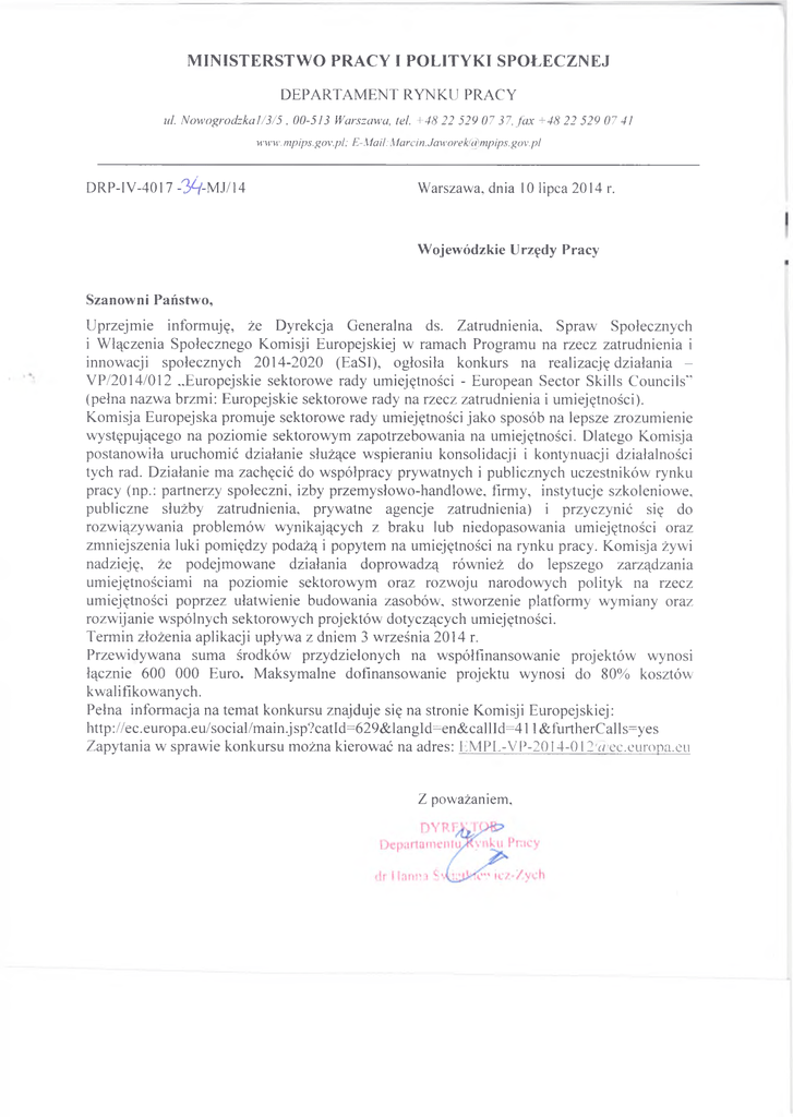 MINISTERSTWO PRACY I POLITYKI SPOŁECZNEJ D EPARTAM EN T RYNKU PRACY ul. Nowogrodzka 1/3/5 , 00-513 Warszawa, tel. +48 22 529 07 37, fa x +48 22 529 07 41 www.mpips.gov.pl; E-Mail¡Marcin. [email protected] D RP-IV -4017-34-M J/14 Warszawa, dnia 10 lipca 2014 r. Wojewódzkie Urzędy Pracy Szanowni Państwo, U przejm ie inform uję, że Dyrekcja G eneralna ds. Zatrudnienia, Spraw Społecznych i W łączenia Społecznego Komisji Europejskiej w ramach Program u na rzecz zatrudnienia i innowacji społecznych 2014-2020 (EaSI), ogłosiła konkurs na realizację działania V P/2014/012 „Europejskie sektorowe rady umiejętności - European Sector Skills C ouncils'’ (pełna nazw a brzmi: Europejskie sektorowe rady na rzecz zatrudnienia i um iejętności). Kom isja Europejska prom uje sektorow e rady um iejętności jako sposób na lepsze zrozum ienie w ystępującego na poziom ie sektorowym zapotrzebow ania na um iejętności. Dlatego Kom isja postanow iła uruchom ić działanie służące w spieraniu konsolidacji i kontynuacji działalności tych rad. D ziałanie ma zachęcić do w spółpracy pryw atnych i publicznych uczestników rynku pracy (np.: partnerzy społeczni, izby przem ysłow o-handlow e, firm y, instytucje szkoleniowe, publiczne służby zatrudnienia, prywatne agencje zatrudnienia) i przyczynić się do rozw iązyw ania problem ów wynikających z braku lub niedopasow ania um iejętności oraz zm niejszenia luki pom iędzy podażą i popytem na umiejętności na rynku pracy. K om isja żywi nadzieję, że podejm ow ane działania doprow adzą rów nież do lepszego zarządzania um iejętnościam i na poziom ie sektorowym oraz rozw oju narodow ych polityk na rzecz um iejętności poprzez ułatw ienie budow ania zasobów , stw orzenie platform y w ym iany oraz rozw ijanie w spólnych sektorow ych projektów dotyczących umiejętności. Term in złożenia aplikacji upływ a z dniem 3 w rześnia 2014 r. Przew idyw ana sum a środków przydzielonych na w spółfinansow anie projektów wynosi łącznie 600 000 Euro. M aksymalne dofinansow anie projektu wynosi do 80% kosztów kw alifikowanych. Pełna inform acja na tem at konkursu znajduje się na stronie Komisji Europejskiej: http://ec.europa.eu/social/m ain.jsp?catId=629& langId=en& callId=41 l& furtherC alls=yes Zapytania w spraw ie konkursu m ożna kierować na adres: EMPL-V P -2 0 14-012'c7iec.europa.eu Z poważaniem,