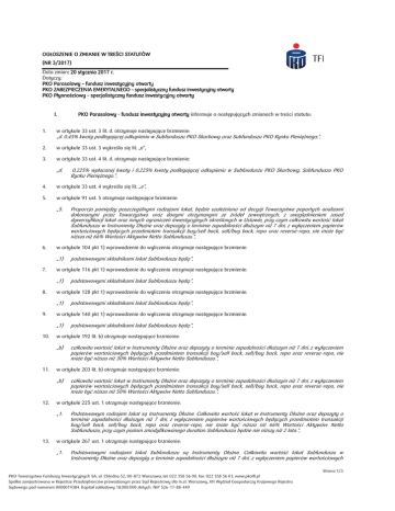 OGŁOSZENIE O ZMIANIE W TREŚCI STATUTÓW (NR 3/2017) Data zmian: 20 stycznia 2017 r. Dotyczy: PKO Parasolowy – fundusz inwestycyjny otwarty PKO ZABEZPIECZENIA EMERYTALNEGO – specjalistyczny fundusz inwestycyjny otwarty PKO Płynnościowy – specjalistyczny fundusz inwestycyjny otwarty I. 1. PKO Parasolowy - fundusz inwestycyjny otwarty informuje o następujących zmianach w treści statutu: w artykule 33 ust. 3 lit. d. otrzymuje następujące brzmienie: „d. 0,45% kwoty podlegającej odkupieniu w Subfunduszu PKO Skarbowy oraz Subfunduszu PKO Rynku Pieniężnego;”, 2. w artykule 33 ust. 3 wykreśla się lit. „e”, 3. w artykule 33 ust. 4 lit. d. otrzymuje następujące brzmienie: „d. 0,225% wpłacanej kwoty i 0,225% kwoty podlegającej odkupieniu w Subfunduszu PKO Skarbowy, Subfunduszu PKO Rynku Pieniężnego.”, 4. w artykule 33 ust. 4 wykreśla się lit. „e”, 5. w artykule 91 ust. 5 otrzymuje następujące brzmienie: „5. 6. w artykule 104 pkt 1) wprowadzenie do wyliczenia otrzymuje następujące brzmienie: „1) 7. całkowita wartość lokat w Instrumenty Dłużne oraz depozyty o terminie zapadalności dłuższym niż 7 dni, z wyłączeniem papierów wartościowych będących przedmiotem transakcji buy/sell back, sell/buy back, repo oraz reverse-repo, nie może być niższa niż 50% Wartości Aktywów Netto Subfunduszu.”, w artykule 225 ust. 1 otrzymuje następujące brzmienie: „1. 13. całkowita wartość lokat w Instrumenty Dłużne oraz depozyty o terminie zapadalności dłuższym niż 7 dni, z wyłączeniem papierów wartościowych będących przedmiotem transakcji buy/sell back, sell/buy back, repo oraz reverse-repo, nie może być niższa niż 30% Wartości Aktywów Netto Subfunduszu.”, w artykule 203 lit. b) otrzymuje następujące brzmienie: „b) 12. podstawowymi składnikami lokat Subfunduszu będą:”, w artykule 192 lit. b) otrzymuje następujące brzmienie: „b) 11. podstawowymi składnikami lokat Subfunduszu będą:”, w artykule 140 pkt 1) wprowadzenie do wyliczenia otrzymuje następujące brzmienie: „1) 10. podstawowymi składnikami lokat Subfunduszu będą:”, w artykule 128 pkt 1) wprowadzenie do wyliczenia otrzymuje następujące brzmienie: „1) 9. podstawowymi składnikami lokat Subfunduszu będą:”, w artykule 116 pkt 1) wprowadzenie do wyliczenia otrzymuje następujące brzmienie: „1) 8. Proporcja pomiędzy poszczególnymi rodzajami lokat, będzie uzależniona od decyzji Towarzystwa popartych analizami dokonanymi przez Towarzystwo oraz danymi otrzymanymi ze źródeł zewnętrznych, z uwzględnieniem zasad dywersyfikacji lokat oraz innych ograniczeń inwestycyjnych określonych w Ustawie, przy czym całkowita wartość lokat Subfunduszu w Instrumenty Dłużne oraz depozyty o terminie zapadalności dłuższym niż 7 dni, z wyłączeniem papierów wartościowych będących przedmiotem transakcji buy/sell back, sell/buy back, repo oraz reverse-repo, nie może być niższa niż 66% Wartości Aktywów Netto Subfunduszu.”, Podstawowym rodzajem lokat są Instrumenty Dłużne. Całkowita wartość lokat w Instrumenty Dłużne oraz depozyty o terminie zapadalności dłuższym niż 7 dni, z wyłączeniem papierów wartościowych będących przedmiotem transakcji buy/sell back, sell/buy back, repo oraz reverse-repo, nie może być niższa niż 66% Wartości Aktywów Netto Subfunduszu, przy czym poziom zmodyfikowanego duration Subfunduszu będzie nie niższy niż 2 lata.”, w artykule 267 ust. 1 otrzymuje następujące brzmienie: „1. Podstawowymi rodzajami lokat Subfunduszu są Instrumenty Dłużne. Całkowita wartość lokat Subfunduszu w Instrumenty Dłużne oraz depozyty o terminie zapadalności dłuższym niż 7 dni, z wyłączeniem papierów wartościowych Strona 1/3 PKO Towarzystwo Funduszy Inwestycyjnych SA, ul. Chłodna 52, 00-872 Warszawa; tel: 022 358 56 00, fax: 022 358 56 01; www.pkotfi.pl Spółka zarejestrowana w Rejestrze Przedsiębiorców prowadzonym przez Sąd Rejestrowy dla m.st. Warszawy, XII Wydział Gospodarczy Krajowego Rejestru Sądowego pod numerem 0000019384. Kapitał zakładowy 18.000.000 złotych. NIP 526-17-88-449 będących przedmiotem transakcji buy/sell back, sell/buy back, repo oraz reverse-repo, nie może być niższa niż 70% Wartości Aktywów Netto Subfunduszu.”, 14. w artykule 278 ust. 2 lit. b) otrzymuje następujące brzmienie: „b) 15. całkowita wartość lokat Subfunduszu w rodzaje lokat, o których mowa w ust. 1 powyżej, z wyłączeniem papierów wartościowych będących przedmiotem transakcji buy/sell back, sell/buy back, repo oraz reverse-repo, denominowane w dolarze amerykańskim nie może być niższa niż 50% Wartości Aktywów Netto Subfunduszu;”, w artykule 355 ust. 3 otrzymuje następujące brzmienie: „3. Proporcja pomiędzy poszczególnymi rodzajami lokat będzie uzależniona od decyzji Towarzystwa popartych analizami oraz danymi otrzymanymi ze źródeł zewnętrznych, z uwzględnieniem zasad dywersyfikacji lokat oraz innych ograniczeń inwestycyjnych określonych w Ustawie, przy czym całkowita wartość lokat Subfunduszu w kategorie lokat, o których mowa w ust. 1 lit. a) i b) oraz depozyty o terminie zapadalności dłuższym niż 7 dni, z wyłączeniem papierów wartościowych będących przedmiotem transakcji buy/sell back, sell/buy back, repo oraz reverse-repo, nie może być niższa niż 66% Wartości Aktywów Netto Subfunduszu.”. Zmiany statutu Funduszu, o których mowa powyżej wchodzą w życie w terminie 3 miesięcy od dnia ich ogłoszenia. II. 1. w artykule 58 ust. 1 lit. a otrzymuje następujące brzmienie: „a. 2. 3. 4. „a. całkowita wartość lokat Subfunduszu, o których mowa w ust. 1 lit. a może wynosić od 0 do 60% Wartości Aktywów Subfunduszu; b. całkowita wartość lokat Subfunduszu, o których mowa w ust. 1 lit. b może wynosić od 40 do 100% Wartości Aktywów Subfunduszu;”, w artykule 69 ust. 1 lit. a, b i d po określeniu „Wartości Aktyw