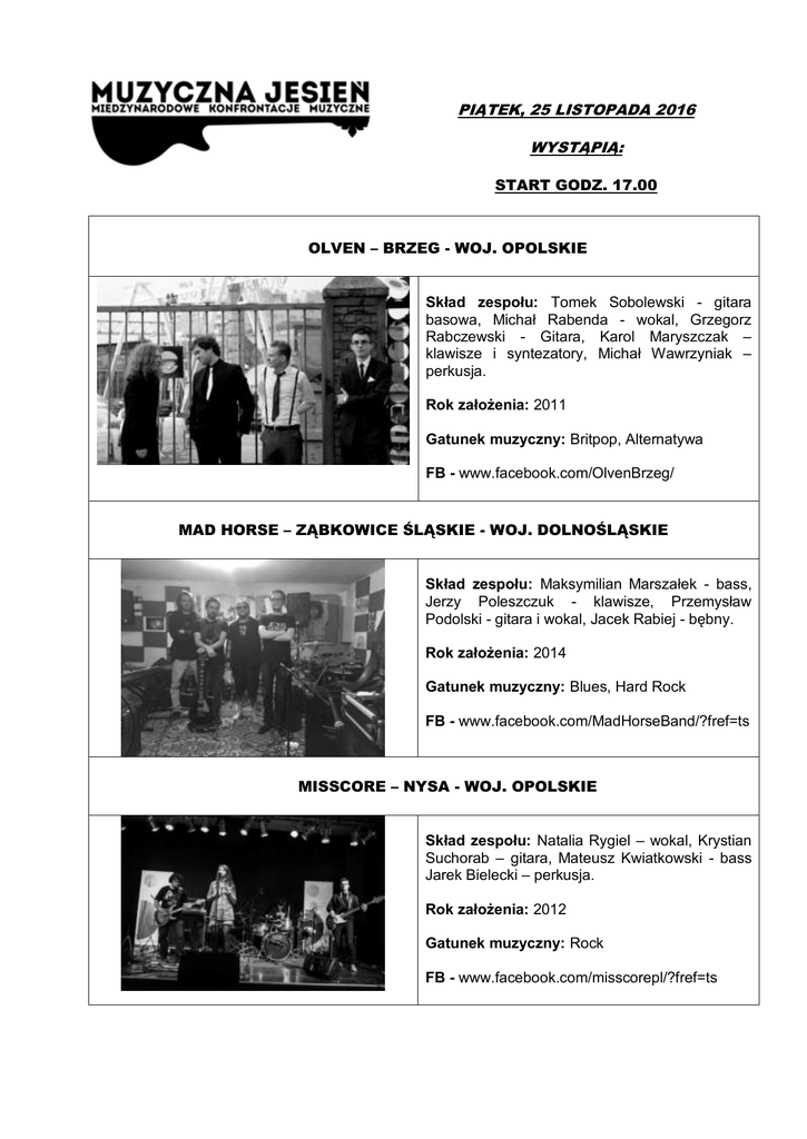 PIĄTEK, 25 LISTOPADA 2016 WYSTĄPIĄ: START GODZ. 17.00 OLVEN – BRZEG - WOJ. OPOLSKIE Skład zespołu: Tomek Sobolewski - gitara basowa, Michał Rabenda - wokal, Grzegorz Rabczewski - Gitara, Karol Maryszczak – klawisze i syntezatory, Michał Wawrzyniak – perkusja. Rok założenia: 2011 Gatunek muzyczny: Britpop, Alternatywa FB - www.facebook.com/OlvenBrzeg/ MAD HORSE – ZĄBKOWICE ŚLĄSKIE - WOJ. DOLNOŚLĄSKIE Skład zespołu: Maksymilian Marszałek - bass, Jerzy Poleszczuk - klawisze, Przemysław Podolski - gitara i wokal, Jacek Rabiej - bębny. Rok założenia: 2014 Gatunek muzyczny: Blues, Hard Rock FB - www.facebook.com/MadHorseBand/?fref=ts MISSCORE – NYSA - WOJ. OPOLSKIE Skład zespołu: Natalia Rygiel – wokal, Krystian Suchorab – gitara, Mateusz Kwiatkowski - bass Jarek Bielecki – perkusja. Rok założenia: 2012 Gatunek muzyczny: Rock FB - www.facebook.com/misscorepl/?fref=ts ATME – WROCŁAW – WOJ. DOLNOŚLĄSKIE Skład zespołu: Luke Paweloszek – wokal, Piotr Guliński – gitara, Adrian Nejman – bass, Paweł Zborowski – perkusja. Rok założenia: 2013 Gatunek muzyczny: Rock/Shamanic Rock Progressive FB - www.facebook.com/ATMEband/?fref=ts FALSE EXPERIENCE – KOŹMIN WIELKOPOLSKI – WOJ. WIELKOPOLSKIE Skład zespołu: Kamil Juskowiak - Bass, Paweł Zaworski - Gitara/wokal, Jędrzej Pryszcz Gitara, Krzysztof Nowacki – Perkusja. Rok założenia: 2014 Gatunek muzyczny: Hard Rock FB www.facebook.com/False-Experience815573335189302/ MOTOR IN CORN – ZBAKÓW DOLNY - WOJ. DOLNOŚLĄSKIE Skład zespołu: Łucja Skibniewska – wokal, Konrad Sztyma – gitara, Maciej Sztyma – bass, Damian Gregor – perkusja. Rok założenia: 2012 Gatunek muzyczny: Rock FB - https://www.facebook.com/MotorInCorn/ SCAR CRASH – KRAKÓW - WOJ. MAŁOPOLSKIE Skład zespołu: Szymon Toboła – wokal, Krzysztof Przywara – gitara, Piotr Żebrak – gitara, Daniel Kozioł – bass, Bartosz Pietrasik – perkusja. Rok założenia: 2011 Gatunek muzyczny: Rock, Hard Rock FB - www.facebook.com/sc4r.cr4sh/?fref=ts LOREM – SULMIERZYCE - WOJ. WIELKOPOLSKIE Skład zespołu: Jan Klupś – wokal/gitara prowadząca, Dawid Sekula – wokal/gitara solowa, Michał Bochniak - gitara basowa, Dawid Rettig - instrumenty klawiszowe, Bartosz Błaszczyk – perkusja, Krystian Błaszczyk – trąbka, Mateusz Kaczmarek – saksofon, Jakub Karpiński – puzon. Rok założenia: 2015 Gatunek muzyczny: Rock, Pop, Funky, R&B, Reggae FB - www.facebook.com/loremband/ MR SPARK – SOPOT – WOJ. POMORSKIE Mr. Spark, czyli Jarosław Jaśkiewicz z Sopotu to utalentowany wokalista grający na gitarze akustycznej, który porusza się w nurtach rockowych, bluesowych, pop i soul. FB - www.facebook.com/mr.spark.art/?fref=ts STRACH USZU – KRAKÓW - WOJ. MAŁOPOLSKIE Skład zespołu: Magdalena Matyka - wokal, Jakub Sznajder - bass, Kamil Chołyk - perkusja i Łukasz Mazur - gitara. Rok założenia: 2013 Gatunek muzyczny: Różnorodny, tworzy psychoteksty do psychomuzyki FB - www.facebook.com/strachuszu/ grupa CAN’T EXPLAIN – OSTROŁĘKA – WOJ. MAZOWIECKIE Skład zespołu: Jarek Ptak – gitara, Jarek Waszczyszyn – bass, Mateusz Sasin – perkusja. Rok założenia: 2015 Gatunek muzyczny: Rock, Electronic FB - www.facebook.com/cantexplainband/?fref=ts MASZYNA – KRAŚNIK – WOJ. LUBELSKIE Skład zespołu: Rafał Machulak - wokal, Mariusz Bochen gitara, Wiesław Szajewski - gitara, Paweł Kasprzak - bass, Krzysztof Blat – perkusja. Rok założenia: 2011 Gatunek muzyczny: Heavy Metal FB - www.facebook.com/Maszyna275342495916385/ SZA! – POZNAŃ - WOJ. WIELKOPOLSKIE Skład zespołu: Yomay – wokal, Asia Zielecka flety i elektronika, Marek Baczyński - gitary i klawiatury, Maciek Sztorc – bass, Tomek Wandel – perkusja. Rok założenia: 2011 Gatunek muzyczny: Jazz, Reggae, Alternatywa FB - www.facebook.com/ZespolSza/ SOBOTA, 26 LISTOPADA 2016 WYSTĄPIĄ: START GODZ. 17.00 GENTUZA – WROCŁAW - WOJ. DOLNOŚLĄSKIE Skład zespołu: Darek Podolak – gitara, Marcin Janusinski - wokal, Dawid Rydz - Perkusja. Rok założenia: 2016 Gatunek Postmetal muzyczny: Electronic, Djent, FB - www.facebook.com/gentuzaband/ IMPERATIVE – GLIWICE - WOJ. ŚLĄSKIE Skład zespołu: Mateusz Rechul - wokal, Michał Krzyszczak - gitara, Marcin Glanc perkusja, Łukasz Orlik - gitara basowa. Rok założenia: 2015 Gatunek muzyczny: Rock FB - www.facebook.com/ImperativeGliwice/ KAGYUMA – WROCŁAW – WOJ. DOLNOŚLĄSKIE Skład zespołu: Kamila Salach, Agata Majewska, Julia Kulpa, Marta Mackiewicz. Rok założenia: 2014 Gatunek muzyczny: Różnorodny FB - www.facebook.com/kagyuma/ BLACKBERRY BROTHERS – OLEŚNICA - WOJ. DOLNOŚLĄSKIE Skład zespołu: Krzysiek Borodziuk - instrumenty klawiszowe, Bartek Jeżyna - gitara, Kuba Jeżyna gitara, Hubert Kot - bass, Krystian Kot - perkusja, Mateusz Polański - wokal. Rok założenia: 2015 Gatunek muzyczny: Blues, Rock FB www.facebook.com/blackberrybrothers/?fref=ts PAULA PŁYWACZYK & MARIUSZ ŁĘCKI – OSTRÓW WIELKOPOLSKI - WOJ. WIELKOPOLSKIE Duet Paula Pływaczyk & Mariusz Łęcki funkcjonuje od lutego 2016 roku. Dwoje artystów z Ostrowa Wielkopolskiego prezentuję muzykę w nurtach rock, pop, blues, acoustic sound. FB www.facebook.com/plywaczykpaula/ LUPA – BIAŁYSTOK – WOJ. PODLASKIE Skład zespołu: Łukasz Wasilewski – wokal, Patryk Łuczyński – gitara elektryczna, Michał Mazur – gitara elektryczna, Filip Babicki – perkusja, Patryk Dziekoński – instrumenty klawiszowe, wokal oraz Marcin Klimuk – gitara basowa. Rok założenia: 2015 Gatunek muzyczny: Rock FB – www.facebook.com/lupa.bialystok/ VERMIS – ŁÓDŹ – WOJ. ŁÓDZKIE Skład zespołu: Greg Ramirez wokal, Bartłomiej Dulewicz - gitara rytmiczna/prowadząca/wokal, Mateusz Jeremus gitara rytmiczna/prowadząca, Mateusz Urbaniak - gitara basowa, Michał Wysocki - perkusja, Tomasz Wysocki Kapuczino. Rok założenia: 2015 Gatunek muzyczny: Metal FB – www.facebook.com/VermisBandLodz/ RAVEL – W