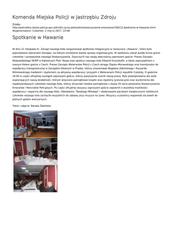 Komenda Miejska Policji w Jastrzębiu Zdroju Źródło: http://jastrzebie.slaska.policja.gov.pl/k10/z-zycia-jednostki/stowarzyszenie-emerytow/158212,Spotkanie-w-Hawanie.html Wygenerowano: Czwartek, 2 marca 2017, 22:08 Spotkanie w Hawanie W dniu 21 listopada br. Zarząd naszego Koła zorganizował spotkanie integracyjne w restauracji „Hawana”, które było poprzedzone zebraniem Zarządu, na którym omówiono ważne sprawy organizacyjne. W spotkaniu udział wzięło liczne grono członków i sympatyków naszego Stowarzyszenia. Zaszczycili nas swoją obecnością zaproszeni goście: Prezes Zarządu Wojewódzkiego SEiRP w Katowicach Piotr Stypa oraz opiekun naszego koła Edward Krzysztofik, a także zaprzyjaźnieni z naszym Kołem goście z Czech: Prezes Zarządu Weteranów Policji z Czech okręgu Śląsko–Morawskiego oraz koordynator do współpracy transgranicznej w Zarządzie Głównym w Pradze, którzy uhonorowali Bogdana Żabińskiego i Ryszarda Wiśniewskiego medalem i dyplomem za aktywną współpracę i przyjaźń z Weteranami Policji republiki Czeskiej. O godzinie 16.00 w części oficjalnej wystąpili zaproszeni goście, którzy pozytywnie ocenili naszą pracę. Były podziękowania dla osób wspierających naszą działalność, którym wręczono pamiątkowe książki oraz dyplomy gratulacyjne oraz wyróżnienia dla najaktywniejszych członków naszego Koła, którzy otrzymali medale pamiątkowe z okazji 25–lecia powstania Stowarzyszenia Emerytów i Rencistów Policyjnych. Po części oficjalnej wszyscy zaproszeni goście zapewnili o wszelkiej możliwości współpracy i wsparcia dla naszego Koła. Odwiedziny "Świętego Mikołaja" i obdarowanie paczkami świątecznymi niektórych członków naszego koła zachęciło wszystkich do zabawy przy muzyce na żywo. Wszyscy uczestnicy wspaniale się bawili do późnych godzin wieczornych. Tekst i zdjęcia: Renata Żabińska Ocena: 0/5 (0) Tweetnij