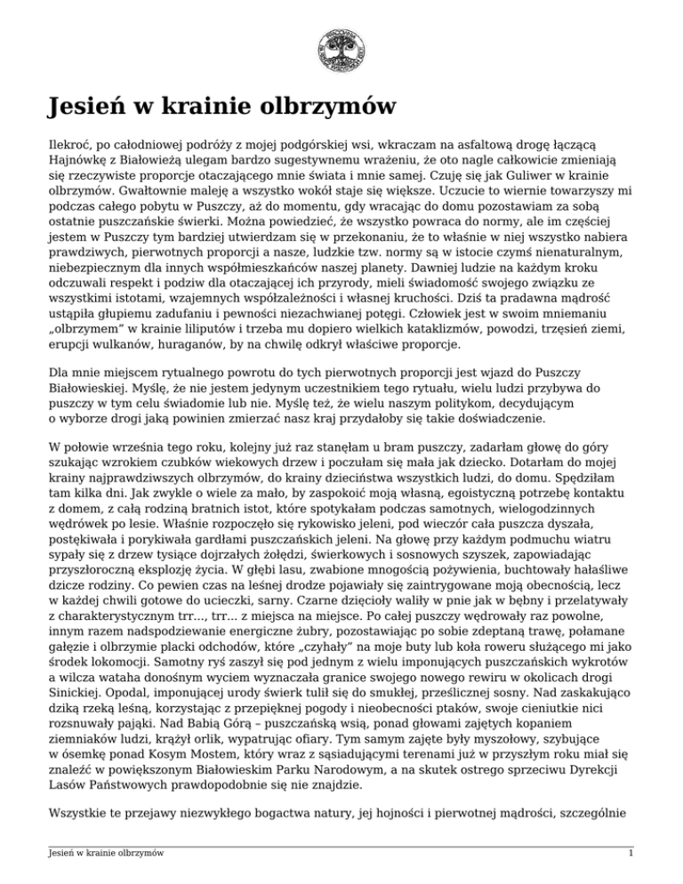 Jesień w krainie olbrzymów Ilekroć, po całodniowej podróży z mojej podgórskiej wsi, wkraczam na asfaltową drogę łączącą Hajnówkę z Białowieżą ulegam bardzo sugestywnemu wrażeniu, że oto nagle całkowicie zmieniają się rzeczywiste proporcje otaczającego mnie świata i mnie samej. Czuję się jak Guliwer w krainie olbrzymów. Gwałtownie maleję a wszystko wokół staje się większe. Uczucie to wiernie towarzyszy mi podczas całego pobytu w Puszczy, aż do momentu, gdy wracając do domu pozostawiam za sobą ostatnie puszczańskie świerki. Można powiedzieć, że wszystko powraca do normy, ale im częściej jestem w Puszczy tym bardziej utwierdzam się w przekonaniu, że to właśnie w niej wszystko nabiera prawdziwych, pierwotnych proporcji a nasze, ludzkie tzw. normy są w istocie czymś nienaturalnym, niebezpiecznym dla innych współmieszkańców naszej planety. Dawniej ludzie na każdym kroku odczuwali respekt i podziw dla otaczającej ich przyrody, mieli świadomość swojego związku ze wszystkimi istotami, wzajemnych współzależności i własnej kruchości. Dziś ta pradawna mądrość ustąpiła głupiemu zadufaniu i pewności niezachwianej potęgi. Człowiek jest w swoim mniemaniu „olbrzymem” w krainie liliputów i trzeba mu dopiero wielkich kataklizmów, powodzi, trzęsień ziemi, erupcji wulkanów, huraganów, by na chwilę odkrył właściwe proporcje. Dla mnie miejscem rytualnego powrotu do tych pierwotnych proporcji jest wjazd do Puszczy Białowieskiej. Myślę, że nie jestem jedynym uczestnikiem tego rytuału, wielu ludzi przybywa do puszczy w tym celu świadomie lub nie. Myślę też, że wielu naszym politykom, decydującym o wyborze drogi jaką powinien zmierzać nasz kraj przydałoby się takie doświadczenie. W połowie września tego roku, kolejny już raz stanęłam u bram puszczy, zadarłam głowę do góry szukając wzrokiem czubków wiekowych drzew i poczułam się mała jak dziecko. Dotarłam do mojej krainy najprawdziwszych olbrzymów, do krainy dzieciństwa wszystkich ludzi, do domu. Spędziłam tam kilka dni. Jak zwykle o wiele za mało, by zaspokoić moją własną, egoistyczną potrzebę kontaktu z domem, z całą rodziną bratnich istot, które spotykałam podczas samotnych, wielogodzinnych wędrówek po lesie. Właśnie rozpoczęło się rykowisko jeleni, pod wieczór cała puszcza dyszała, postękiwała i porykiwała gardłami puszczańskich jeleni. Na głowę przy każdym podmuchu wiatru sypały się z drzew tysiące dojrzałych żołędzi, świerkowych i sosnowych szyszek, zapowiadając przyszłoroczną eksplozję życia. W głębi lasu, zwabione mnogością pożywienia, buchtowały hałaśliwe dzicze rodziny. Co pewien czas na leśnej drodze pojawiały się zaintrygowane moją obecnością, lecz w każdej chwili gotowe do ucieczki, sarny. Czarne dzięcioły waliły w pnie jak w bębny i przelatywały z charakterystycznym trr..., trr... z miejsca na miejsce. Po całej puszczy wędrowały raz powolne, innym razem nadspodziewanie energiczne żubry, pozostawiając po sobie zdeptaną trawę, połamane gałęzie i olbrzymie placki odchodów, które „czyhały” na moje buty lub koła roweru służącego mi jako środek lokomocji. Samotny ryś zaszył się pod jednym z wielu imponujących puszczańskich wykrotów a wilcza wataha donośnym wyciem wyznaczała granice swojego nowego rewiru w okolicach drogi Sinickiej. Opodal, imponującej urody świerk tulił się do smukłej, prześlicznej sosny. Nad zaskakująco dziką rzeką leśną, korzystając z przepięknej pogody i nieobecności ptaków, swoje cieniutkie nici rozsnuwały pająki. Nad Babią Górą – puszczańską wsią, ponad głowami zajętych kopaniem ziemniaków ludzi, krążył orlik, wypatrując ofiary. Tym samym zajęte były myszołowy, szybujące w ósemkę ponad Kosym Mostem, który wraz z sąsiadującymi terenami już w przyszłym roku miał się znaleźć w powiększonym Białowieskim Parku Narodowym, a na skutek ostrego sprzeciwu Dyrekcji Lasów Państwowych prawdopodobnie się nie znajdzie. Wszystkie te przejawy niezwykłego bogactwa natury, jej hojności i pierwotnej mądrości, szczególnie Jesień w krainie olbrzymów 1 ostro kontrastowały z dziełami ludzkich rąk, które spotykałam na każdym kroku mojej puszczańskiej wędrówki, uparcie przypominające mi o „olbrzymach” uzurpatorach. Wzdłuż leśnych dróg ciągnęły się stosy pociętych na metrowe kawałki olch i brzóz. W głębi lasu połyskiwały świeżym drewnem, starannie obciosane z kory, potężne pniaki po wyciętych świerkach. U wlotu wielu dróg „śmiercią lub kalectwem” groziły mi tablice informujące o pracach zrębowych. Za nimi na placach drzewnych leżały olbrzymie, nie objęte moratorium na wycinkę, kilkusetletnie sosny jakich nie widziałam w żadnym innym lesie. Na obszarze planowanego powiększenia BPN, głębokie na ponad pół metra, koleiny wyryte w żyznej, wilgotnej puszczańskiej ziemi świadczyły o używaniu, zabronionych tu, ciężkich ciągników do wywózki drewna, tzw. LKT. W wielu innych miejscach, szczególnie tych podmokłych, wpadałam w takie rowy i rozjeżdżone niecki, pozbawione roślinności, gdzie pojazdy „olbrzymów” zmieliły i przenicowały powstające tysiącami lat kolejne warstwy gleby i mikroorganizmów. Zmierzając w najbardziej odległe, północne rejony puszczy, zaintrygowana swądem spalenizny odkryłam powywracane drzewa z zupełnie spalonymi korzeniami efekt wielodniowego pożaru torfowego podłoża. Przyczyną pożaru było najprawdopodobniej (nie mające specjalnego sensu) palenie gałęzi wyciętych drzew. W pobliżu upraw leśnych, tam gdzie człowiek próbuje przechytrzyć naturę (cytat z ministra OŚZNiL), walały się po lesie dziesiątki porzuconych plastikowych osłonek zdjętych z młodych drzewek i puszki po repelentach. W innych miejscach, na drodze moich wędrówek, wyrastały kilkusetmetrowe płoty chronią