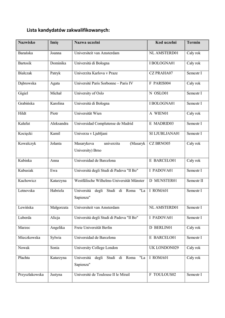 Lista kandydatów zakwalifikowanych: Nazwisko Imię Nazwa uczelni Barańska Joanna Universiteit van Amsterdam NL AMSTERD01 Cały rok Bartosik Dominika Università di Bologna I BOLOGNA01 Cały rok Białczak Patryk Univerzita Karlova v Praze CZ PRAHA07 Semestr I Dąbrowska Agata Université Paris Sorbonne – Paris IV F PARIS004 Cały rok Gigiel Michał University of Oslo N OSLO01 Semestr I Grabińska Karolina Università di Bologna I BOLOGNA01 Semestr I Hildt Piotr Universität Wien A WIEN01 Cały rok Kałafut Aleksandra Universidad Complutense de Madrid E MADRID03 Semestr I Kocięcki Kamil Univerza v Ljubljani SI LJUBLJANA01 Semestr I Kowalczyk Jolanta Masarykova CZ BRNO05 Cały rok Kod uczelni univerzita (Masaryk Termin University) Brno Kubinka Anna Universidad de Barcelona E BARCELO01 Cały rok Kubusiak Ewa Università degli Studi di Padova "Il Bo" I PADOVA01 Semestr I Kuchowicz Katarzyna Westfälische Wilhelms-Universität Münster D MUNSTER01 Semestr II Letnovska Habriela Università degli Studi di Roma "La I ROMA01 Semestr I Sapienza" Lewińska Małgorzata Universiteit van Amsterdam NL AMSTERD01 Semestr I Luberda Alicja Università degli Studi di Padova "Il Bo" I PADOVA01 Semestr I Marzec Angelika Freie Universität Berlin D BERLIN01 Cały rok Mieczkowska Sylwia Universidad de Barcelona E BARCELO01 Semestr I Nowak Sonia University College London UK LONDON029 Cały rok Płachta Katarzyna Università degli Studi di Roma "La I ROMA01 Cały rok F TOULOUS02 Semestr I Sapienza" Przyszlakowska Justyna Université de Toulouse II le Mirail Nazwisko Imię Nazwa uczelni Sadek Magdalena Universidade de Lisboa P LISBOA109 Semestr I Sroka Aleksandra Eotvos Lorand University HU BUDAPES01 Semestr I Sromek Agnieszka University of Oslo N OSLO01 Semestr II Stokowiec Aleksandra Universidade de Lisboa P LISBOA109 Semestr I Szcząchor Aneta Università degli Studi di Udine I UDINE01 Semestr I Śliwa Ewelina Università degli Studi di Milano I MILANO01 Cały rok Tyszkiewicz Olga Helsinki University SF HELSINK01 Cały rok Wilk Mikołaj Université Paris Sorbonne – Paris IV F PARIS004 Cały rok Zielińska Edyta Masarykova CZ BRNO05 Semestr II Kod uczelni univerzita (Masaryk Termin University) Brno Lista kandydatów rezerwowych: Nazwisko Imię Nazwa uczelni Kod uczelni Termin Prałat Katarzyna Universität Wien A WIEN01 Cały rok
