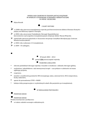 OPIEKA NAD CHORYMI PO TRANSPLANTACJI WĄTROBY W OPARCIU O STOSOWANE STANDARDY AKREDYTACYJNE W SPWSZ SZCZECINIE Edyta Kensik Z KART HISTORII w 2000 roku pierwsza transplantacja wątroby pod kierownictwem doktora Romana Kostyrki – jedyny nie kliniczny szpital w Europie; w 2002 roku utworzenie Pododdziału Chirurgii Hepatobiliarnej kierownictwo nad zespołem transplantacyjnym obejmuje doktor Maciej Wójcicki; szpital jako pierwsza placówka w Szczecinie otrzymuje Certyfikat Akredytacyjny Centrum Monitorowania Jakości w 2002 roku wykonano 12 transplantacji, w 2009 ‐ 55 zabiegów, W latach 2002 – 2012 ponad 350 przeszczepień wątroby WARUNKI LOKALOWE - obecnie pododdział chirurgii wątroby i trzustki w strukturze oddziału chirurgii ogólnej, • • respirator, • - aparat do prowadzenia CVVH + MARS wydzielona jednołóżkowa sala intensywnej terapii – czas pobytu w zależności od stanu ogólnego pacjenta, monitor z możliwością pomiarów RR inwazyjnego, tętna, saturacji krwi, OCŻ, temperatury, liczby oddechów, kolejne doby pooperacyjne w wydzielonych salach dla pacjentów po transplantacji, W NIEDALEKIEJ PRZYSZŁOŚCI PIERWSZE KROKI PIERWSZE KROKI Wiedza teoretyczna i praktyczna: w trakcie szkoleń wewnątrz oddziałowych: wytyczne dla zespołu pielęgniarskiego, schematy postępowania w poszczególnych stanach w trakcie dyżurów ‐ od członków zespołu pielęgniarskiego, lekarskiego, wyciągnięcie wniosków – modyfikowanie podejmowanych działań. PIERWSZE KROKI W związku z tym iż szpital ubiegał o Certyfikat Jakości spełnienie standardów akredytacyjnych wyzwoliło w zespole chęć podnoszenia kwalifikacji: ukończenie studiów I i/lub II stopnia kursy kwalifikacyjne specjalizacji studia podyplomowe STANDARDY POSTĘPOWANIA W SPWSZ Obecnie w placówce obowiązuje 18 standardów. • • • • • • • • • • Postępowanie p/w odleżynowe Zapobieganie zapaleniom związanym z kaniulacją żył obwodowych Postępowanie pielęgniarskie podczas napadu epilepsji Postępowanie przy hiperglikemii Postępowanie przy hipoglikemii Cewnikowanie pęcherza moczowego u kobiet Cewnikowanie pęcherza moczowego u mężczyzn Stosowanie przymusu bezpośredniego Postępowanie po ekspozycji na krew i inne potencjalne materiały zakaźne Profilaktyka zakrzepowo‐zatorowa Nie mniej ważne od wyżej wymienionych jest przestrzeganie w opiece nad chorym procedur : zapobieganie zdarzeń niepożądanych monitorowania bólu umożliwienia kontaktu z rodziną lub osobą bliską SCHEMAT OPIEKI NAD CHORYM PO TRANSPLANTACJI W opiece nad chorym po transplantacji poza ogólnymi zasadami intensywnej terapii należy uwzględnić indywidualną specyfikę pacjenta, jego stan przed przeszczepem, ,,jakość przeszczepionego narządu” oraz powikłania występujące w bezpośrednim okresie pooperacyjnym. Zakres monitorowania pacjenta po transplantacji powinien być bardzo szeroki, ponieważ przeoczenie jakichkolwiek zaburzeń może być przyczyną ciężkich następstw aż do utraty przeszczepu i zgonu włącznie. OPIEKA PO TRANSPLANTACJI WĄTROBY Opieka nad pacjentem w oparciu: stan zdrowia przed zabiegiem czas trwania choroby choroby współistniejące deficyty ze strony poszczególnych układów/narządów czynnik etiologiczny marskości/niewydolności wątroby np.: WZW alkohol leki ‐świadome przedawkowanie choroby genetyczne nowotwór toksyny wsparcie rodziny i osób bliskich – motywacja powrotu do zdrowia aktywność: szkolna, zawodowa, społeczna SCHEMAT OPIEKI NAD CHORYM PO TRANSPLANTACJI leczenie immunosupresyjne – nie ma działania terapeutycznego, jego zadanie polega na zaakceptowaniu obcego narządu przez ciało biorcy. Stosowanie immunospupresji wywołuje w zespole opiekującym się odpowiednie reakcje – wzmożona uwaga nad podopiecznym: • • • obniżenie odporności,: izolacja chorych, ograniczenie wizyt, reżim sanitarny, ↑ ryzyka zakażeń bakteryjnych, wirusowych, grzybiczych cukrzyca, SCHEMAT OPIEKI NAD CHORYM PO TRANSPLANTACJI • • • • • zmniejszona zdolność do gojenia się ran, - zaburzenia koncentracji ostra niewydolność nerek zaburzenia snu zaburzenia nastroju drżenie rąk – wykonywanie czynności piel‐ higienicznych encefalopatia wątrobowa: ‐ zaburzenia rytmu snu i czuwania, SCHEMAT OPIEKI NAD CHORYM PO TRANSPLANTACJI - nieadekwatne zachowania brak orientacji co do miejsca i czasu lęk, drażliwość, urojenia, agresja, gniew, słowotok, letarg, śpiączka. SCHEMAT OPIEKI NAD CHORYM PO TRANSPLANTACJI ZESPOŁ TERAPEUTYCZNY: zespół lekarzy: chirurg, anestezjolog, hepatolog, diabetolog, radiolog, mikrobiolog, chorób zakaźnych, zespół pielęgniarek: chirurgicznych, anestezjologicznych rehabilitant psycholog dietetyk układu krążenia MONITORING –OBSERWACJA‐ POMIARY układu oddechowego układu pokarmowego funkcji nerek rany pooperacyjnej temperatury ciała nasilenia bólu poziomu glikemii w surowicy krwi Czynniki sprzyjające: POSTĘPOWANIE PRZECIW ODLEŻYNOWE - wyniszczenie organizmu spowodowane długotrwałą chorobą - unieruchomienie w pierwszych godzinach /dobach pooperacyjnych obniżony poziom białka i albumin w surowicy krwi ciepłe i wilgotne środowisko oraz długotrwały ucisk w trakcie zabiegu chirurgicznego ( około 12‐ 17‐ 23 godzin), POSTĘPOWANIE PRZECIW ODLEŻYNOWE Postępowanie pielęgniarskie: - ocena pod kątem zagrożenia odleżyną w chwili przyjęcia w oddział, ponowna ocena po powrocie z bloku operacyjnego oraz zawsze gdy stan ogólny chorego ulegnie pogorszeniu prowadzenie działań profilaktycznych jeśli chory otrzyma ↓14 punktów w skali D.Norton, stosowanie profilaktyki w warunkach bloku operacyjnego ustalenie indywidualnego planu działania, rzetelne prowadzenie dokumentacji edukacja chorego i jego rodziny DOŚWIADCZENIA WŁASNE – PIERWSZE KROKI DOŚWIADCZENIA WŁASNE – PIERWSZE KROKI Sytuacje te miały miejsce kiedy nie stosowano standardu akredytacyjnego dotyczącego postępowania p/w 