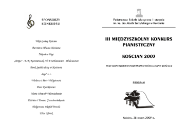 SPONSORZY KONKURSU Wójt Gminy Kocian Burmistrz Miasta Kociana Zbigniew Vogt Tempo - E. K. Kamierczak, W. P. Urbanowicz - Widziszewo Bank Spó³dzielczy w Kocianie Pañstwowa Szko³a Muzyczna I stopnia im. ks. dra Józefa Surzyñskiego w Kocianie III MIÊDZYSZKOLNY KONKURS PIANISTYCZNY KOCIAN 2003 POD HONOROWYM PATRONATEM WÓJTA GMINY KOCIAN Irys s. c. Wioletta i Piotr Waligórowie PROGRAM Piotr Ruszkiewicz Maria i Pawe³ Walenciakowie El¿bieta i Tomasz Grzechowiakowie Ma³gorzata i Rafa³ Drozda Eliza Klorek Kocian, 28 marca 2003 r. GRUPA TRZECIA 1. Deskiewicz Julita, ur. 1990 r., PSM I st. w Zb¹szyniu J. S. Bach Inwencja trzyg³osowa nr 6 A. Rawina Etiuda A-dur op. 50 nr 8 F. Schubert Scherzo B-dur nauczyciel: Maria Czuchwicka 2. K³oczaniuk Mateusz, ur. 1989 r., PSM I st. w Kêpnie J. S. Bach Ma³e preludium F-dur nr 10 C. Czerny Etiuda B-dur op. 299 nr 13 M. Moszkowski Tarantela d-moll op. 77 nauczyciel: Iwona Korta Organizatorem III Miêdzyszkolnego Konkursu Pianistycznego w Kocianie jest sekcja instrumentów klawiszowych Pañstwowej Szko³y Muzycznej I stopnia im. ks. dra Józefa Surzyñskiego w Kocianie. Honorowy patronat nad Konkursem sprawuje Wójt Gminy Kocian. Konkurs ma na celu umo¿liwienie prezentacji uczniów, ich osi¹gniêæ oraz wymianê dowiadczeñ pedagogicznych. Impreza przeznaczona jest dla uczniów szkó³ muzycznych I stopnia. Uczestnicy wystêpuj¹ w trzech grupach wiekowych: grupa pierwsza - klasy II i III c. 6-letniego grupa druga - klasy IV, V c. 6-letniego oraz II i III c. 4-letniego grupa trzecia - klasa VI c. 6-letniego oraz IV c. 4-letniego Program konkursu obejmuje wykonanie trzech utworów: utworu J. S. Bacha, dowolnej etiudy oraz scherza lub taranteli. Grê uczestników ocenia Jury, którego decyzje s¹ ostateczne. 3. Maækowiak Aleksandra, ur. 1990 r., PSM I st. w Zb¹szyniu J. S. Bach Inwencja trzyg³osowa nr 1 A. Löschhorn Etiuda op. 66 nr 19 M. Moszkowski Tarantela op. 77 nr 6 nauczyciel: Bo¿ena Bia³ecka 4. Szczech Kinga, ur. 1989 r., PSM I st. w Pile JURY KONKURSU prof. Jan Jañski - przewodnicz¹cy Akademia Muzyczna w Poznaniu mgr Hanna Morawska Zespó³ Szkó³ Muzycznych nr 2 w Poznaniu mgr Barbara Jarantowska Zespó³ Szkó³ Muzycznych nr 2 w Poznaniu J. S. Bach Inwencja dwug³osowa a-moll nr 13 T. Lack Etiuda a-moll op. 95 nr 16 M. Moszkowski Tarantela op. 77 nr 6 nauczyciel: Ma³gorzata migielska SEKRETARZ mgr Marian Micha³owicz Pañstwowa Szko³a Muzyczna I stopnia w Kocianie HARMONOGRAM KONKURSU 9.15 - 9.45 i n a u g u r a c j a p o ³ ¹ c z o n a z ko n c e r t e m D u o Fo r t e p i a n o w e g o L a Va l s e 8 9 Anna Haas-Niewiedzia³ i Piotr Niewiedzia³ 9.50 - 11.20 przes³uchanie pierwszej grupy 11.20 - 12.00 przerwa 12.00 - 12.45 przes³uchanie trzeciej grupy 12.45 - 14.30 przerwa 14.30 - 16.30 przes³uchanie drugiej grupy 16.30 - 17.30 przerwa 17.30 wrêczenie nagród i Koncert Laureatów 10. Pacyna Maurycy, ur. 1991 r., PSM I st. w Kêpnie J. S. Bach Air z II Suity francuskiej c-moll H. Berens Etiuda a-moll op. 61 nr 32 S. Prokofiew Tarantela d-moll op. 65 nauczyciel: Liliana Rydz 11. Paw³owska Marzena, ur. 1991 r., PSM I st. w Zb¹szyniu J. S. Bach Inwencja dwug³osowa nr 9 H. Berens Etiuda op. 88 nr 28 F. Schubert Scherzo B-dur nauczyciel: Bo¿ena Bia³ecka 12. Rybiñska Paulina, ur. 1990 r., PSM I st. w Kole J. S. Bach Preludium e-moll nr 13 A. Löschhorn Etiuda g-moll op. 136 nr 7 H. Rakow Tarantela nauczyciel: Alina Jab³oñska 13. Spychalska Kamila, ur. 1991 r., PSM I st. w Pleszewie J. S. Bach Inwencja dwug³osowa F-dur nr 8 S. Heller Etiuda g-moll op. 45 nr 18 D. Kabalewski Scherzo op. 27 nr 14 nauczyciel: Danuta B¹kowska 14. Wieczorek Marzena, ur. 1991 r., PSM I st. w Kole J. S. Bach Inwencja B-dur nr 14 S. Heller Etiuda g-moll op. 45 D. Kabalewski Scherzo op. 27 nr 14 nauczyciel: Ma³gorzata Lisiowska 5. Kolano Maria, ur. 1992 r., PSM I st. w Kocianie J. S. Bach Inwencja dwug³osowa c-moll nr 2 S. Heller Etiuda d-moll op. 46 nr 14 S. Prokofiew Tarantela d-moll op. 65 nauczyciel: Beata Stanek 6. Koz³owska Marzena, ur. 1988 r., PSM I st. w Gostyniu J. S. Bach Inwencja dwug³osowa Es-dur C. Czerny Etiuda C-dur op. 299 nr 5 F. Schubert Scherzo B-dur nauczyciel: Violetta Drab 7. Kropp Patrycja, ur. 1991 r., PSM I st. w Zb¹szyniu J. S. Bach Inwencja dwug³osowa F-dur nr 8 A. Löschhorn Etiuda A-dur op. 66 nr 7 M. Glinka Tarantela nauczyciel: Maria Czuchwicka 8. Majewska Katarzyna, ur. 1991 r., PSM I st. w Kocianie J. S. Bach Allemande z Suity francuskiej c-moll A. Löschhorn Etiuda A-dur op. 66 nr 7 F. Schubert Scherzo Des-dur nauczyciel: Stanis³aw Dycha 9. Malajka Martyna, ur. 1991 r., PSM I st. w Wolsztynie J. S. Bach Inwencja dwug³osowa nr 13 S. Heller Etiuda op. 46 nr 5 F. Schubert Scherzo B-dur nauczyciel: Gra¿yna Mas³owska LISTA UCZESTNIKÓW GRUPA PIERWSZA 1. Chromiñski Rafa³ PSM I st. w Zb¹szyniu 2. Czwojdziñska Marta PSM I st. w Krotoszynie 3. Æwiertniak Anna Maria PSM I i II st. w Szamotu³ach 4. Gaertig Marta PSM I st. w Kocianie 5. Gogoliñski Pawe³ PSM I st. w Nowym Tomylu 6. Grzegorowska Laura PSM I st. w Ostrzeszowie 7. Kasperska Magdalena PSM I st. w Kocianie 8. Lisiak Joanna PSM I st. w Kole 9. Ma³ojet Marta PSM I st. w Kole 10. Mizerkiewicz Martyna PSM I st. w Pleszewie 11. Nikodem Dominika PSM I st. w Kêpnie 12. Ostapkowicz Piotr PSM I st. w Nowym Tomylu 13. Rymkiewicz Joanna PSM I st. w Gostyniu 14. Rymkiewicz Katarzyna PSM I st. w Gostyniu 15. Spycha³a Mateusz PSM I i II st. w Szamotu³ach 16. Zawada Katarzyna PSM I st. w Pleszewie 17. Frankiewicz Marta PSM I st. w Jarocinie 18. Obara Sandra PSM I st. w Jarocinie GRUPA DRUGA GRUPA DRUGA 1. Dudziak Julita PSM I st. w Kocianie 1. Dudziak Julita, ur. 1990 r., PSM I st. w Kocianie 2. Góral Ilona PSM I st. w Kêpnie J. S. Bach Allemande z Suity francuskiej d-moll 3. Jankowski Mateusz PSM I i II st. w Szamotu³ach S. Heller Etiuda h-moll op. 46 nr 11 4. Knop Magdalena PSM I st. w Nowym Tomylu F. Schubert Scherzo B-dur 5. Kolano Maria PSM 