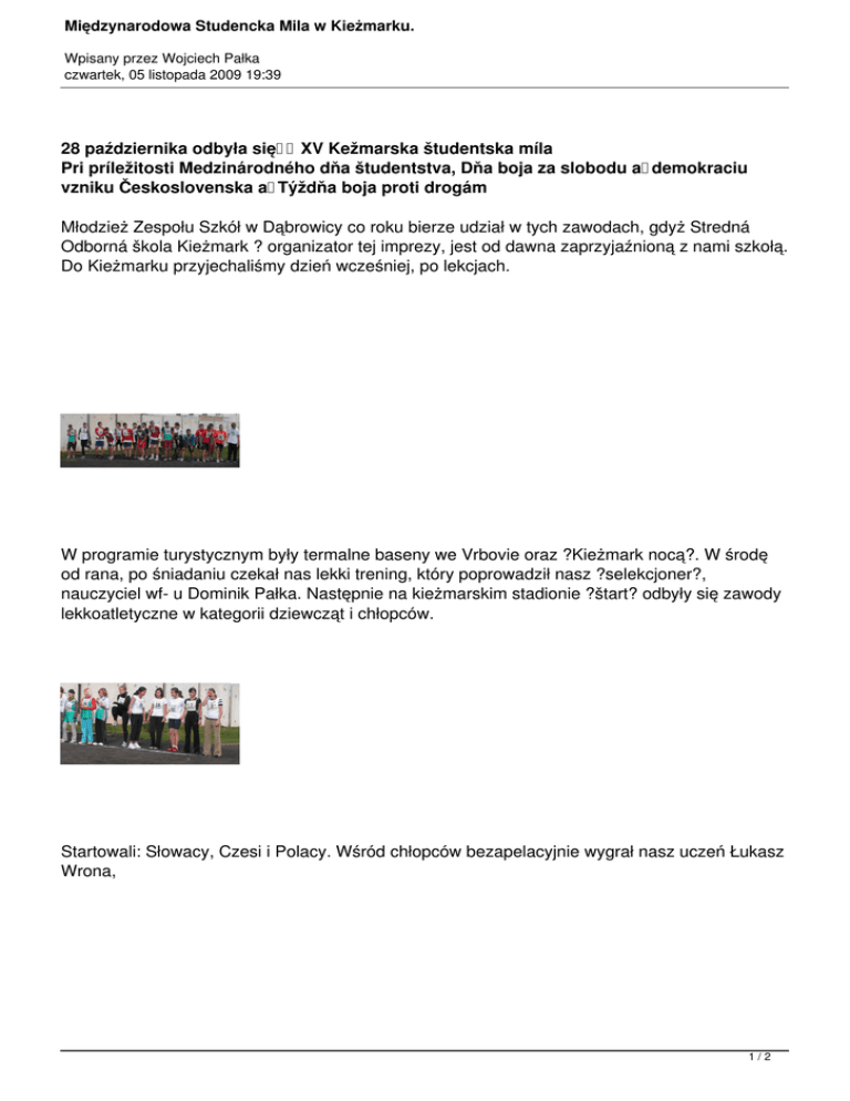 Międzynarodowa Studencka Mila w Kieżmarku. Wpisany przez Wojciech Pałka czwartek, 05 listopada 2009 19:39 28 października odbyła się XV Kežmarska študentska míla Pri príležitosti Medzinárodného dňa študentstva, Dňa boja za slobodu a demokraciu vzniku Československa a Týždňa boja proti drogám Młodzież Zespołu Szkół w Dąbrowicy co roku bierze udział w tych zawodach, gdyż Stredná Odborná škola Kieżmark ? organizator tej imprezy, jest od dawna zaprzyjaźnioną z nami szkołą. Do Kieżmarku przyjechaliśmy dzień wcześniej, po lekcjach. W programie turystycznym były termalne baseny we Vrbovie oraz ?Kieżmark nocą?. W środę od rana, po śniadaniu czekał nas lekki trening, który poprowadził nasz ?selekcjoner?, nauczyciel wf- u Dominik Pałka. Następnie na kieżmarskim stadionie ?štart? odbyły się zawody lekkoatletyczne w kategorii dziewcząt i chłopców. Startowali: Słowacy, Czesi i Polacy. Wśród chłopców bezapelacyjnie wygrał nasz uczeń Łukasz Wrona, 1/2 Międzynarodowa Studencka Mila w Kieżmarku. Wpisany przez Wojciech Pałka czwartek, 05 listopada 2009 19:39 wśród dziewcząt ?szybka? Słowaczka ze Spiskiej Wsi. Strednej Późnym popołudniem Odbornej školy czekała Kieżmark. nas jeszcze ?gala? Starej z okazji jubileuszu 60 rocznicy powstania Byłagratulacyjny list wróciliśmy akademia, do Dąbrowicy. przekazany kwiaty oraz uroczysty przez W. Pałkę obiad.reprezentującego Dyrektor szkoły Pan ZS wStanislav Dąbrowicy. Marhefka Wieczorem przyjął 2/2