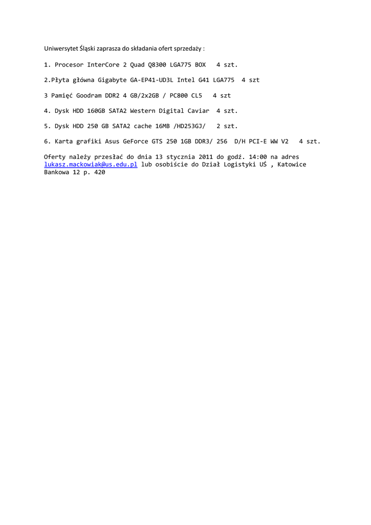 Uniwersytet Śląski zaprasza do składania ofert sprzedaży : 1. Procesor InterCore 2 Quad Q8300 LGA775 BOX 4 szt. 2.Płyta główna Gigabyte GA-EP41-UD3L Intel G41 LGA775 3 Pamięć Goodram DDR2 4 GB/2x2GB / PC800 CL5 4 szt 4 szt 4. Dysk HDD 160GB SATA2 Western Digital Caviar 4 szt. 5. Dysk HDD 250 GB SATA2 cache 16MB /HD253GJ/ 2 szt. 6. Karta grafiki Asus GeForce GTS 250 1GB DDR3/ 256 D/H PCI-E WW V2 4 szt. Oferty należy przesłać do dnia 13 stycznia 2011 do godź. 14:00 na adres [email protected] lub osobiście do Dział Logistyki UŚ , Katowice Bankowa 12 p. 420