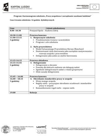 Program i harmonogram szkolenia „Praca zespołowa i zarządzanie zasobami ludzkimi” Czas trwania szkolenia: 16 godzin dydaktycznych Czas 8.00 -10.30 I dzień szkoleniowy Przejazd Opole – Kudowa Zdrój 10.30-11.00 11.00-13.15 3 godziny Przerwa kawowa 1. Rozpoczęcie szkolenia • Przedstawienie trenera i uczestników • Program i cele szkolenia 2. Style przywództwa • Model Sytuacyjnego Przywództwa Hersey-Blanchard • Dostosowanie stylu kierowania jako narzędzie motywowania i rozwoju zespołu i pracowników • Delegowanie jako jeden ze stylów kierowania 13.15-14.15 14.15-15.45 2 godziny Przerwa obiadowa 3. Delegowanie • Delegowanie a zlecanie • Powody dla których szefowie nie delegują zadań • Zgodność delegowanych zadań z rolami grupowymi • Złote zasady delegowania 15.45 – 16.00 16.00 – 18.15 3 godziny Przerwa kawowa 4. Określanie standardów pracy w zespole • Wizja mojego zespołu • Reguły szefa – precyzyjne określanie oczekiwań i standardów pracy w zespole • Komunikowanie reguł szefa – expose szefa 19.00 Kolacja 7.00-8.00 8.00 – 10.15 3 godziny 10.15-10.30 10.30-12.45 3 godziny II dzień szkoleniowy Śniadanie 5. Zarządzania przez cele jako sposób wzbudzania motywacji, inicjatywy i odpowiedzialności w zespole Wprowadzenie do zarządzania przez cele Cel i rodzaje celów (definicja celu, cela a zadanie, właściwości celów) Metody wyznaczania celów Efektywna komunikacja celów i zadań Skuteczność w osiąganiu celów – planowanie i kontrola (narzędzia kontroli) Przerwa kawowa 6. Efektywna komunikacja w zespole – prowadzenie rozmów pracowniczych dotyczących oceny realizacji zadań i celów • Udzielanie bieżąacej informacji zwrotnej • Rozmowy pracowcznie: pochwała, rozmowa korygująca 12.45-13.00 13.00-14.30 2 godziny Przerwa kawowa 7. Ocena pracownika • Rozmowy pracownicze: rozmowy oceniające 8. Podsumowanie szkolenia 14.30 – 15.15 Przerwa obiadowa 15.30 – 18.00 Przejazd Kudowa Zdrój - Opole