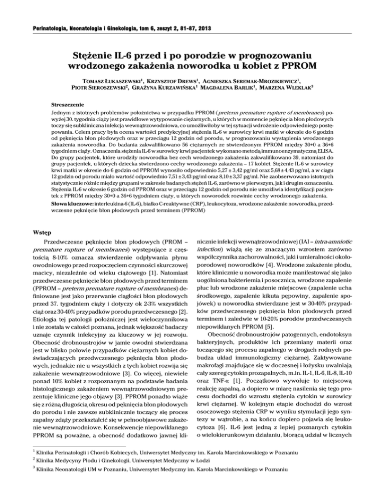 Perinatologia, Neonatologia i Ginekologia, tom 6, zeszyt 2, 81-87, 2013 Stężenie IL-6 przed i po porodzie w prognozowaniu wrodzonego zakażenia noworodka u kobiet z PPROM TOMASZ ŁUKASZEWSKI1, KRZYSZTOF DREWS1, AGNIESZKA SEREMAK-MROZIKIEWICZ1, PIOTR SIEROSZEWSKI2, GRAŻYNA KURZAWIŃSKA1 MAGDALENA BARLIK1, MARZENA WLEKLAK3 Streszczenie Jednym z istotnych problemów położnictwa w przypadku PPROM (preterm premature rupture of membranes) powyżej 30. tygodnia ciąży jest prawidłowe wytypowanie ciężarnych, u których w momencie pęknięcia błon płodowych toczy się subkliniczna infekcja wewnątrzowodniowa, co umożliwiłoby w tej sytuacji wdrożenie odpowiedniego postępowania. Celem pracy była ocena wartości predykcyjnej stężenia IL-6 w surowicy krwi matki w okresie do 6 godzin od pęknięcia błon płodowych oraz w przeciągu 12 godzin od porodu, w prognozowaniu wystąpienia wrodzonego zakażenia noworodka. Do badania zakwalifikowano 56 ciężarnych ze stwierdzonym PPROM między 30+0 a 36+6 tygodniem ciąży. Oznaczenia stężenia IL-6 w surowicy krwi pacjentek wykonano metodą immunoenzymatyczną ELISA. Do grupy pacjentek, które urodziły noworodka bez cech wrodzonego zakażenia zakwalifikowano 39, natomiast do grupy pacjentek, u których dziecka stwierdzono cechy wrodzonego zakażenia – 17 kobiet. Stężenie IL-6 w surowicy krwi matki w okresie do 6 godzin od PPROM wynosiło odpowiednio 5,27 ± 3,42 pg/ml oraz 5,68 ± 4,43 pg/ml, a w ciągu 12 godzin od porodu miało wartość odpowiednio 7,51 ± 3,43 pg/ml oraz 8,10 ± 3,37 pg/ml. Nie zaobserwowano istotnych statystycznie różnic między grupami w zakresie badanych stężeń IL-6, zarówno w pierwszym, jak i drugim oznaczeniu. Stężenia IL-6 w okresie 6 godzin od PPROM oraz w przeciągu 12 godzin od porodu nie umożliwia identyfikacji pacjentek z PPROM między 30+0 a 36+6 tygodniem ciąży, u których noworodek rozwinie cechy wrodzonego zakażenia. Słowa kluczowe: interleukina-6 (IL-6), białko C-reaktywne (CRP), leukocytoza, wrodzone zakażenie noworodka, przedwczesne pęknięcie błon płodowych przed terminem (PPROM) Wstęp Przedwczesne pęknięcie błon płodowych (PROM – premature rupture of membranes) występujące z częstością 8-10% oznacza stwierdzenie odpływania płynu owodniowego przed rozpoczęciem czynności skurczowej macicy, niezależnie od wieku ciążowego [1]. Natomiast przedwczesne pęknięcie błon płodowych przed terminem (PPROM – preterm premature rupture of membranes) definiowane jest jako przerwanie ciągłości błon płodowych przed 37. tygodniem ciąży i dotyczy ok 2-3% wszystkich ciąż oraz 30-40% przypadków porodu przedwczesnego [2]. Etiologia tej patologii położniczej jest wieloczynnikowa i nie została w całości poznana, jednak większość badaczy uznaje czynnik infekcyjny za kluczowy w jej rozwoju. Obecność drobnoustrojów w jamie owodni stwierdzana jest w blisko połowie przypadków ciężarnych kobiet doświadczających przedwczesnego pęknięcia błon płodowych, jednakże nie u wszystkich z tych kobiet rozwija się zakażenie wewnątrzowodniowe [3]. Co więcej, niewiele ponad 10% kobiet z rozpoznanym na podstawie badania histologicznego zakażeniem wewnątrzowodniowym prezentuje kliniczne jego objawy [3]. PPROM ponadto wiąże się z różną długością okresu od pęknięcia błon płodowych do porodu i nie zawsze subklinicznie toczący się proces zapalny zdąży przekształcić się w pełnoobjawowe zakażenie wewnątrzowodniowe. Konsekwencje niepowikłanego PPROM są poważne, a obecność dodatkowo jawnej kli- nicznie infekcji wewnątrzowodniowej (IAI – intra-amniotic infection) wiążą się ze znaczącym wzrostem zarówno współczynnika zachorowalności, jaki i umieralności okołoporodowej noworodków [4]. Wrodzone zakażenie płodu, które klinicznie u noworodka może manifestować się jako uogólniona bakteriemia i posocznica, wrodzone zapalenie płuc lub wrodzone zakażenie miejscowe (zapalenie ucha środkowego, zapalenie kikuta pępowiny, zapalenie spojówek) u noworodka stwierdzane jest w 30-40% przypadków przedwczesnego pęknięcia błon płodowych przed terminem i zaledwie w 10-20% porodów przedwczesnych niepowikłanych PPROM [5]. Obecność drobnoustrojów patogennych, endotoksyn bakteryjnych, produktów ich przemiany materii oraz toczącego się procesu zapalnego w drogach rodnych pobudza układ immunologiczny ciężarnej. Zaktywowane makrofagi znajdujące się w doczesnej i łożysku uwalniają cały szereg cytokin prozapalnych, m.in. IL-1, IL-6, IL-8, IL-10 oraz TNF-α [1]. Początkowo wywołuje to miejscową reakcję zapalną, a dopiero w miarę nasilenia się tego procesu dochodzi do wzrostu stężenia cytokin w surowicy krwi ciężarnej. W kolejnym etapie dochodzi do wzrost osoczowego stężenia CRP w wyniku stymulacji jego syntezy w wątrobie, a na końcu dopiero pojawia się leukocytoza [6]. IL-6 jest jedną z lepiej poznanych cytokin o wielokierunkowym działaniu, biorącą udział w licznych 1 Klinika Perinatologii i Chorób Kobiecych, Uniwersytet Medyczny im. Karola Marcinkowskiego w Poznaniu 2 Klinika Medycyny Płodu i Ginekologii, Uniwersytet Medyczny w Łodzi 3 Klinika Neonatologii UM w Poznaniu, Uniwersytet Medyczny im. Karola Marcinkowskiego w Poznaniu 82 T. Łukaszewski, K. Drews, A. Seremak-Mrozikiewicz, P. Sieroszewski, G. Kurzawińska, M. Barlik, M. Wleklak procesach biologicznych, do których zaliczyć można: odpowiedź ostrej fazy, stan zapalny oraz szeroko pojętą odpowiedź organizmu na obecność patogenów [7, 8, 17]. Jej stężenie w surowicy krwi matki, wydzielinie pochwowej oraz płynie owodniowym wyraźnie wzrasta w przypadku PPROM oraz IAI [9, 10]. U ludzi zdrowych, bez aktualnie toczących się chorób o etiologii infekcyjnej, stężenie IL-6 nie przekracza zazwyczaj 1 pg/ml [11-17]. Oznaczenie osoczowego stężenia IL-6 wykorzystywane jest we wczesnej diagnostyce toczącego się zakażenia, przede wszystkim 