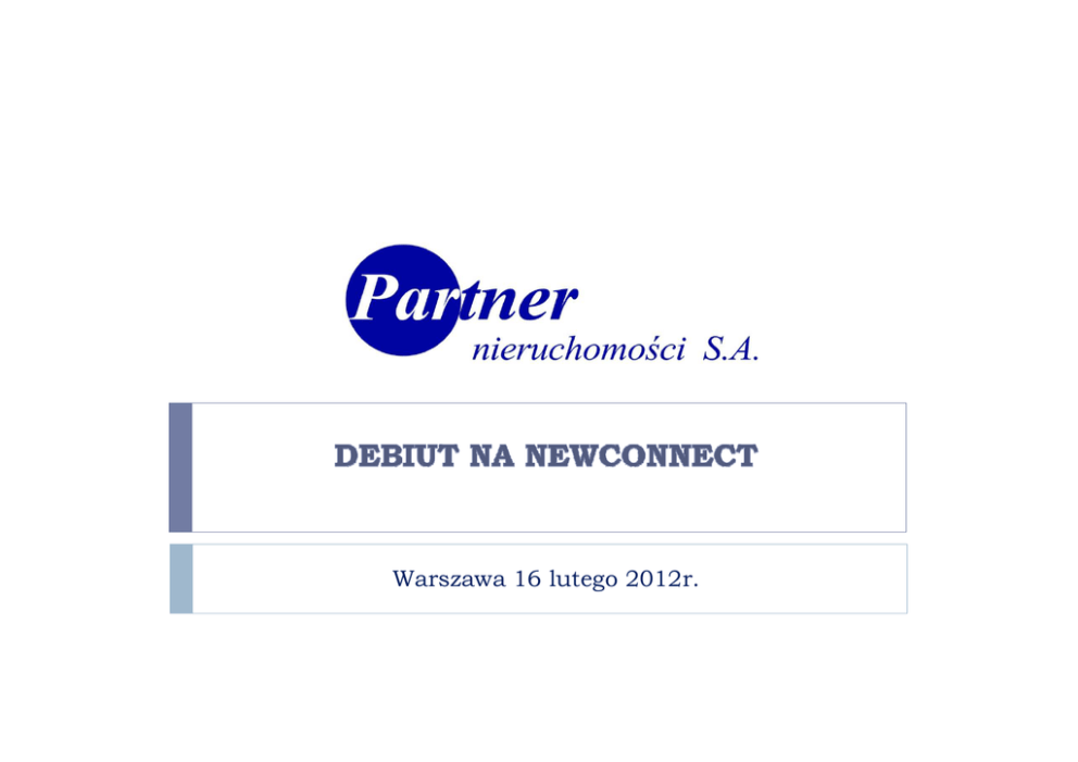Warszawa 16 lutego 2012r. O spółce … Spółka PARTNER-NIERUCHOMOŚCI sp. z o.o. powstała w sierpniu 2008 roku. Działalność spółki związana jest z obsługą rynku nieruchomości – • wynajem, • dzierżawa, • zarządzanie, • sprzedaż - głównie na rynku wtórnym. Spółka oferuje wynajem powierzchni biurowych, terenów przemysłowych – gruntów, hal produkcyjnych, itp. W ofercie sprzedażowej spółki znajdują się grunty i nieruchomości o charakterze przemysłowym, komercyjnym. 41-605 Świętochłowice; ul. Sądowa 7; 32 771 61 01, 32 771 61 02; www.partnernieruchomości.com.pl Etapy rozwoju … droga na NewConnect • luty 2011r. – decyzja o przekształceniu w spółkę akcyjną i rozpoczęcie procesu upublicznienia • sierpień 2011r. – rejestracja przekształcenia spółki z ograniczoną odpowiedzialnością w spółkę akcyjną • październik – listopad 2011r. – przeprowadzenie oferty private placement pozyskany kapitał 1.680.000,00 zł sprzedano 12.000.000 akcji serii B (wartość nominalna 0,10 zł) akcje zakupiło 24 inwestorów – 22 osoby prywatne i 2 podmioty instytucjonalne • 16 lutego 2012r. – debiut na NewConnect 41-605 Świętochłowice; ul. Sądowa 7; 32 771 61 01, 32 771 61 02; www.partnernieruchomości.com.pl O spółce … Partner-Nieruchomości jest właścicielem biurowca, w którym znajduje się siedziba spółki. Oferowane powierzchnie biurowe charakteryzują się wysokim standardem, ściśle dostosowanym do potrzeb klientów, po atrakcyjnych cenach. Dzięki temu poziom wynajętej powierzchni nie spada poniżej 90%. 41-605 Świętochłowice; ul. Sądowa 7; 32 771 61 01, 32 771 61 02; www.partnernieruchomości.com.pl O spółce … Partner-Nieruchomości jest właścicielem hali z magazynami, biurami, zapleczem socjalnym oraz infrastrukturą techniczną otaczające nieruchomość obszary to tereny przemysłowe i zakłady usługowe. Jest to typowy wydzielony rejon przemysłowy o dogodnym dostępie do sieci komunikacji o zasięgu regionalnym i usług komunalnych. 41-605 Świętochłowice; ul. Sądowa 7; 32 771 61 01, 32 771 61 02; www.partnernieruchomości.com.pl O spółce … Partner-Nieruchomości jest właścicielem biurowca zlokalizowanego w centrum Chorzowa, w bezpośrednim sąsiedztwie oddziału ZUS w Chorzowie. W skład nieruchomości wchodzą trzy działki gruntowe o łącznej powierzchni 1.078 m2 zabudowanej m.in. budynkiem biurowym, magazynowym. Całość jest w bardzo dobrym stanie technicznym, nie wymagającym nakładów inwestycyjnych na remont i modernizację. 41-605 Świętochłowice; ul. Sądowa 7; 32 771 61 01, 32 771 61 02; www.partnernieruchomości.com.pl Dane finansowe Zysk netto (tys. zł) Przychody ze sprzedaży netto (tys. zł) 1600 250 1400 200 1200 1000 150 800 100 600 400 50 200 0 0 2009 2010 2011 2009 2010 2011 • przychody ze sprzedaży już w 2012 roku wzrosną dzięki wpływom z czynszów z nieruchomości nabytych w grudniu 2011 roku i styczniu 2012 roku; • dodatkowo na poziom przychodów będę miały transakcje sprzedaży innych nieruchomości znajdujących się w portfelu Spółki i inne planowane na ten rok transakcje; • co najmniej proporcjonalnie do wzrostu przychodów powinien wzrosnąć zysk netto, gdyż ostatnio nabyte nieruchomości nie wymagają nakładów na remont; 41-605 Świętochłowice; ul. Sądowa 7; 32 771 61 01, 32 771 61 02; www.partnernieruchomości.com.pl Strategia rozwoju • nabywanie nieruchomości po atrakcyjnych cenach w wyniku procesów windykacyjnych (zakup i sprzedaż) i osiąganie wysokich marż na sprzedaży, • uzyskiwanie wysokiej stopy zwrotu z inwestycji w nieruchomości własne, przeznaczone pod wynajem (efektywne administrowanie posiadanymi zasobami majątkowymi), • nabywanie nieruchomości na bardzo korzystnych warunkach w drodze emisji kierowanej, 41-605 Świętochłowice; ul. Sądowa 7; 32 771 61 01, 32 771 61 02; www.partnernieruchomości.com.pl Struktura akcjonariatu po emisji akcji serii B Pozostali inwestorzy; 20% PartnerFinanse; 80% 41-605 Świętochłowice; ul. Sądowa 7; 32 771 61 01, 32 771 61 02; www.partnernieruchomości.com.pl DZIĘKUJĘ ZA UWAGĘ