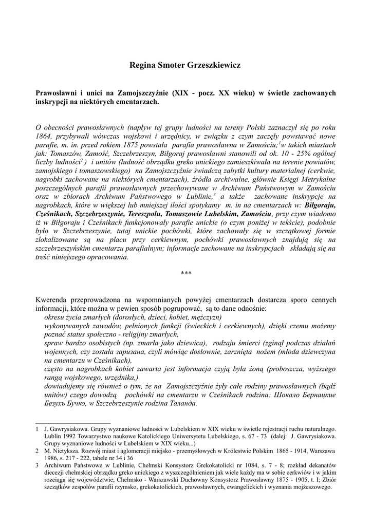 Regina Smoter Grzeszkiewicz Prawosławni i unici na Zamojszczyźnie (XIX - pocz. XX wieku) w świetle zachowanych inskrypcji na niektórych cmentarzach. O obecności prawosławnych (napływ tej grupy ludności na tereny Polski zaznaczył się po roku 1864, przybywali wówczas wojskowi i urzędnicy, w związku z czym zaczęły powstawać nowe parafie, m. in. przed rokiem 1875 powstała parafia prawosławna w Zamościu; 1w takich miastach jak: Tomaszów, Zamość, Szczebrzeszyn, Biłgoraj prawosławni stanowili od ok. 10 - 25% ogólnej liczby ludności2 ) i unitów (ludność obrządku greko unickiego zamieszkiwała na terenie powiatów, zamojskiego i tomaszowskiego) na Zamojszczyźnie świadczą zabytki kultury materialnej (cerkwie, nagrobki zachowane na niektórych cmentarzach), źródła archiwalne, głównie Księgi Metrykalne poszczególnych parafii prawosławnych przechowywane w Archiwum Państwowym w Zamościu oraz w zbiorach Archiwum Państwowego w Lublinie,3 a także zachowane inskrypcje na nagrobkach, które w większej lub mniejszej ilości spotykamy m. in na cmentarzach w: Biłgoraju, Cześnikach, Szczebrzeszynie, Tereszpolu, Tomaszowie Lubelskim, Zamościu, przy czym wiadomo iż w Biłgoraju i Cześnikach funkcjonowały parafie unickie (o czym poniżej w tekście), podobnie było w Szczebrzeszynie, tutaj unickie pochówki, które zachowały się w szczątkowej formie zlokalizowane są na placu przy cerkiewnym, pochówki prawosławnych znajdują się na szczebrzeszyńskim cmentarzu parafialnym; informacje zachowane na inskrypcjach składają się na treść niniejszego opracowania. *** Kwerenda przeprowadzona na wspomnianych powyżej cmentarzach dostarcza sporo cennych informacji, które można w pewien sposób pogrupować, są to dane odnośnie: okresu życia zmarłych (dorosłych, dzieci, kobiet, mężczyzn) wykonywanych zawodów, pełnionych funkcji (świeckich i cerkiewnych), dzięki czemu możemy poznać status społeczno - religijny zmarłych, spraw bardzo osobistych (np. zmarła jako dziewica), rodzaju śmierci (zginął podczas działań wojennych, czy została заризана, czyli mówiąc dosłownie, zarznięta nożem (młoda dziewczyna na cmentarzu w Cześnikach), często na nagrobkach kobiet zawarta jest informacja czyją była żoną (proboszcza, wyższego rangą wojskowego, urzędnika,) dowiadujemy się również o tym, że na Zamojszczyźnie żyły całe rodziny prawosławnych (bądź unitów) czego dowodzą pochówki na cmentarzu w Cześnikach rodzina: Шокало Бернацкие Безухъ Бучко, w Szczebrzeszynie rodzina Таланда. 1 J. Gawrysiakowa. Grupy wyznaniowe ludności w Lubelskiem w XIX wieku w świetle rejestracji ruchu naturalnego. Lublin 1992 Towarzystwo naukowe Katolickiego Uniwersytetu Lubelskiego, s. 67 - 73 (dalej: J. Gawrysiakowa. Grupy wyznaniowe ludności w Lubelskiem w XIX wieku...) 2 M. Nietyksza. Rozwój miast i aglomeracji miejsko - przemysłowych w Królestwie Polskim 1865 - 1914, Warszawa 1986, s. 217 - 222, tabele nr 34 i 36 3 Archiwum Państwowe w Lublinie, Chełmski Konsystorz Grekokatolicki nr 1084, s. 7 - 8; rozkład dekanatów diecezji chełmskiej obrządku greko unickiego z wyszczególnieniem jak wiele każdy ma w sobie cerkwiów i w jakim rozciąga się województwie; Chełmsko - Warszawski Duchowny Konsystorz Prawosławny 1875 - 1905, t. I; Zbiór szczątków zespołów parafii rzymsko, grekokatolickich, prawosławnych, ewangelickich i wyznania mojżeszowego. Pochówki prawosławnych spotykane na zamojskich cmentarzach to często (jak w przypadku Zamościa) pochowki wojskowych, urzędników, którzy pojawili się na naszych terenach w pocz. XIX wieku wraz z dokonaniem nowego podziału administracyjnego Królestwa Polskiego, kiedy to powstał powiat zamojski i należało obsadzić zarówno urzędy gminne jak i powiatowe ludźmi znającymi język polski oraz przepisy prawne dostosowane do potrzeb ówczesnej rzeczywistości. Według badań przeprowadzonych przez Janinę Gawrysiakową ludność wyznania prawosławnego w Lubelskiem do końca lat dwudziestych XIX wieku liczyła zaledwie kilkadziesiąt osób, liczby jej zaczęły rosnąc wraz z napływem urzędników rosyjskich - wyznawców prawosławia4 Na cmentarzu w Biłgoraju i Tomaszowie Lubelskim znajdują się pochówki Kozaków z Pułków Dońskich (13, 18, 25), którzy najprawdopodobniej stacjonowali w funkcjonujących od 1880 roku w Biłgoraju koszarach kozackich, wybudowanych staraniem mieszczanina Jana Krzosa dla dwóch sotni5 stacjonującego w tym mieście 13 Pułku Kozaków Dońskich 6. Plac na ten cel uzyskał od władz miejskich na warunkach dogodnej dzierżawy. Rozciągał się on za ulicami Zamojską i Tarnogrodzką, po obydwu stronach drogi prowadzącej do Puszczy Solskiej, i liczył prawie 2 ha powierzchni. Plac pod zabudowę wydzierżawił Krzos od władz miejskich, za użytkowane budynki pobierał wysoki czynsz od władz rosyjskich; Kozacy przynosili także wysokie dochody właścicielom biłgorajskich restauracji i szynków.7 Pewna ilość zachowanych inskrypcji zawiera informacje odnośnie zmarłych dzieci w wieku od kilku miesięcy do kilku lat, są to: w Biłgoraju: Марія8 Петровна Агева, zmarła w wieku 9 lat. Маня (brak nazwiska), córka sotnika9 13 Dońskiego Pułku Kozaków (1888 - 10 kwietnia 1889 roku). Co zwraca uwagę, to wymowne w swej treści epitafium/ prośba na nagrobku Marysi: "Mania, módl się za swoją matkę". Można by się w tym miejscu zastanawiać dlaczego nie za dwojga rodziców tylko za matkę, być może jej matka, a żona owego sotnika była już wówczas wdową, albo chorowała - tego chyba się nie dowiemy. Kolejne dziecko prawosławnych rodziców spoczywające na cmentarzu w Biłgoraju to Николай Зеневичь - syn настоятеля (księdza). W wieku 14 lat zmarł Александрь Шабановъ, na jego nagrobku widnieje nieco przestarzały rosyjski wyraz отрок 