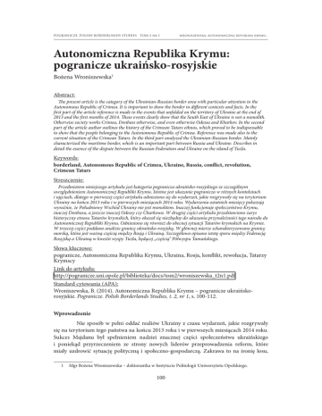 POGRANICZE. POLISH BORDERLANDS STUDIES TOM 2 nr 1 wroniszewska: autonomiczna republika krymu... Autonomiczna Republika Krymu: pogranicze ukraińsko-rosyjskie Bożena Wroniszewska1 Abstract: The present article is the category of the Ukrainian-Russian border area with particular attention to the Autonomous Republic of Crimea. It is important to show the border in different contexts and facts. In the first part of the article reference is made to the events that unfolded on the territory of Ukraine at the end of 2013 and the first months of 2014. These events clearly show that the South East of Ukraine is not a monolith. Otherwise society works Crimea, Donbass otherwise, and even otherwise Odessa and Kharkov. In the second part of the article author outlines the history of the Crimean Tatars ethnos, which proved to be indispensable to show that the people belonging to the Autonomous Republic of Crimea. Reference was made also to the current situation of the Crimean Tatars. In the third part analyzed the Ukrainian-Russian border. Mainly characterized the maritime border, which is an important part between Russia and Ukraine. Describes in detail the essence of the dispute between the Russian Federation and Ukraine on the island of Tuzla. Keywords: borderland, Autonomous Republic of Crimea, Ukraine, Russia, conflict, revolution, Crimean Tatars Streszczenie: Przedmiotem niniejszego artykułu jest kategoria pogranicza ukraińsko-rosyjskiego ze szczególnym uwzględnieniem Autonomicznej Republiki Krymu. Istotne jest ukazanie pogranicza w różnych kontekstach i ujęciach, dlatego w pierwszej części artykułu odniesiono się do wydarzeń, jakie rozgrywały się na terytorium Ukrainy na końcu 2013 roku i w pierwszych miesiącach 2014 roku. Wydarzenia ostatnich miesięcy pokazują wyraźnie, że Południowy Wschód Ukrainy nie jest monolitem. Inaczej funkcjonuje społeczeństwo Krymu, inaczej Donbasu, a jeszcze inaczej Odessy czy Charkowa. W drugiej części artykułu przedstawiono zarys historyczny etnosu Tatarów krymskich, który okazał się niezbędny do ukazania przynależności tego narodu do Autonomicznej Republiki Krymu. Odniesiono się również do obecnej sytuacji Tatarów krymskich na Krymie. W trzeciej części poddano analizie granicę ukraińsko-rosyjską. W głównej mierze scharakteryzowano granicę morską, która jest ważną częścią między Rosją i Ukrainą. Szczegółowo opisano istotę sporu między Federacją Rosyjską a Ukrainą w kwestii wyspy Tuzła, będącej „częścią” Półwyspu Tamańskiego. Słowa kluczowe: pogranicze, Autonomiczna Republika Krymu, Ukraina, Rosja, konflikt, rewolucja, Tatarzy Krymscy Link do artykułu: http://pogranicze.uni.opole.pl/biblioteka/docs/tom2/wroniszewska_t2n1.pdf Standard cytowania (APA): Wroniszewska, B. (2014). Autonomiczna Republika Krymu – pogranicze ukraińskorosyjskie. Pogranicze. Polish Borderlands Studies, t. 2, nr 1, s. 100-112. Wprowadzenie Nie sposób w pełni oddać realiów Ukrainy z czasu wydarzeń, jakie rozgrywały się na terytorium tego państwa na końcu 2013 roku i w pierwszych miesiącach 2014 roku. Sukces Majdanu był spełnieniem nadziei znacznej części społeczeństwa ukraińskiego i poniekąd przyrzeczeniem ze strony nowych liderów przeprowadzenia reform, które miały uzdrowić sytuację polityczną i społeczno-gospodarczą. Zakrawa to na ironię losu, 1 Mgr Bożena Wroniszewska – doktorantka w Instytucie Politologii Uniwersytetu Opolskiego. 100 POGRANICZE. POLISH BORDERLANDS STUDIES TOM 2 nr 1 wroniszewska: autonomiczna republika krymu... albowiem na przełomie 2004/2005 roku – podczas Pomarańczowej Rewolucji – Ukraina stanęła przed podobnym wyborem kierunku ewolucji jej systemu politycznego po dekadzie rządów Leonida Kuczmy. Teraz pojawiła się szansa na przełom po rządach Wiktora Janukowycza. Niezaprzeczalnym sukcesem Pomarańczowej Rewolucji było powstrzymanie realnie rysującego się procesu „degeneracji” systemu w kierunku autokratyzmu. W czasie, gdy zdominowana przez opozycję Rada Najwyższa w lutym 2014 roku przyjmowała historyczne uchwały, południowo-wschodnia część Ukrainy ciążyła w stronę Rosji, choć wydarzenia ostatnich miesięcy pokazują wyraźnie, że tzw. Południowy Wschód Ukrainy nie jest monolitem, bowiem inaczej funkcjonuje społeczeństwo Krymu, inaczej Donbasu, a jeszcze inaczej Charkowa i Odessy etc. Początkowo wydawało się, że dążenie do ustabilizowania demokratycznych struktur państwa powinno sprzyjać umocnieniu nadal relatywnie słabego poczucia tożsamości narodowej, ale ocena obiektywnych przesłanek trwałości „państwa narodowego” okazała się być nieadekwatna do rzeczywistości. Różnice między najbardziej na zachód wysuniętymi połaciami Galicji a Donbasem i Krymem z każdym dniem narastały (Baluk 2002: 245). Do tej pory opozycję łączyło jedno hasło: „Janukowycz musi odejść”. W marcu 2014 roku straciło ono na znaczeniu i nawet w atmosferze patosu i patriotycznej euforii, jaka zapanowała na Majdanie, dało się dostrzec, że wraz poczuciem zwycięstwa odżyły ostre podziały. W lutym 2014 roku prorosyjska organizacja Front Ukraiński z pomocą gubernatora obwodu donieckiego Michaiła Dobkina zorganizowała zjazd deputowanych i przedstawicieli władz lokalnych z południowo-wschodniej części kraju. Do Charkowa przybyło około czterech tysięcy delegatów z Doniecka, Ługańska, Dniepropietrowska, a także z Sewastopola i Krymu. Delegaci zjazdu ogłosili mobilizację w regionie oraz zgłosili swoiste wotum nieufności Radzie Najwyższej, która ich zdaniem złamała prawo i konstytucję. Zdaniem dyrektora kijowskiego Instytutu Polityki Ukraińskiej, Konstantina Bondarenki, mieszkańcy wschodniej części Ukrainy sprzeciwili się bezprawiu, które według nich dokonało się w Kijowie. Za podstawę uznali m.in. likwidację ustawy językowej, która podnosiła rangę języka rosyjskiego, czyniąc go 