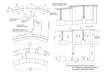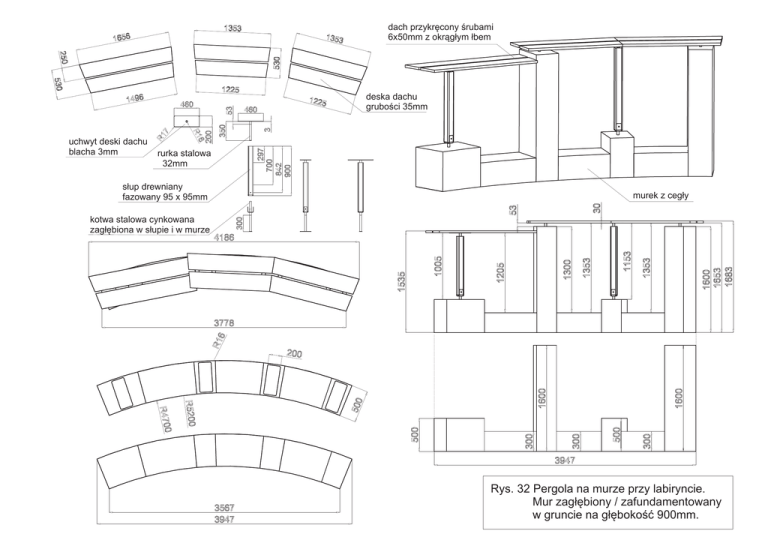 dach przykręcony śrubami 6x50mm z okrągłym łbem deska dachu grubości 35mm uchwyt deski dachu blacha 3mm rurka stalowa 32mm słup drewniany fazowany 95 x 95mm murek z cegły kotwa stalowa cynkowana zagłębiona w słupie i w murze Rys. 32 Pergola na murze przy labiryncie. Mur zagłębiony / zafundamentowany w gruncie na głębokość 900mm.