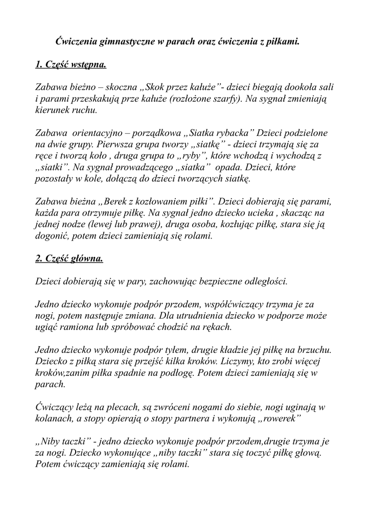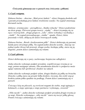 Ćwiczenia gimnastyczne w parach oraz ćwiczenia z piłkami. 1. Część wstępna. Zabawa bieżno – skoczna „Skok przez kałuże”- dzieci biegają dookoła sali i parami przeskakują prze kałuże (rozłożone szarfy). Na sygnał zmieniają kierunek ruchu. Zabawa orientacyjno – porządkowa „Siatka rybacka” Dzieci podzielone na dwie grupy. Pierwsza grupa tworzy „siatkę” - dzieci trzymają się za ręce i tworzą koło , druga grupa to „ryby”, które wchodzą i wychodzą z „siatki”. Na sygnał prowadzącego „siatka” opada. Dzieci, które pozostały w kole, dołączą do dzieci tworzących siatkę. Zabawa bieżna „Berek z kozłowaniem piłki”. Dzieci dobierają się parami, każda para otrzymuje piłkę. Na sygnał jedno dziecko ucieka , skacząc na jednej nodze (lewej lub prawej), druga osoba, kozłując piłkę, stara się ją dogonić, potem dzieci zamieniają się rolami. 2. Część główna. Dzieci dobierają się w pary, zachowując bezpieczne odległości. Jedno dziecko wykonuje podpór przodem, współćwiczący trzyma je za nogi, potem następuje zmiana. Dla utrudnienia dziecko w podporze może ugiąć ramiona lub spróbować chodzić na rękach. Jedno dziecko wykonuje podpór tyłem, drugie kładzie jej piłkę na brzuchu. Dziecko z piłką stara się przejść kilka kroków. Liczymy, kto zrobi więcej kroków,zanim piłka spadnie na podłogę. Potem dzieci zamieniają się w parach. Ćwiczący leżą na plecach, są zwróceni nogami do siebie, nogi uginają w kolanach, a stopy opierają o stopy partnera i wykonują „rowerek” „Niby taczki” - jedno dziecko wykonuje podpór przodem,drugie trzyma je za nogi. Dziecko wykonujące „niby taczki” stara się toczyć piłkę głową. Potem ćwiczący zamieniają się rolami. Dzieci stają na wprost siebie, uginają nogi w kolanach, piłkę umieszczają między stopami i podają do siebie. Podskoki – jedno dziecko stojąc na prawej nodze, wkłada piłkę w zgięcie drugiej nogi i wykonuje kilka podskoków, potem wykonuje to samo ćwiczenie na lewej nodze i oddaje piłkę współćwiczącemu. Ćwiczący siadają na wprost siebie i opierają stopy na piłce, nogi uginają w kolanach, ręce opierają z tyłu o podłogę. Na sygnał starają się palcami stóp zabrać piłkę do siebie. Ćwiczenia na drabinkach – próba podciągania się na rękach. 3. Część końcowa. Ćwiczenia oddechowe. Dzieci ustawione w rozsypce podnoszą ręce, wykonując wdech, podczas wydechu skaczą w przód. Omówienie ćwiczeń, które sprawiły dzieciom najwięcej trudności.