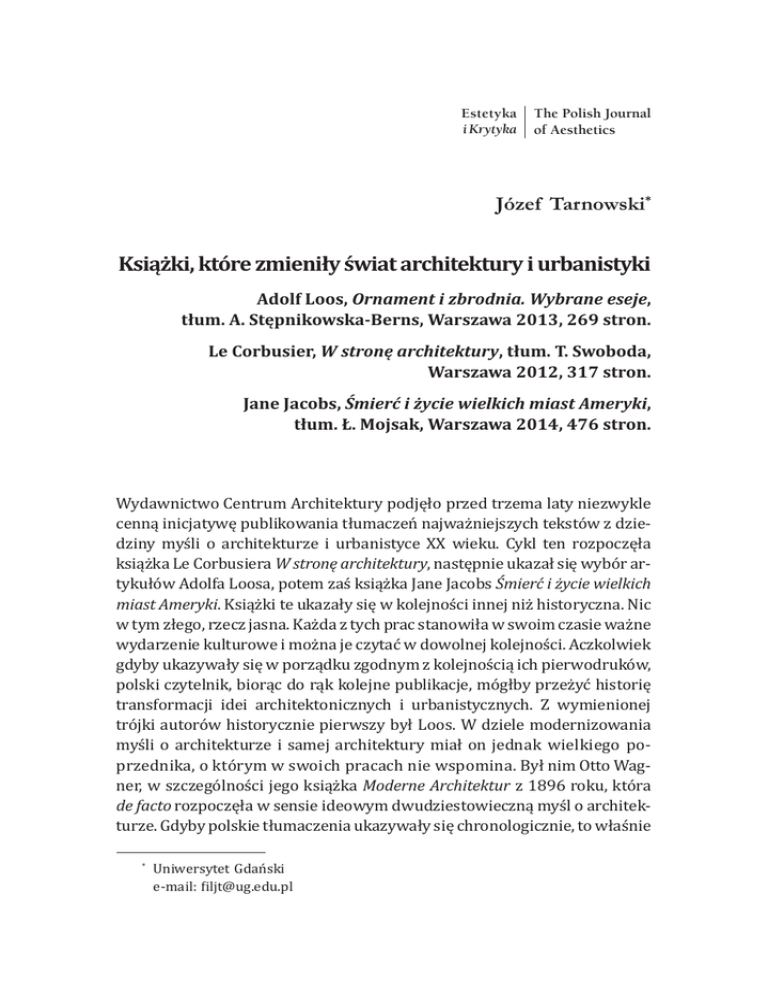 Estetyka i Krytyka The Polish Journal of Aesthetics Józef Tarnowski* Książki, które zmieniły świat architektury i urbanistyki Adolf Loos, Ornament i zbrodnia. Wybrane eseje, tłum. A. Stępnikowska-Berns, Warszawa 2013, 269 stron. Le Corbusier, W stronę architektury, tłum. T. Swoboda, Warszawa 2012, 317 stron. Jane Jacobs, Śmierć i życie wielkich miast Ameryki, tłum. Ł. Mojsak, Warszawa 2014, 476 stron. Wydawnictwo Centrum Architektury podjęło przed trzema laty niezwykle cenną inicjatywę publikowania tłumaczeń najważniejszych tekstów z dziedziny myśli o architekturze i urbanistyce XX wieku. Cykl ten rozpoczęła książka Le Corbusiera W stronę architektury, następnie ukazał się wybór artykułów Adolfa Loosa, potem zaś książka Jane Jacobs Śmierć i życie wielkich miast Ameryki. Książki te ukazały się w kolejności innej niż historyczna. Nic w tym złego, rzecz jasna. Każda z tych prac stanowiła w swoim czasie ważne wydarzenie kulturowe i można je czytać w dowolnej kolejności. Aczkolwiek gdyby ukazywały się w porządku zgodnym z kolejnością ich pierwodruków, polski czytelnik, biorąc do rąk kolejne publikacje, mógłby przeżyć historię transformacji idei architektonicznych i urbanistycznych. Z wymienionej trójki autorów historycznie pierwszy był Loos. W dziele modernizowania myśli o architekturze i samej architektury miał on jednak wielkiego poprzednika, o którym w swoich pracach nie wspomina. Był nim Otto Wagner, w szczególności jego książka Moderne Architektur z 1896 roku, która de facto rozpoczęła w sensie ideowym dwudziestowieczną myśl o architekturze. Gdyby polskie tłumaczenia ukazywały się chronologicznie, to właśnie * Uniwersytet Gdański e-mail: [email protected] 280 J ó z e f Ta r n o w s k i ta książka powinna się ukazać jako pierwsza (można żywić nadzieję, że wydawnictwo o niej nie zapomni). Loos nie powołuje się ani na to dzieło, ani na książkę Kunstgewerbe und Architektur Hermanna Muthesiusa, opublikowaną w 1907 roku, z której zaczerpnął pomysły do swego najgłośniejszego eseju-manifestu Ornament und Verbrechen z roku 1908. I znowu: gdyby tłumaczenia ukazywały się chronologicznie, dzieło to powinno być wydane jako drugie, bo rzeczony manifest Loosa jest nieco od niego późniejszy i wobec Muthesiusa wtórny. W przypadku Muthesiusa wydawnictwo zainteresowane wydaniem tłumaczenia jego książki może być w rozterce, gdyż dwa lata po wydaniu niemieckim ukazał się jej polski przekład i jest on dostępny w internecie. Jest to jednak tłumaczenie dość swobodne i chwiejne terminologicznie (piszę o tym w książce Wielki przełom), więc warto dzieło to opublikować ponownie, w nowym przekładzie. Przypadek zapewne sprawił, że w stosunkowo niewielkim odstępie czasu ukazały się dwa z czterech najważniejszych dzieł inicjujących formację, którą potem nazwano modernizmem (w architekturze i urbanistyce), a następnie historycznie pierwsze dzieło rozpoczynające kryzys tak rozumianego modernizmu i początek postmodernizmu. Podzielę się z czytelnikami kilkoma refleksjami, jakie nasunęły mi się przy ponownej lekturze tych książek. Najpierw Loos. W jego esejach – najbardziej w Ornamenice i zbrodni, ale w pozostałych także – na pierwszy plan wysuwa się pragnienie autora, by wywołać głęboką zmianę w architekturze i w poglądach na jej temat. Upragniona zmiana miała polegać na radykalnym zerwaniu z tradycją. Trudność takiego przedsięwzięcia w tamtych czasach polegała na tym, że tradycyjna architektura cieszyła się ogromnym uznaniem społecznym, a największe wówczas przedsięwzięcie architektoniczno-urbanistyczne Europy – wiedeńskie Ringstrasse – było w zaawansowanej fazie budowy: do jego zakończenia brakowało jeszcze tylko północno-zachodniego skrzydła Neue Burg pałacu Hofburg. Przeto aby wywołać zmianę, trzeba było wiedeńczykom taką architekturę po prostu obrzydzić. Trzeba ją było wyszydzić, spostponować i odsądzić od wartości. Kierunek takiej perswazji wskazał parę lat wcześniej Otto Wagner, określając architekturę tradycjonalistyczną, posługującą się historyzującymi dekoracjami, jako podobną do kostiumów wypożyczonych na bal maskaradowy. Loos poszedł w szyderstwie dalej: nazwał Ringstrasse „miastem Potiomkinowskim” (Potemkinsche Stadt). Wojownicze szyderstwo stało się bronią perswazyjną modernistów przeciwko tradycjonalistycznej architekturze i gustowi współczesnego społeczeństwa, które utożsamiało ją z architekturą w ogóle, w odróżnieniu od pozbawionego ornamentów budownictwa użytkowego. Szyderstwa K s i ą ż k i, k t ó r e z m i e n i ł y ś w i a t a r c h i t e k t u r y . . . 281 Wagnera i młodego Loosa przebił Muthesius, który w Kunstgewerbe und Architektur wykazał się wielką inwencją w wymyślaniu inwektyw pod adresem tradycjonalistycznej architektury. Stworzył tam istny katalog pocisków perswazyjnych do wykorzystywania w erystycznych bojach. Pierwszy skorzystał z niego właśnie Loos. Muthesius w porównaniu z Loosem był jednak niemal historiozofem. Swoją koncepcję architektury modern, czyli rzeczowej („modern ist sachlich”, jak pisał) ulokował na szpicy trendu, który dostrzegł w brytyjskiej sztuce użytkowej i architekturze. Miał on polegać na coraz silniejszym eliminowaniu dekoracji (ornamentu), aż do osiągniecia stanu, w którym forma danego obiektu jest wyznaczona wyłącznie przez jego funkcję i własności materiału. Muthesius znalazł nawet atrakcyjny literacki topos takiej postawy normatywnej w słowach wypowiedzianych przez królową, matkę Szekspirowskiego Hamleta, do Apoloniusza: „More matter with less art”, co znaczyło dla Muthesiusa tyle, co: „więcej rzeczowości (funkcjonalności), a mniej ozdobników”. Notabene, Mies van der Rohe sparafrazował to zdanie w paradoksalnej formule: „Less is more”, co potem Ro