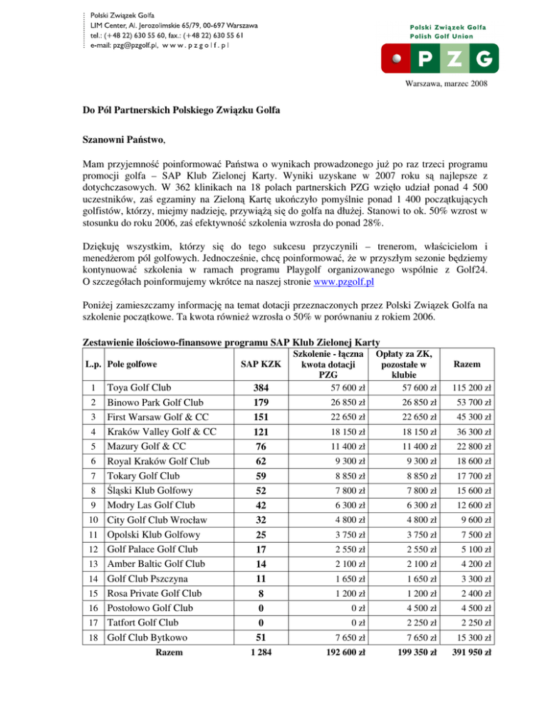 Warszawa, marzec 2008 Do Pól Partnerskich Polskiego Związku Golfa Szanowni Państwo, Mam przyjemność poinformować Państwa o wynikach prowadzonego już po raz trzeci programu promocji golfa – SAP Klub Zielonej Karty. Wyniki uzyskane w 2007 roku są najlepsze z dotychczasowych. W 362 klinikach na 18 polach partnerskich PZG wzięło udział ponad 4 500 uczestników, zaś egzaminy na Zieloną Kartę ukończyło pomyślnie ponad 1 400 początkujących golfistów, którzy, miejmy nadzieję, przywiążą się do golfa na dłużej. Stanowi to ok. 50% wzrost w stosunku do roku 2006, zaś efektywność szkolenia wzrosła do ponad 28%. Dziękuję wszystkim, którzy się do tego sukcesu przyczynili – trenerom, właścicielom i menedżerom pól golfowych. Jednocześnie, chcę poinformować, że w przyszłym sezonie będziemy kontynuować szkolenia w ramach programu Playgolf organizowanego wspólnie z Golf24. O szczegółach poinformujemy wkrótce na naszej stronie www.pzgolf.pl Poniżej zamieszczamy informację na temat dotacji przeznaczonych przez Polski Związek Golfa na szkolenie początkowe. Ta kwota również wzrosła o 50% w porównaniu z rokiem 2006. Zestawienie ilościowo-finansowe programu SAP Klub Zielonej Karty L.p. Pole golfowe 1 2 3 4 5 6 7 8 9 10 11 12 13 14 15 16 17 18 Toya Golf Club Binowo Park Golf Club First Warsaw Golf & CC Kraków Valley Golf & CC Mazury Golf & CC Royal Kraków Golf Club Tokary Golf Club Śląski Klub Golfowy Modry Las Golf Club City Golf Club Wrocław Opolski Klub Golfowy Golf Palace Golf Club Amber Baltic Golf Club Golf Club Pszczyna Rosa Private Golf Club Postołowo Golf Club Tatfort Golf Club Golf Club Bytkowo Razem SAP KZK 384 179 151 121 76 62 59 52 42 32 25 17 14 11 8 0 0 51 1 284 Szkolenie - łączna kwota dotacji PZG 57 600 zł Opłaty za ZK, pozostałe w klubie 57 600 zł 115 200 zł 26 850 zł 26 850 zł 53 700 zł 22 650 zł 22 650 zł 45 300 zł 18 150 zł 18 150 zł 36 300 zł 11 400 zł 11 400 zł 22 800 zł 9 300 zł 9 300 zł 18 600 zł 8 850 zł 8 850 zł 17 700 zł 7 800 zł 7 800 zł 15 600 zł 6 300 zł 6 300 zł 12 600 zł 4 800 zł 4 800 zł 9 600 zł 3 750 zł 3 750 zł 7 500 zł 2 550 zł 2 550 zł 5 100 zł 2 100 zł 2 100 zł 4 200 zł 1 650 zł 1 650 zł 3 300 zł 1 200 zł 1 200 zł 2 400 zł 0 zł 4 500 zł 4 500 zł 0 zł 2 250 zł 2 250 zł 7 650 zł 7 650 zł 15 300 zł 192 600 zł 199 350 zł 391 950 zł Razem Podobnie jak w ubiegłym roku, przewidziane są specjalne premie finansowe dla najlepszych trenerów. Premia za wyszkolenie z sukcesem ponad 200 nowych golfistów wynosi 3 000 zł zaś wyszkolenie od 100 do 200 nowych golfistów jest premiowane kwotą 2 000 zł. Dodatkowo, trenerzy, którzy wyszkolili ponad 50 nowych golfistów otrzymają premie w wysokości 1 000 zł. Trenerzy, którzy otrzymują premie specjalne za wyróżniające wyniki w 2007 Zielone Karty Lp Pole golfowe Kwota Trener 1 Toya Golf Club 247 Tomasz Burandt 3 000 zł 2 First Warsaw Golf & Country Club 184 David Ekberg 2 000 zł 3 Binowo Park Golf Club 179 Gavin Long 2 000 zł 4 Toya Golf Club 147 Richard Hughes 2 000 zł 5 Tokary Golf Club 122 Wacław Laszkiewicz 2 000 zł 6 Kraków Valley Golf & Country Club 121 Maciej Wojdyński 2 000 zł 7 Royal Kraków Golf Club 71 Wiesław Klima 1 000 zł 8 Mazury Golf & CC 60 Katarzyna Nieciak 1 000 zł 9 Śląski Klub Golfowy 52 Jan Lubieniecki 1 000 zł 10 Golf Club Bytkowo 51 Mike O'Brien 1 000 zł Razem 17 000 zł 1 234 Jeszcze raz bardzo dziękuję w imieniu własnym i zarządu PZG. Życzę powodzenia w nadchodzącym sezonie 2008. Z poważaniem, Piotr Mondalski Prezes Zarządu Polski Związek Golfa Otrzymują: 1 Amber Baltic Golf Club 7 Golf Palace Golf Club 13 Rosa Private Golf Club 2 Binowo Park Golf Club 8 Kraków Valley Golf & CC 14 Royal Kraków Golf Club 3 City Golf Club Wrocław 9 Mazury Golf & CC 15 Śląski Klub Golfowy 4 First Warsaw Golf & CC 10 Modry Las Golf Club 16 Tatfort Golf Club 5 Golf Club Bytkowo 11 Opolski Klub Golfowy 17 Tokary Golf Club 6 Golf Club Pszczyna 12 Postołowo Golf Club 18 Toya Golf Club