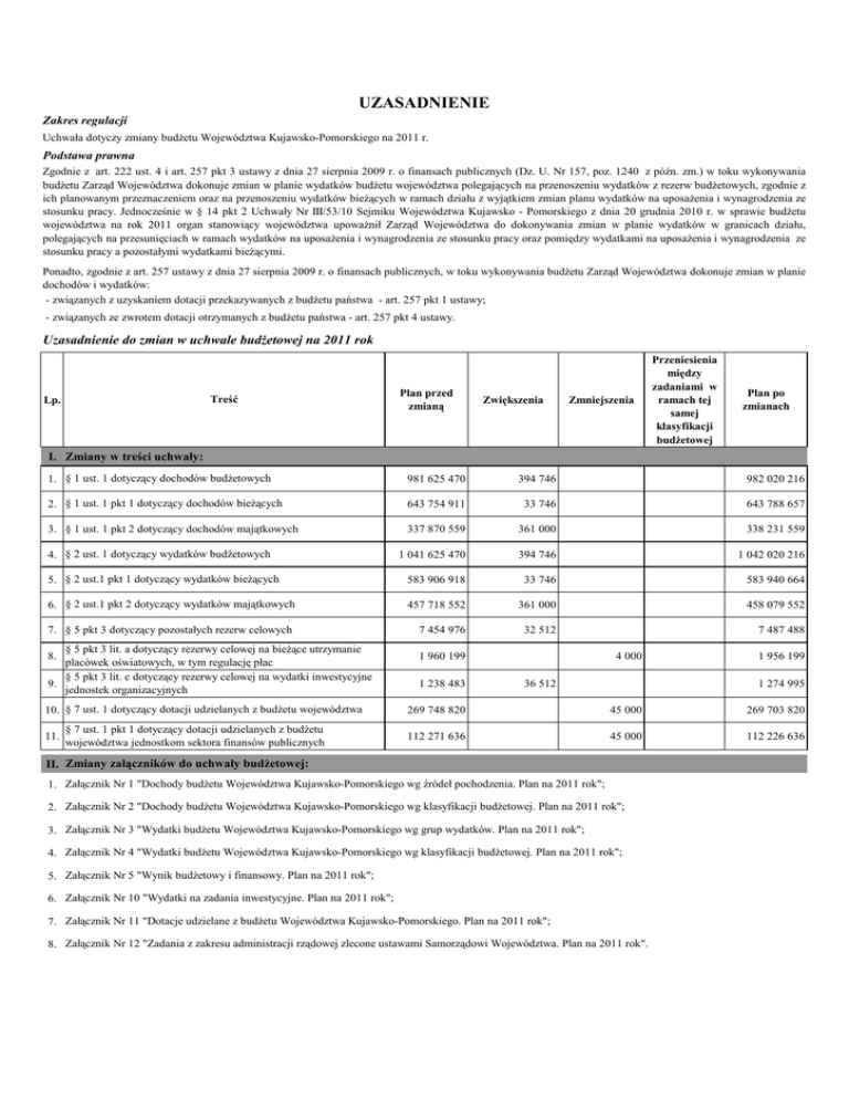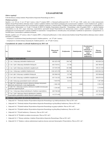 UZASADNIENIE Zakres regulacji Uchwała dotyczy zmiany budŜetu Województwa Kujawsko-Pomorskiego na 2011 r. Podstawa prawna Zgodnie z art. 222 ust. 4 i art. 257 pkt 3 ustawy z dnia 27 sierpnia 2009 r. o finansach publicznych (Dz. U. Nr 157, poz. 1240 z późn. zm.) w toku wykonywania budŜetu Zarząd Województwa dokonuje zmian w planie wydatków budŜetu województwa polegających na przenoszeniu wydatków z rezerw budŜetowych, zgodnie z ich planowanym przeznaczeniem oraz na przenoszeniu wydatków bieŜących w ramach działu z wyjątkiem zmian planu wydatków na uposaŜenia i wynagrodzenia ze stosunku pracy. Jednocześnie w § 14 pkt 2 Uchwały Nr III/53/10 Sejmiku Województwa Kujawsko - Pomorskiego z dnia 20 grudnia 2010 r. w sprawie budŜetu województwa na rok 2011 organ stanowiący województwa upowaŜnił Zarząd Województwa do dokonywania zmian w planie wydatków w granicach działu, polegających na przesunięciach w ramach wydatków na uposaŜenia i wynagrodzenia ze stosunku pracy oraz pomiędzy wydatkami na uposaŜenia i wynagrodzenia ze stosunku pracy a pozostałymi wydatkami bieŜącymi. Ponadto, zgodnie z art. 257 ustawy z dnia 27 sierpnia 2009 r. o finansach publicznych, w toku wykonywania budŜetu Zarząd Województwa dokonuje zmian w planie dochodów i wydatków: - związanych z uzyskaniem dotacji przekazywanych z budŜetu państwa - art. 257 pkt 1 ustawy; - związanych ze zwrotem dotacji otrzymanych z budŜetu państwa - art. 257 pkt 4 ustawy. Uzasadnienie do zmian w uchwale budŜetowej na 2011 rok Treść Lp. Plan przed zmianą Zwiększenia Zmniejszenia Przeniesienia między zadaniami w ramach tej samej klasyfikacji budŜetowej Plan po zmianach I. Zmiany w treści uchwały: 1. § 1 ust. 1 dotyczący dochodów budŜetowych 981 625 470 394 746 982 020 216 2. § 1 ust. 1 pkt 1 dotyczący dochodów bieŜących 643 754 911 33 746 643 788 657 3. § 1 ust. 1 pkt 2 dotyczący dochodów majątkowych 337 870 559 361 000 338 231 559 1 041 625 470 394 746 1 042 020 216 5. § 2 ust.1 pkt 1 dotyczący wydatków bieŜących 583 906 918 33 746 583 940 664 6. § 2 ust.1 pkt 2 dotyczący wydatków majątkowych 457 718 552 361 000 458 079 552 7. § 5 pkt 3 dotyczący pozostałych rezerw celowych 7 454 976 32 512 7 487 488 4. § 2 ust. 1 dotyczący wydatków budŜetowych § 5 pkt 3 lit. a dotyczący rezerwy celowej na bieŜące utrzymanie placówek oświatowych, w tym regulację płac § 5 pkt 3 lit. c dotyczący rezerwy celowej na wydatki inwestycyjne 9. jednostek organizacyjnych 8. 10. § 7 ust. 1 dotyczący dotacji udzielanych z budŜetu województwa 11. § 7 ust. 1 pkt 1 dotyczący dotacji udzielanych z budŜetu województwa jednostkom sektora finansów publicznych 1 960 199 1 238 483 4 000 36 512 1 956 199 1 274 995 269 748 820 45 000 269 703 820 112 271 636 45 000 112 226 636 II. Zmiany załączników do uchwały budŜetowej: 1. Załącznik Nr 1 "Dochody budŜetu Województwa Kujawsko-Pomorskiego wg źródeł pochodzenia. Plan na 2011 rok"; 2. Załącznik Nr 2 "Dochody budŜetu Województwa Kujawsko-Pomorskiego wg klasyfikacji budŜetowej. Plan na 2011 rok"; 3. Załącznik Nr 3 "Wydatki budŜetu Województwa Kujawsko-Pomorskiego wg grup wydatków. Plan na 2011 rok"; 4. Załącznik Nr 4 "Wydatki budŜetu Województwa Kujawsko-Pomorskiego wg klasyfikacji budŜetowej. Plan na 2011 rok"; 5. Załącznik Nr 5 "Wynik budŜetowy i finansowy. Plan na 2011 rok"; 6. Załącznik Nr 10 "Wydatki na zadania inwestycyjne. Plan na 2011 rok"; 7. Załącznik Nr 11 "Dotacje udzielane z budŜetu Województwa Kujawsko-Pomorskiego. Plan na 2011 rok"; 8. Załącznik Nr 12 "Zadania z zakresu administracji rządowej zlecone ustawami Samorządowi Województwa. Plan na 2011 rok". Treść Lp. III. Plan przed zmianą Zwiększenia Przeniesienia między zadaniami w ramach tej samej klasyfikacji budŜetowej Zmniejszenia Plan po zmianach Dochody OGÓŁEM 010 Rolnictwo i łowiectwo 01078 Usuwanie skutków klęsk Ŝywiołowych 981 625 470 404 746 10 000 0 982 020 216 82 700 717 361 000 0 0 83 061 717 6 557 000 361 000 0 0 6 918 000 Zwiększa się planowane dochody z tytułu dotacji celowych z budŜetu państwa w związku Decyzją Wojewody Kujawsko-Pomorskiego Nr WFB.I.3120.57.2011 z dnia 27 września 2011 r. o zwiększeniu planu dotacji celowych o kwotę 361.000 zł na realizację zadań pn. "Przepompownia Przechowo naprawa szkód powstałych w wyniku działania powodzi 2010 r." oraz "Usuwanie skutków powodzi z maja i czerwca 2010 r. - przepust wałowy przy stacji pomp Chełmno w km 20+033 wału przeciwpowodziowego Podmiejskiej Niziny Chełmińskiej, gmina Chełmno, powiat Chełmno". 150 Przetwórstwo przemysłowe 15011 Rozwój przedsiębiorczości 567 883 43 746 0 0 611 629 2 045 43 746 0 0 45 791 Zwiększa się planowane dochody własne województwa łącznie o kwotę 43.746 zł, w tym: - o kwotę 43.457 zł, z tytułu zwrotu dotacji wykorzystanych niezgodnie z przeznaczeniem lub pobranych w nadmiernej wysokości przez Beneficjenta Zintegrowanego Programu Operacyjnego Rozwoju Regionalnego, Działania 2.6; - o kwotę 289 zł, z tytułu zwrotu odsetek od dotacji wykorzystanych niezgodnie z przeznaczeniem lub pobranych w nadmiernej wysokości przez Beneficjenta Regionalnego Programu Operacyjnego WK-P, Działania 5.2. 853 Pozostałe zadania w zakresie polityki społecznej 85332 Wojewódzkie urzędy pracy 2 807 925 0 10 000 0 2 797 925 2 209 933 0 10 000 0 2 199 933 Zmniejsza się planowane dochody z tytułu dotacji celowych z budŜetu państwa w związku Decyzją Wojewody Kujawsko-Pomorskiego Nr WFB.I.3120.57.2011 z dnia 27 września 2011 r. o zmniejszeniu planu dotacji celowych o kwotę 10.000 zł po dokonaniu analizy kosztów przeprowadzonej w 2011 r. kwalifikacji wojskowej. IV. Wydatki OGÓŁEM 010 Rolnictwo i łowiectwo 01041 Program Rozwoju Obszarów Wiejskich 2007-2013 1 041 625 470 1 289 807 895 061 135 344 1 042 020 216 90 736 639 412 373 51 373 0 91 097 639 7 933 420 51 373 51 373 0 7 933 420 Dokonuje się 