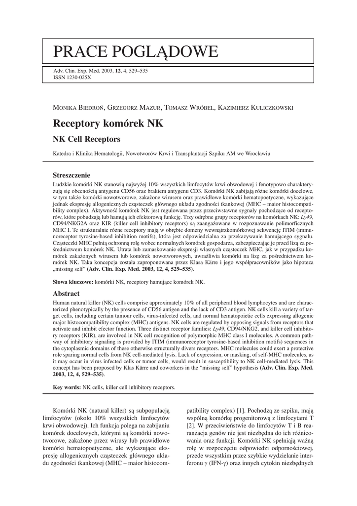PRACE POGLĄDOWE Adv. Clin. Exp. Med. 2003, 12, 4, 529–535 ISSN 1230−025X MONIKA BIEDROŃ, GRZEGORZ MAZUR, TOMASZ WRÓBEL, KAZIMIERZ KULICZKOWSKI Receptory komórek NK NK Cell Receptors Katedra i Klinika Hematologii, Nowotworów Krwi i Transplantacji Szpiku AM we Wrocławiu Streszczenie Ludzkie komórki NK stanowią najwyżej 10% wszystkich limfocytów krwi obwodowej i fenotypowo charaktery− zują się obecnością antygenu CD56 oraz brakiem antygenu CD3. Komórki NK zabijają różne komórki docelowe, w tym także komórki nowotworowe, zakażone wirusem oraz prawidłowe komórki hematopoetyczne, wykazujące jednak ekspresję allogenicznych cząsteczek głównego układu zgodności tkankowej (MHC – maior histocompati− bility complex). Aktywność komórek NK jest regulowana przez przeciwstawne sygnały pochodzące od recepto− rów, które pobudzają lub hamują ich efektorową funkcję. Trzy odrębne grupy receptorów na komórkach NK: Ly49, CD94/NKG2A oraz KIR (killer cell inhibitory receptors) są zaangażowane w rozpoznawanie polimorficznych MHC I. Te strukturalnie różne receptory mają w obrębie domeny wewnątrzkomórkowej sekwencję ITIM (immu− noreceptor tyrosine−based inhibition motifs), która jest odpowiedzialna za przekazywanie hamującego sygnału. Cząsteczki MHC pełnią ochronną rolę wobec normalnych komórek gospodarza, zabezpieczając je przed lizą za po− średnictwem komórek NK. Utrata lub zamaskowanie ekspresji własnych cząsteczek MHC, jak w przypadku ko− mórek zakażonych wirusem lub komórek nowotworowych, uwrażliwia komórki na lizę za pośrednictwem ko− mórek NK. Taka koncepcja została zaproponowana przez Klasa Kärre i jego współpracowników jako hipoteza „missing self” (Adv. Clin. Exp. Med. 2003, 12, 4, 529–535). Słowa kluczowe: komórki NK, receptory hamujące komórek NK. Abstract Human natural killer (NK) cells comprise approximately 10% of all peripheral blood lymphocytes and are charac− terized phenotypically by the presence of CD56 antigen and the lack of CD3 antigen. NK cells kill a variety of tar− get cells, including certain tumour cells, virus−infected cells, and normal hematopoietic cells expressing allogenic major histocompatibility complex (MHC) antigens. NK cells are regulated by opposing signals from receptors that activate and inhibit efector function. Three distinct receptor families: Ly49, CD94/NKG2, and killer cell inhibito− ry receptors (KIR), are involved in NK cell recognition of polymorphic MHC class I molecules. A common path− way of inhibitory signaling is provided by ITIM (immunoreceptor tyrosine−based inhibition motifs) sequences in the cytoplasmic domains of these otherwise structurally divers receptors. MHC molecules could exert a protective role sparing normal cells from NK cell−mediated lysis. Lack of expression, or masking, of self−MHC molecules, as it may occur in virus infected cells or tumor cells, would result in susceptibility to NK cell−mediated lysis. This concept has been proposed by Klas Kärre and coworkers in the “missing self” hypothesis (Adv. Clin. Exp. Med. 2003, 12, 4, 529–535). Key words: NK cells, killer cell inhibitory receptors. Komórki NK (natural killer) są subpopulacją limfocytów (około 10% wszystkich limfocytów krwi obwodowej). Ich funkcja polega na zabijaniu komórek docelowych, którymi są komórki nowo− tworowe, zakażone przez wirusy lub prawidłowe komórki hematopoetyczne, ale wykazujące eks− presję allogenicznych cząsteczek głównego ukła− du zgodności tkankowej (MHC – maior histocom− patibility complex) [1]. Pochodzą ze szpiku, mają wspólną komórkę progenitorową z limfocytami T [2]. W przeciwieństwie do limfocytów T i B rea− ranżacja genów nie jest niezbędna do ich różnico− wania oraz funkcji. Komórki NK spełniają ważną rolę w rozpoczęciu odpowiedzi odpornościowej, przede wszystkim przez szybkie wydzielanie inter− feronu γ (IFN−γ) oraz innych cytokin niezbędnych 530 w odpowiedzi na zakażenie bakteryjne, wirusowe i parazytologiczne [3, 4]. Funkcja komórek NK jest regulowana przez przeciwstawne sygnały pochodzące od recepto− rów, które pobudzają lub hamują czynność tych komórek [5–7]. Czynniki odpowiedzialne za akty− wację komórek w czasie zakażenia pozostają nie− uchwytne, ale prawdopodobnie są to: interferony α/β, cytokiny, np. czynnik martwicy nowotworów (TNF−α – tumor necrosis factor alpha), interleuki− ny (IL−12, IL−15) i inne. Odpowiadają one w ta− kim samym stopniu jak cząsteczki związane z po− wierzchnią komórek w otaczających tkankach [8]. Jak dotąd nie udało się wykazać swoistych dla ko− mórek NK receptorów odpowiedzialnych za roz− poczęcie cytolizy, ale komórki NK mogą być akty− wowane przez działanie wielu receptorów błono− wych, jak np. CD2, CD16, CD69 czy NKR−P1 (natural killer receptor−P1) [9–11]. Swoistość działania jest zapewniona przez hamujące sygnały pochodzące od receptorów dla cząsteczek główne− go układu zgodności tkankowej człowieka klasy I (HLA I – human leukocyte antigens class I). Trzy odrębne grupy receptorów są zaangażowane w rozpoznawanie polimorficznych cząstek HLA−I: Ly49, CD94/NKG2 i KIR (killer cell inhibitory re− ceptor). W tych trzech różnych strukturalnie re− ceptorach droga przekazywania hamującego sy− gnału jest taka sama. Odbywa się za pośrednic− twem sekwencji ITIM (immunoreceptor tyrosine− −based inhibitory motif) zlokalizowanej w dome− nie cytoplazmatycznej tych receptorów. Po zwią− zaniu ligandu i aktywacji hamujących receptorów na komórkach NK dochodzi do fosforylacji tyro− zyny (za pośrednictwem fosfataz tyrozyny, SHP−1 i prawdopodobnie SHP−2), co hamuje cytoto− ksyczność i wytwarzanie cytokin za pośrednic− twem komórek NK. Istnieją sugestie, że hamujące receptory na komórkach NK należą do w