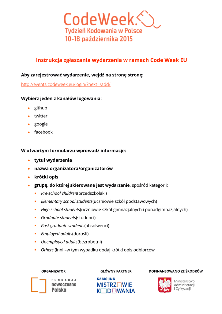 Instrukcja zgłaszania wydarzenia w ramach Code Week EU Aby zarejestrować wydarzenie, wejdź na stronę stronę: http://events.codeweek.eu/login/?next=/add/ Wybierz jeden z kanałów logowania: github twitter google facebook W otwartym formularzu wprowadź informacje: tytuł wydarzenia nazwa organizatora/organizatorów krótki opis grupę, do której skierowane jest wydarzenie, spośród kategorii: Pre-school children(przedszkolaki) Elementary school students(uczniowie szkół podstawowych) High school students(uczniowie szkół gimnazjalnych i ponadgimnazjalnych) Graduate students(studenci) Post graduate students(absolwenci) Employed adults(dorośli) Unemployed adults(bezrobotni) Others (inni –w tym wypadku dodaj krótki opis odbiorców ORGANIZATOR GŁÓWNY PARTNER DOFINANSOWANO ZE ŚRODKÓW temat przewodni wydarzenia spośród: Basic programming concept(podstawy programowania) Web development(tworzenie stron internetowych) Native mobile app development(aplikacje mobilne) Other software development(programowanie -inne) Data manipulation and visualisation(obróbka danych i wizualizacja) Robotics (robotyka) Hardware(sprzęt komputerowy) Other (inny) –umieść informacje o temaciew opisie wydarzenia miejsce wydarzenia czas wydarzenia–początek i koniec Opcjonalnie możesz umieścić: adres swojej strony internetowej kontaktowy adres mailowy tagi (słowa kluczowe dla twojego wydarzenia) Będziesz także proszony o podanie adresu mailowego na potrzeby rejestracji wydarzenia – będzie on dostępny tylko dla Ambasadorów Tygodnia Kodowania. Pamiętaj, że jeśli chcesz zorganizować kilkudniowe warsztaty albo organizujesz kilka grup dla różnych uczestników tego samego dnia – warto je zgłosić jako oddzielne wydarzenia. Po zaakceptowaniu Twojego zgłoszenia przez Ambasadora, Twoje wydarzenie pojawi się na mapie na stronach www.codeweek.euoraz www.codeweek.org.pl. ORGANIZATOR GŁÓWNY PARTNER DOFINANSOWANO ZE ŚRODKÓW