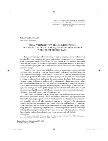 ACTA UNIVERSITATIS WRATISLAVIENSIS ———————— No 3066 ———————— PRZEGLĄD PRAWA I ADMINISTRACJI LXXVIII WROCŁAW 2008 JOLANTA BLICHARZ Uniwersytet Wrocławski ROLA PARTNERSTWA TRÓJSEKTOROWEGO W RAMACH NOWEGO ZARZĄDZANIA PUBLICZNEGO A PROBLEM BIUROKRACJI Zakres problematyki sformułowanej w tytule obejmuje dwie podstawowe kwestie. Pierwsza związana jest z rolą partnerstwa trójsektorowego w ramach nowego zarządzania publicznego. Druga dotyczy biurokracji, jej wpływu na rozwój instytucji zarządzania uczestniczącego (trójsektorowego) w Polsce. W podsumowaniu zawarte są uwagi na temat skuteczności i efektywności modelu zarządzania uczestniczącego. Pytanie o rolę partnerstwa trójsektorowego w ramach nowego zarządzania publicznego to pytanie o celowość i użyteczność budowania mechanizmów zarządzania uczestniczącego. Problematyka ta jest ściśle uwarunkowana modelem ustrojowym państwa. Tworzenie systemu opartego na mechanizmie rynkowym wymaga od administracji publicznej dostosowania jej działania do konieczności rozwiązywania problemów społecznych wynikających z funkcjonowania rynku. Bez wątpienia bowiem jest fakt, że dzisiejszą administrację publiczną cechują: wzrost zadań administracyjnych, wkraczanie prawa prywatnego w dziedzinę tradycyjnie należącą do prawa publicznego, wprowadzanie elementów rynkowych do administracji publicznej, a także budowanie mechanizmów zarządzania uczestniczącego w ramach partnerstwa trójsektorowego. Partnerstwo trójsektorowe jest jednym z procesów charakteryzujących nowe zarządzanie publiczne. Termin „nowe zarządzanie publiczne” opisuje typ reform administracyjnych podejmowanych w myśl działania mechanizmów i instrumentów charakterystycznych dla organizacji sektora prywatnego1. Dla niektórych teoretyków integrowanie działań wszystkich sektorów (publicznego, prywatnego, pozarządowego) na rzecz realizacji odpowiednich usług stanowi kryzys legitymacji państwa. Argumentuje się bowiem, że oparcie systemu zlecania i realizacji zadań publicznych przez podmioty prywatne może spowodować redukcję zakresu funkcji państwa jako bezpośredniego wykonawcy rozmaitych funkcji. 1 Szerzej w tej kwestii: S. Mazur, Historia administracji publicznej, [w:] Administracja publiczna, pod red. J. Hausnera, Warszawa 2005, s. 58 i n. Przegląd Prawa i Administracji 78, 2008 © for this edition by CNS druk_kor_PPiA.indd 7 2008-10-24 11:46:25 8 JOLANTA BLICHARZ Należy zauważyć, iż w ostatnim okresie stosowane w ramach polskiej gospodarki rynkowej tzw. partnerstwa trójsektorowe, odpowiadające programowi Public-Private Partnerships nawiązują do systemu zakładającego współpracę sektora publicznego i prywatnego przy finansowaniu wielkich inwestycji. W trybie obowiązujących przepisów ustawy z dnia 28 lipca 2005 r. o partnerstwie publiczno-prywatnym2 przez partnerstwo publiczno-prywatne rozumie się współpracę podmiotu publicznego i partnera prywatnego (np. przedsiębiorcy, organizacji pozarządowej). Oparta ona jest na ustawie, w której partner prywatny zobowiązuje się wobec podmiotu publicznego do wykonania przedsięwzięcia za wynagrodzeniem polegającym na: wypłacie sumy pieniężnej lub na prawie pobierania pożytków czy odnoszeniu korzyści z wykonanego zadania (art. 4 pkt 7). Partner prywatny ma też ponosić w całości lub w części nakłady na wykonanie zadania – art. 2. W ustawie zastrzeżono, że partnerstwo publiczno-prywatne jest możliwe wtedy, gdy przyniesie ono korzyści dla interesu publicznego, przeważające w stosunku do korzyści wynikających z tych sposobów realizacji zadań. Korzyścią dla interesu publicznego jest w szczególności: oszczędność w wydatkach podmiotu publicznego, podniesienie standardu świadczonych usług, a także obniżenie uciążliwości dla otoczenia (art. 3). Ogólnie można przyjąć, że prywatni inwestorzy angażują się długoterminowo w realizację publicznych inwestycji, a także biorą udział w świadczeniu publicznych usług. Strony dzielą się odpowiedzialnością, kosztami i zyskami. Wspólną cechą koncepcji zarządzania trójsektorowego jest przekonanie, że instrumenty zarządzania stosowane w prawie prywatnym mogą być skutecznie wykorzystane również w sektorze publicznym (podejście rynkowe). W szczególności takie podejście może budzić wątpliwości, jeśli się zważy odmienny charakter obu sektorów. W odróżnieniu od sektora prywatnego, którego istota leży w generowaniu zysku, cele administracji publicznej (sektora publicznego) determinowane są interesem publicznym (dobrem ogółu). W literaturze wskazuje się na negatywne konsekwencje zastosowania instrumentów rynkowych w sektorze publicznym. Podnosi się, iż mogą one przyczynić się do obniżenia poziomu usług i ograniczenia ich dostępności. Nadto przyjmuje się, iż każda działalność zorientowana na osiąganie zysku, nawet wtedy, gdy jej celem jest osiągnięcie efektywności w sferze realizacji zadań publicznych jest po prostu interesem, a nie partnerstwem w ścisłym tego słowa znaczeniu. Kwestią sporną pozostaje również to, czy rozwijanie partnerstwa w duchu nowego zarządzania publicznego nie będzie prowadziło do zachowań korupcjogennych, a przynajmniej nieefektywności przedsięwzięć. Ponadto udział organizacji pozarządowych w ramach partnerstwa publiczno-prywatnego może upodobnić je do biznesu w warunkach rynkowej konkurencji. 2 Dz.U. Nr 169, poz. 1420. Przegląd Prawa i Administracji 78, 2008 © for this edition by CNS druk_kor_PPiA.indd 8 2008-10-24 11:46:25 ROLA PARTNERSTWA TRÓJSEKTOROWEGO 9 Niemniej jednak można także przytoczyć argumenty wskazujące na pozytywny wpływ instytucji partnerstwa trójsektorowego w systemie świadczenia dóbr i usług. Po pierwsze, instytucja partnerstwa trójsektorowego stwarza możliwości podziału odpowiedzialności między sektor publiczny, prywatny i pozar