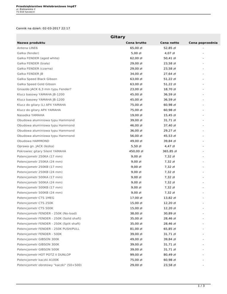 Przedsiębiorstwo Wielobranżowe ImpET ul. Białowieska 2 71-010 Szczecin Cennik na dzień: 02-03-2017 22:17 Gitary Nazwa produktu Cena brutto Cena netto Cena poprzednia Antena LINE6 65,00 zł 52,85 zł - Gałka (fender) 5,00 zł 4,07 zł - Gałka FENDER (aged white) 62,00 zł 50,41 zł - Gałka FENDER (biała) 29,00 zł 23,58 zł - Gałka FENDER (czarna) 29,00 zł 23,58 zł - Gałka FENDER JB 34,00 zł 27,64 zł - Gałka Speed Black Gibson 63,00 zł 51,22 zł - Gałka Speed Gold Gibson 63,00 zł 51,22 zł - Gniazdo JACK 6,3 mm typu Fender? 23,00 zł 18,70 zł - Klucz basowy YAMAHA JB-1200 45,00 zł 36,59 zł - Klucz basowy YAMAHA JB-1200 45,00 zł 36,59 zł - Klucz do gitary (L) APX YAMAHA 75,00 zł 60,98 zł - Klucz do gitary APX YAMAHA 75,00 zł 60,98 zł - Nasadka YAMAHA 19,00 zł 15,45 zł - Obudowa aluminiowa typu Hammond 39,00 zł 31,71 zł - Obudowa aluminiowa typu Hammond 46,00 zł 37,40 zł - Obudowa aluminiowa typu Hammond 36,00 zł 29,27 zł - Obudowa aluminiowa typu Hammond 56,00 zł 45,53 zł - Obudowa HAMMOND 49,00 zł 39,84 zł - 5,50 zł 4,47 zł - Oprawa gn. JACK (łezka) Pokrowiec gitary Silent YAMAHA 450,00 zł 365,85 zł - Potencjometr 250KA (17 mm) 9,00 zł 7,32 zł - Potencjometr 250KA (24 mm) 9,00 zł 7,32 zł - Potencjometr 250KB (17 mm) 9,00 zł 7,32 zł - Potencjometr 250KB (24 mm) 9,00 zł 7,32 zł - Potencjometr 500KA (17 mm) 9,00 zł 7,32 zł - Potencjometr 500KA (24 mm) 9,00 zł 7,32 zł - Potencjometr 500KB (17 mm) 9,00 zł 7,32 zł - Potencjometr 500KB (24 mm) 9,00 zł 7,32 zł - Potencjometr CTS 1MEG 17,00 zł 13,82 zł - Potencjometr CTS 250K 15,00 zł 12,20 zł - Potencjometr CTS 500K 15,00 zł 12,20 zł - Potencjometr FENDER - 250K (No-load) 38,00 zł 30,89 zł - Potencjometr FENDER - 250K (Solid shaft) 35,00 zł 28,46 zł - Potencjometr FENDER - 250K (Split shaft) 35,00 zł 28,46 zł - Potencjometr FENDER - 250K PUSH/PULL 81,00 zł 65,85 zł - Potencjometr FENDER - 500K 39,00 zł 31,71 zł - Potencjometr GIBSON 300K 49,00 zł 39,84 zł - Potencjometr GIBSON 300K 39,00 zł 31,71 zł - Potencjometr GIBSON 500K 39,00 zł 31,71 zł - Potencjometr HOT POTZ II DUNLOP 99,00 zł 80,49 zł - Potencjometr kaczki A100K 75,00 zł 60,98 zł - Potencjometr obrotowy "kaczki" (50+500) 29,00 zł 23,58 zł - 1/3 Przedsiębiorstwo Wielobranżowe ImpET ul. Białowieska 2 71-010 Szczecin Progi gitarowe 39,00 zł 31,71 zł - Progi gitarowe 39,00 zł 31,71 zł - Progi gitarowe 39,00 zł 31,71 zł - Progi gitarowe 39,00 zł 31,71 zł - Progi gitarowe FENDER (jumbo) 62,00 zł 50,41 zł - Progi gitarowe FENDER (standard) 62,00 zł 50,41 zł - Progi gitarowe FENDER (vintage) 62,00 zł 50,41 zł - Prowadnica potencjometru kaczki 9,90 zł 8,05 zł - Przedwzmacniacz systemu M55T YAMAHA 450,00 zł 365,85 zł - Przedwzmacniacz systemu M56C YAMAHA 620,00 zł 504,07 zł - 31,00 zł 25,20 zł - Przetwornik do git. bas. SEYMOUR DUNCAN SJB-1 295,00 zł 239,84 zł - Przetwornik gitar. HB DiMarzio DUAL SOUND 360,00 zł 292,68 zł - Przetwornik gitar. HB SEYMOUR DUNCAN SH-11B CUSTOM CUSTOM 429,00 zł 348,78 zł - Przetwornik gitar. HB SEYMOUR DUNCAN SH-1B 439,00 zł 356,91 zł - Przetwornik gitar. HB SEYMOUR DUNCAN SH-2N 389,00 zł 316,26 zł - Przetwornik gitar. HB SEYMOUR DUNCAN SH-4 389,00 zł 316,26 zł - Przetwornik gitar. HB SEYMOUR DUNCAN SH-8B INVADER 419,00 zł 340,65 zł - Przetwornik gitar. HB SEYMOUR DUNCAN SH-8N INVADER 419,00 zł 340,65 zł - Przetwornik gitar. SINGLE SEYMOUR DUNCAN SHR-1 390,00 zł 317,07 zł - Przetwornik HB DiMarzio EVOLUTION bridge 360,00 zł 292,68 zł - Przetwornik HB DiMarzio PAF Pro 360,00 zł 292,68 zł - Przetwornik HB DiMarzio THE BREED bridge 360,00 zł 292,68 zł - Przetwornik HUMBUCKER 60,00 zł 48,78 zł - Przetwornik HUMBUCKER bridge 44,00 zł 35,77 zł - Przetwornik HUMBUCKER neck 44,00 zł 35,77 zł - Przetwornik piezo 65,00 zł 52,85 zł - Przetwornik piezo LINE6 65,00 zł 52,85 zł - Przetwornik SINGLE SP040 20,00 zł 16,26 zł - Przetwornik SINGLE SP041 20,00 zł 16,26 zł - Przetwornik SINGLE ST-6 40,00 zł 32,52 zł - Przełącznik 3 poz. uchylny GIBSON 74,00 zł 60,16 zł - Przełącznik 3 poz. uchylny GIBSON 74,00 zł 60,16 zł - Przełącznik FOOT SWITCH DUNLOP 65,00 zł 52,85 zł - Przełącznik footswitch 3PDT EHX 19,00 zł 15,45 zł - Przełącznik ślizgowy - 3 poz. 20,00 zł 16,26 zł - Przełącznik ślizgowy - 5 poz. 21,00 zł 17,07 zł - Przełącznik ślizgowy FENDER - 3 poz. 52,00 zł 42,28 zł - Przełącznik ślizgowy FENDER - 4 poz. 59,00 zł 47,97 zł - Przełącznik ślizgowy FENDER - 5 poz. 59,00 zł 47,97 zł - Przełącznik ślizgowy SCHALLER - 3 poz. 53,00 zł 43,09 zł - Przełącznik ślizgowy SCHALLER - 5 poz. 55,00 zł 44,72 zł - Przełącznik uchylny - 3 poz. 32,50 zł 26,42 zł - Przetwornik do git. bas. Przycisk (footswitch) Rama "pudła" YAMAHA SLG-120NW Ramka do HB skośna 16,00 zł 13,01 zł - 675,00 zł 548,78 zł - 6,00 zł 4,88 zł - 2/3 Przedsiębiorstwo Wielobranżowe ImpET ul. Białowieska 2 71-010 Szczecin Ramka przetwornika GIBSON 25,00 zł 20,33 zł - Ramka przetwornika GIBSON 25,00 zł 20,33 zł - Ramka przetwornika GIBSON 25,00 zł 20,33 zł - Ramka przetwornika GIBSON 25,00 zł 20,33 zł - Statyw gitarowy 59,00 zł 47,97 zł - Struny do gitary basowej 40-95 32,00 zł 26,02 zł - Struny do gitary basowej 45-105 32,00 zł 26,02 zł - Struny do gitary basowej 45-125 43,00 zł 34,96 zł - Struny do gitary basowej D'Adario 85,00 zł 69,11 zł - Struny do gitary basowej D'Adario 87,00 zł 70,73 zł - Struny do gitary basowej D'Adario 85,00 zł 69,11 zł - Struny do gitary elektrycznej 10-46 15,00 zł 12,20 zł - Struny do gitary elektrycznej 11-52 12,00 zł 9,76 zł - Struny do gitary elektrycznej 9-42 11,00 zł 8,94 zł - Struny do gitary elektrycznej 9-46 11,00 zł 8,94 zł - Struny do gitary elektrycznej D'Adario 25,00 zł 20,33 zł - Struny do gitary elektrycznej D'Adario 23,00 zł 18,70 zł - Struny do gitary elektrycznej D'Adario 25,00 zł 20,33 zł - Struny do gitary elektrycznej D'Adario 25