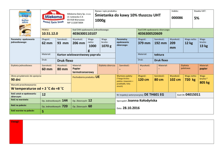 Mlekoma Dairy Sp. z o.o. Ul. Łotewska 5 A 03-918 Warszawa NIP 1132873004 Parametry opakowania jednostkowego: Etykieta jednostkowa: 000086 5% 10.51.12.0 4036300110107 4036300520609 Długość: Szerokość: Wysokość: 62 mm 93 mm 206 mm Materiał: Waga netto: Waga brutto: Długość: Szerokość: 1000 g 1070 g 379 mm 192 mm 209 mm Karton wielowarstwowy pap+alu Materiał: tektura Druk: Druk flexo Druk: Druk flexo Szerokość: Wysokość: Materiał: 80 mm Papier termotranserowy Etykieta zbiorcza: Pochodzenia produktu: UE Warunki przechowywania: W temperaturze od + 2 ˚C do +8 ˚C Uwagi: Śmietanka do kawy 10% tłuszczu UHT 1000g Kod EAN opakowania zbiorczego: 90 dni Ilość warstw na palecie: Stawka VAT: Kod EAN opakowania jednostkowego: Okres przydatności do spożycia: Ilość na palecie: Indeks: PKWiU: 60 mm Ilość sztuk w opakowaniu zbiorczym: Ilość na warstwie: Nazwa i opis produktu: 12 Op. Jednostkowych: 144 Op. Zbiorczych: 12 Op. Jednostkowych: 720 Op. Zbiorczych: 60 5 Parametry opakowania zbiorczego: Szerokość: - Wysokość: Materiał: - - Wysokość: Waga netto: 12 kg Etykieta paletowa: Wymiary palety: Długość: Szerokość: Wysokość: Waga netto: (*waga brutto: paleta z towarem + przekładki, folia strech) 120 cm 80 cm 102 cm 720 kg Nr inspekcji weterynaryjnej: DE TH601 EG Sporządził: Joanna Data: Kołodyńska 28.10.2016 Waga brutto: 13 kg Materiał: papier Waga brutto:* 805 kg Kod CN: 04015011