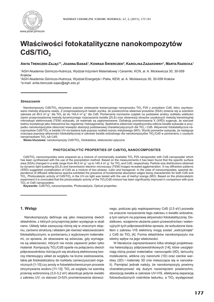MATERIA£Y CERAMICZNE /CERAMIC MATERIALS/, 67, 2, (2015), 177-181 www.ptcer.pl/mccm Właściwości fotokatalityczne nanokompozytów CdS/TiO2 Anita Trenczek-Zając1*, Joanna Banaś1, Konrad Świerczek2, Karolina Zazakowny1, Marta Radecka1 AGH Akademia Górniczo-Hutnicza, Wydział Inżynierii Materiałowej i Ceramiki, KCN, al. A. Mickiewicza 30, 30-059 Kraków 2 AGH Akademia Górniczo-Hutnicza, Wydział Energetyki i Paliw, KEW, al. A. Mickiewicza 30, 30-059 Kraków *e-mail: [email protected] 1 Streszczenie Nanokompozyty CdS/TiO2 otrzymano poprzez zmieszanie komercyjnego nanoproszku TiO2 P25 z proszkiem CdS, który zsyntezowano metodą strącania osadu. Z przeprowadzonych badań wynika, że powierzchnia właściwa proszków (SSA) zmienia się w szerokim zakresie od 49,5 m2·g-1 dla TiO2 aż do 145,4 m2·g-1 dla CdS. Porównanie rozmiarów cząstek na podstawie analizy rozkładu wielkości ziaren przeprowadzonej metodą dynamicznego rozpraszania światła (DLS) oraz obserwacji obrazów uzyskanych metodą transmisyjnej mikroskopii elektronowej (TEM) wykazało, że materiały są zaglomerowane. Dyfrakcja promieniowania X (XRD) sugeruje, że siarczek kadmu krystalizuje jako mieszanina faz regularnej i heksagonalnej. Spektralna zależność współczynnika odbicia światła wykazała w przypadku nanokompozytów obecność krawędzi absorpcji podstawowej charakterystycznych dla TiO2 i CdS. Aktywność fotokatalityczna nanoproszków CdS/TiO2 w świetle UV-vis badana była poprzez rozkład oranżu metylowego (MO). Wyniki pomiarów wykazały, że następuje znacząca poprawa aktywności fotokatalitycznej w zakresie światła widzialnego dla nanokompozytów TiO2/CdS w porównaniu z czystymi nanoproszkami TiO2 lub CdS. Słowa kluczowe: nanokompozyty CdS/TiO2, fotokataliza, właściwości optyczne PHOTOCATALYTIC PROPERTIES OF CdS/TiO2 NANOCOMPOSITES CdS/TiO2 nanocomposites were prepared as a mixture of commercially available TiO2 P25 nanopowder with CdS nanopowder which has been synthesised with the use of the precipitation method. Based on the measurements it has been found that the specific surface area (SSA) changed in a wide range from 49.5 m2·g-1 up to 145.4 m2·g-1 for TiO2 and CdS, respectively. Particle size distributions obtained by dynamic light scattering (DLS) and transmission electron microscopy (TEM) images revealed agglomeration. X-ray diffraction patterns (XRD) suggested crystallization of CdS as a mixture of two phases: cubic and hexagonal. In the case of nanocomposites, spectral dependence of diffused reflectance spectra exhibited the presence of fundamental absorption edges being characteristic for both CdS and TiO2. Photocatalytic activity of CdS/TiO2 in the UV-vis light was tested with the use of methyl orange (MO). Based on the photocatalytic experiment it is concluded that the photocatalytic activity of the TiO2/CdS mixture has been significantly improved in comparison with pure TiO2 or CdS nanopowders. Keywords: CdS/TiO2 nanocomposites, Photocatalysis, Optical properties 1. Wstęp Nanokompozyty definiuje się jako mieszaninę dwóch składników, z których przynajmniej jeden występuje w skali nano. Układy takie zazwyczaj różnią się w znacznym stopniu, zarówno strukturą i składem jak również właściwościami fotokatalitycznymi, w porównaniu z wyjściowymi materiałami, co sprawia, że stosowane są wówczas, gdy wymagane są właściwości, których nie może zapewnić jeden tylko materiał. Kompozyty TiO2/CdS oparte na połączeniu dwóch półprzewodników różniących się strukturą elektronową tworzą interesujący układ ze względu na liczne zastosowania, takie jak fotokatalizatory do rozkładu zanieczyszczeń organicznych [1-10] czy anody w fotoelektochemicznym procesie otrzymywania wodoru [11-13]. TiO2 ze względu na szeroką przerwę wzbronioną (3,0-3,2 eV) absorbuje jedynie światło z zakresu UV, co stanowi (3-5)% promieniowania słonecz- nego, podczas gdy wąskopasmowy CdS (2,5 eV) pozwala na znaczne rozszerzenie tego zakresu o światło widzialne, a tym samym na poprawę aktywności fotokatalitycznej. Dodatkowo, wzajemne ułożenie pasm przewodnictwa i walencyjnych tych półprzewodników sprawia, że wzbudzone światłem z zakresu VIS elektrony mogą zostać „wstrzyknięte” z CdS do TiO2 [4]. Forma składników nanokompozytu ma istotny wpływ na jego właściwości. W literaturze zaprezentowano kilka strategii projektowania heterozłączy półprzewodnikowych [14], które uwzględniają różną postać materiałów: nanocząstki (0D), łańcuchy molekularne, włókna czy nanorurki (1D) oraz cienkie warstwy (2D) i materiały 3D (nie mieszczące się w nanoskali). Pamiętać jednak należy, że nanokompozyty powinny charakteryzować się dużym rozwinięciem powierzchni, absorpcją światła w zakresie UV-VIS, efektywną separacją fotowzbudzonych nośników ładunku, a TiO2 występować 177 A. Trenczek-Zając, J. Banaś, K. Świerczek, K. Zazakowny, M. Radecka Tabela 1. Skład nanokompozytów CdS/TiO2 oraz wyniki analizy BET. Table 1. Data on composition of CdS/TiO2 nanocomposites and results of BET analysis. Udział molowy CdS [%] Udział molowy TiO2 [%] Powierzchnia właściwa [m2·g-1] Średnica zastępcza cząstek BET [nm] 0C 0 100 49,5 ± 0,4 30,8 ± 0,3 5C 5 95 60,5 ± 0,2 25C 25 75 87,9 ± 0,3 100C 100 0 145,4 ± 1,3 Nazwa a) b) 8,5 ± 0,1 c) Rys. 1. Obrazy TEM nanoproszków: a) 0C, b) 25C i c) 100C. Fig. 1. TEM images of nanopowders: a) 0C, b) 25C and c) 100C. jako obiekt 0D, 1D, 2D lub 3D. Spełnienie powyższych wymagań można uzyskać, stosując połączenie TiO2 w jednej z czterech form (0D-3D) z siarczkiem kadmu w postaci 0D. Nasze wcześniejsze badania układu TiO2/CdS [13] – kwiatopodobny (ang. flower-like) TiO2 (3D), na który naniesione były nanocząstki CdS/PbS (0D) – obejmowały wpływ CdS i PbS na właściwości optyczne i fotoelektrochemiczne TiO2. Stwierdzono, że modyfikacja fotoanody TiO2 nanocząstkami CdS i PbS 