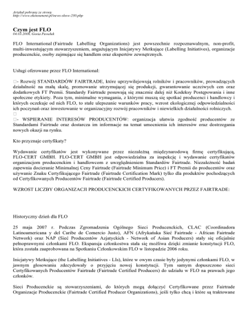 Artykuł pobrany ze strony http://www.ekonsument.pl/news-show-230.php Czym jest FLO 04.03.2008, Gosia Pawełek FLO International (Fairtrade Labelling Organizations) jest powszechnie rozpoznawalnym, non-profit, multi-inwestującym stowarzyszeniem, angażującym Inicjatywy Metkujące (Labelling Initiatives), organizacje producenckie, osoby zajmujące się handlem oraz ekspertów zewnętrznych. Usługi oferowane przez FLO International: - Rozwój STANDARDÓW FAIRTRADE, które uprzywilejowują rolników i pracowników, prowadzących działalność na małą skalę, promowanie utrzymującej się produkcji, gwarantowanie uczciwych cen oraz dodatkowych FT Premii. Standardy Fairtrade posuwają się znacznie dalej niż Kodeksy Postępowania i inne społeczne etykiety. Poza tym, minimalne wymagania, z którymi muszą się spotkać producenci i handlowcy i których oczekuje od nich FLO, to stałe ulepszanie warunków pracy, wzrost ekologicznej odpowiedzialności ich poczynań oraz inwestowanie w organizacyjny rozwój pracowników i niewielkich działalności rolniczych. - WSPIERANIE INTERESÓW PRODUCENTÓW: organizacja ułatwia zgodność producentów ze Standardami Fairtrade oraz dostarcza im informacje na temat umocnienia ich interesów oraz dostrzegania nowych okazji na rynku. Kto przyznaje certyfikaty? Wydawanie certyfikatów jest wykonywane przez niezależną międzynarodową firmę certyfikującą, FLO-CERT GMBH. FLO-CERT GMBH jest odpowiedzialna za inspekcję i wydawanie certyfikatów organizacjom producenckim i handlowcom z uwzględnieniem Standardów Fairtrade. Niezależność badań zapewnia docieranie Minimalnej Ceny Fairtrade (Fairtrade Minimum Price) i FT Premii do producentów oraz używanie Znaku Certyfikującego Fairtrade (Fairtrade Certification Mark) tylko dla produktów pochodzących od Certyfikowanych Producentów Fairtrade (Fairtrade Certified Producers). WZROST LICZBY ORGANIZACJI PRODUCENCKICH CERTYFIKOWANYCH PRZEZ FAIRTRADE: Historyczny dzień dla FLO 25 maja 2007 r. Podczas Zgromadzenia Ogólnego Sieci Producenckich, CLAC (Coordinadora Latinoamericana y del Caribe de Comercio Justo), AFN (Afrykańska Sieć Fairtrade - African Fairtrade Network) oraz NAP (Sieć Producentów Azjatyckich - Network of Asian Producers) stały się oficjalnie pełnoprawnymi członkami FLO. Ekspansja członkostwa stała się możliwa dzięki zmianie konstytucji FLO, która została zaaprobowana na Spotkaniu Członkowskim FLO w listopadzie 2006 roku. Inicjatywy Metkujące (the Labelling Initiatives - LIs), które w owym czasie były jedynymi członkami FLO, w jawnym głosowaniu zdecydowały o przyjęciu nowej konstytucji. Tym samym dopuszczono sieci Certyfikowanych Producentów Fairtrade (Fairtrade Certified Producers) do udziału w FLO na prawach jego członków. Sieci Producenckie są stowarzyszeniami, do których mogą dołączyć Certyfikowane przez Fairtrade Organizacje Producenckie (Fairtrade Certified Producer Organizations), jeśli tylko chcą i które są traktowane przez FLO jako reprezentatywne ciała złożone z rolników, pracowników i innych, należących do takich organizacji. Obecnie, istnieją trzy sieci producentów, jedna na każdym z trzech kontynentów: Afryka, Azja i Ameryka Łacińska, gdzie istnieją Certyfikowane przez Fairtrade Organizacje Producenckie. AFRYKAŃSKA SIEĆ FAIRTRADE (AFRICAN FAIRTRADE NETWORK - AFN) KRÓTKA HISTORIA została założona na czwartym zgromadzeniu afrykańskich organizacji, skupiających producentów towarów, zatwierdzonych przez FLO w Addis Abebie w Etiopii w marcu 2004 roku. AFN jest niezależną, nie nastawioną na zyski siecią parasolową Afrykańskich Organizacji Producenckich Certyfikowanych przez Fairtrade (Fairtrade Certified African Producer Organizations). MISJA I ROLA podnoszenie świadomości o sprawiedliwym handlu (fair trade) w Afryce. Tym samym, AFN poszukuje też dochodowych okazji handlowych dla Producentów i Pracowników Fairtrade, poprzez nawiązywanie kontaktów wewnątrz Afryki i poza nią. Ponadto AFN jest ciałem, które reprezentuje producentów afrykańskich w strukturach FLO. CZŁONKOWSTWO AFN jest otwarte dla wszystkich Organizacji Producenckich Certyfikowanych przez Fairtrade oraz potencjalnych aplikantów, organizacji założycielskich AFN, które są powiązane interesami z grupami Certyfikowanymi przez Fairtrade i afrykańskimi stowarzyszeniami handlowymi, zarejestrowanymi w FLO-CERT. Co więcej, agencje i inne organizacje promujące idee sprawiedliwego handlu (fair trade) mogą stać się przydatne, jeśli chodzi o członkowstwo w AFN. Członkowie są pogrupowani w cztery regionalne sieci Fairtrade, czyli odpowiednio - wschód, południe, zachód i północ Afryki. Do lipca 2006 roku liczba członków AFN osiągnęła poziom 164 Organizacji Producenckich Certyfikowanych przez Fairtrade i 43 zarejestrowanych organizacji w 24 krajach Afryki. SIEĆ PRODUCENTÓW AZJATYCKICH (NETWORK OF ASIAN PRODUCERS - NAP) KRÓTKA HISTORIA założona 16 czerwca 2005 roku. Producenci z różnych azjatyckich krajów spotkali się w Sri Lance i dyskutowali o potrzebie założenia sieci, która stanowiłaby zjednoczony głos przed FLO. Pierwsze zgromadzenie ogólne Sieci Producentów Azjatyckich (NAP) miało miejsce w Bangkoku (Tajlandia) od 17 do 19 września 2006 roku. Producenci z Indii, Pakistanu, Sri Lanki, Nepalu, Tajlandii, Filipin, Indonezji, Papui Nowej Gwinei, Timoru Wschodniego i Chin mieli tam swoich reprezentantów. MISJA I ROLA ułatwianie wcielania większej liczby producentów tak, aby byli oni zdolni do przyłączenia się do ruchu Fairtrade w Azji, poprzez istniejącą szeroką gamę produktów i usług. NAP pracuje także na rzecz upewniania się, iż azjatyckie realia i warunki życia są brane pod uwagę, podczas ustalania standardów Fairtrade bez rozwiązań kompromisowych, jeśli chodzi o podstawowe zasady Fairtrade. Wreszcie NAP jest również oficjalnym przedstawicielem producentów azjatyckich w Organizacja
