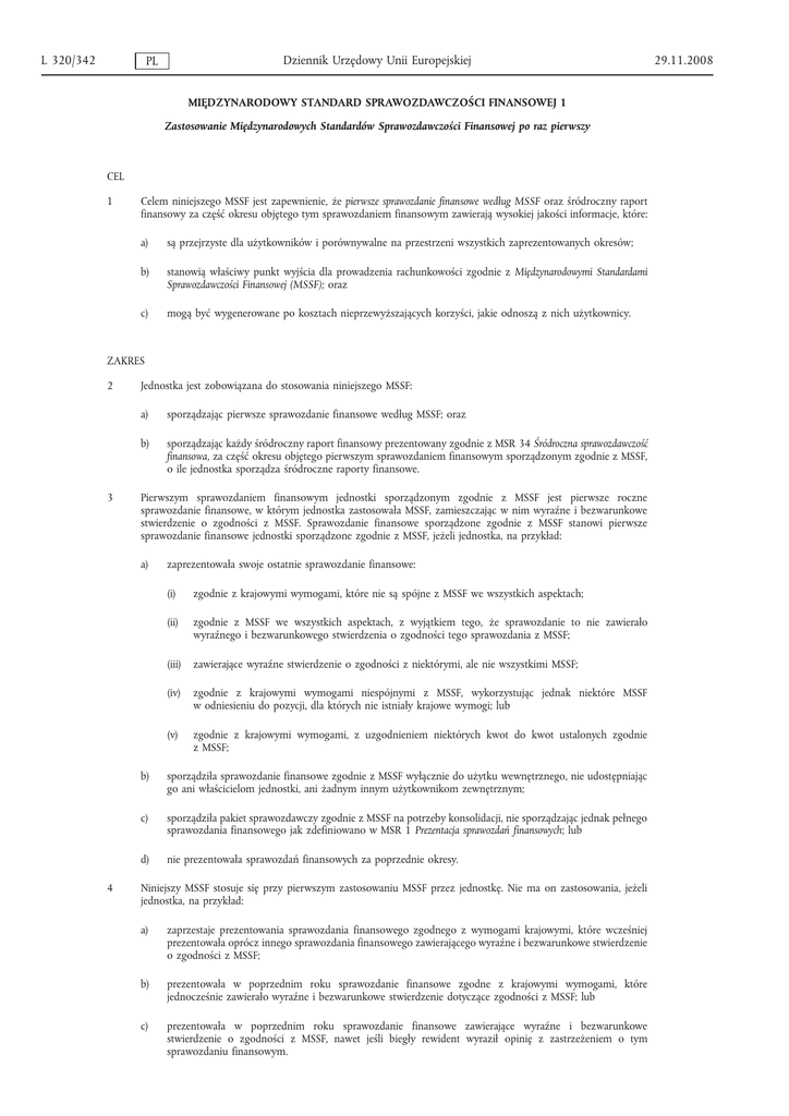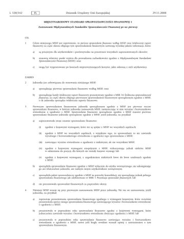 L 320/342 Dziennik Urzędowy Unii Europejskiej PL MIĘDZYNARODOWY STANDARD SPRAWOZDAWCZOŚCI FINANSOWEJ 1 Zastosowanie Międzynarodowych Standardów Sprawozdawczości Finansowej po raz pierwszy CEL 1 Celem niniejszego MSSF jest zapewnienie, że pierwsze sprawozdanie finansowe według MSSF oraz śródroczny raport finansowy za część okresu objętego tym sprawozdaniem finansowym zawierają wysokiej jakości informacje, które: a) są przejrzyste dla użytkowników i porównywalne na przestrzeni wszystkich zaprezentowanych okresów; b) stanowią właściwy punkt wyjścia dla prowadzenia rachunkowości zgodnie z Międzynarodowymi Standardami Sprawozdawczości Finansowej (MSSF); oraz c) mogą być wygenerowane po kosztach nieprzewyższających korzyści, jakie odnoszą z nich użytkownicy. ZAKRES 2 3 Jednostka jest zobowiązana do stosowania niniejszego MSSF: a) sporządzając pierwsze sprawozdanie finansowe według MSSF; oraz b) sporządzając każdy śródroczny raport finansowy prezentowany zgodnie z MSR 34 Śródroczna sprawozdawczość finansowa, za część okresu objętego pierwszym sprawozdaniem finansowym sporządzonym zgodnie z MSSF, o ile jednostka sporządza śródroczne raporty finansowe. Pierwszym sprawozdaniem finansowym jednostki sporządzonym zgodnie z MSSF jest pierwsze roczne sprawozdanie finansowe, w którym jednostka zastosowała MSSF, zamieszczając w nim wyraźne i bezwarunkowe stwierdzenie o zgodności z MSSF. Sprawozdanie finansowe sporządzone zgodnie z MSSF stanowi pierwsze sprawozdanie finansowe jednostki sporządzone zgodnie z MSSF, jeżeli jednostka, na przykład: a) 4 zaprezentowała swoje ostatnie sprawozdanie finansowe: (i) zgodnie z krajowymi wymogami, które nie są spójne z MSSF we wszystkich aspektach; (ii) zgodnie z MSSF we wszystkich aspektach, z wyjątkiem tego, że sprawozdanie to nie zawierało wyraźnego i bezwarunkowego stwierdzenia o zgodności tego sprawozdania z MSSF; (iii) zawierające wyraźne stwierdzenie o zgodności z niektórymi, ale nie wszystkimi MSSF; (iv) zgodnie z krajowymi wymogami niespójnymi z MSSF, wykorzystując jednak niektóre MSSF w odniesieniu do pozycji, dla których nie istniały krajowe wymogi; lub (v) zgodnie z krajowymi wymogami, z uzgodnieniem niektórych kwot do kwot ustalonych zgodnie z MSSF; b) sporządziła sprawozdanie finansowe zgodnie z MSSF wyłącznie do użytku wewnętrznego, nie udostępniając go ani właścicielom jednostki, ani żadnym innym użytkownikom zewnętrznym; c) sporządziła pakiet sprawozdawczy zgodnie z MSSF na potrzeby konsolidacji, nie sporządzając jednak pełnego sprawozdania finansowego jak zdefiniowano w MSR 1 Prezentacja sprawozdań finansowych; lub d) nie prezentowała sprawozdań finansowych za poprzednie okresy. Niniejszy MSSF stosuje się przy pierwszym zastosowaniu MSSF przez jednostkę. Nie ma on zastosowania, jeżeli jednostka, na przykład: a) zaprzestaje prezentowania sprawozdania finansowego zgodnego z wymogami krajowymi, które wcześniej prezentowała oprócz innego sprawozdania finansowego zawierającego wyraźne i bezwarunkowe stwierdzenie o zgodności z MSSF; b) prezentowała w poprzednim roku sprawozdanie finansowe zgodne z krajowymi wymogami, które jednocześnie zawierało wyraźne i bezwarunkowe stwierdzenie dotyczące zgodności z MSSF; lub c) prezentowała w poprzednim roku sprawozdanie finansowe zawierające wyraźne i bezwarunkowe stwierdzenie o zgodności z MSSF, nawet jeśli biegły rewident wyraził opinię z zastrzeżeniem o tym sprawozdaniu finansowym. 29.11.2008 29.11.2008 Dziennik Urzędowy Unii Europejskiej PL 5 Niniejszy MSSF nie ma zastosowania do zmian zasad (polityki) rachunkowości dokonywanych przez jednostkę, która już stosuje MSSF. Zmiany te są regulowane przez: a) wymogi dotyczące zmian zasad (polityki) rachunkowości określone w MSR 8 Zasady (polityka) rachunkowości, zmiany wartości szacunkowych i korygowanie błędów; oraz b) szczególne wymogi przejściowe innych MSSF. UJMOWANIE I WYCENA Bilans otwarcia według MSSF 6 Jednostka sporządza bilans otwarcia według MSSF na dzień przejścia na MSSF. Jest to punkt wyjścia dla prowadzenia rachunkowości zgodnie z MSSF. Jednostka nie musi prezentować bilansu otwarcia według MSSF w pierwszym sprawozdaniu finansowym sporządzonym zgodnie z MSSF. Zasady (polityka) rachunkowości 7 Jednostka stosuje te same zasady (politykę) rachunkowości, sporządzając bilans otwarcia według MSSF oraz przez wszystkie okresy zaprezentowane w jej pierwszym sprawozdaniu finansowym sporządzonym zgodnie z MSSF. Te zasady (polityka) rachunkowości muszą być zgodne z postanowieniami każdego z MSSF obowiązującego na dzień sprawozdawczy pierwszego sprawozdania finansowego sporządzonego zgodnie z MSSF, z zastrzeżeniem paragrafów 13–34B, 36A–36C oraz 37. 8 Jednostka nie stosuje różnych wersji MSSF, które weszły w życie we wcześniejszych okresach. Jednostka może zastosować nowy MSSF, jeszcze nieobowiązujący, o ile zezwala się w nim na jego wcześniejsze zastosowanie. Przykład: Spójne zastosowanie najnowszej wersji MSSF Wprowadzenie Dzień 31 grudnia 2005 r. jest dniem sprawozdawczym, na który jednostka A sporządziła pierwsze sprawozdanie finansowe zgodnie z MSSF. Jednostka A postanowiła zaprezentować w tym sprawozdaniu finansowym dane porównawcze tylko za jeden rok obrotowy (zob. paragraf 36). Zatem dla tej jednostki dniem przejścia na MSSF jest dzień rozpoczęcia operacji, czyli 1 stycznia 2004 r. (lub zamiennie dzień zakończenia operacji, czyli 31 grudnia 2003 r.). Co roku jednostka A prezentowała sprawozdanie finansowe zgodnie z wcześniej stosowanymi ogólnie przyjętymi zasadami rachunkowości na dzień 31 grudnia każdego roku, po raz ostatni na dzień 31 grudnia 2004 r. Zastosowanie wymogów Jednostka A zobowiązana jest do stosowania MSSF w odniesieniu do okresów sprawozdawczych zakończonych dnia 31 grudnia 2005 r. przy: a) sporządzaniu bilansu otwarcia według M