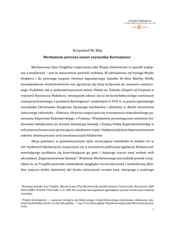 Creatio Fantastica PL ISSN: 2300-2514 R. XII, 2016, nr 3 (54) Krzysztof M. Maj Mechanizm porusza nawet szyszynkę Kartezjusza Mechaniczny Iana Tregillisa rozpoczyna cykl Wojny alchemiczne w sposób najlepszy z możliwych – jest to mianowicie powieść wybitna. W odróżnieniu od trylogii Marka Hoddera i do pewnego stopnia również legendarnego Upadku Ile-Rien Marthy Wells, steampunkowe światotwórstwo nie ogranicza się tutaj wyłącznie do wymiaru estetycznego. Podobnie jak w pełnometrażowym anime Shisha no Teikoku (Empire of Corpses) w reżyserii Ryoutarou Makihary, steampunk odnosi się tu do kontrfaktycznego continuum czasoprzestrzennego, z punktem dywergencji1 osadzonym w XVII w. w postaci genialnego wynalazku Christiaana Huygensa, łączącego mechanikę i alchemię w dziele stworzenia sztucznego człowieka – Klakiera. Historia rozpoczyna się w momencie niepodzielnego panowania Imperium Holenderskiego, z Francją i Watykanem pozostającymi ostatnimi bastionami katolicyzmu na terenie dzisiejszej Kanady i Świętą Gildią Zegarmistrzowską w roli ponurej korporacji sprawującej zakulisowe rządy i będącej jedynym depozytariuszem sekretu okiełznywania woli mechanicznych Klakierów. Akcja powieści, w ponowoczesnym stylu wrzucającej czytelnika in medias res w wir wydarzeń fabularnych, rozpoczyna się w momencie publicznej egzekucji Klakiera odmawiającego poddania się kontrolującym go geas i dającego wyraz swej wolnej woli okrzykiem „Zegarmistrzowie kłamią!”. Walorem Mechanicznego jest jednak przede wszystkim to, że Tregillis pozwala czytelnikom spoglądać na ten kluczowy i symboliczny (Klakier nazywa siebie Adamem) akt buntu sztucznymi oczami Jaxa, służącego u możnego Recenzja książki: Ian Tregillis, Mechaniczny [The Mechanical], przekł. Bartosz Czartoryski, Warszawa: SQN 2016, ISBN: 978-83-7924-686-1, ss. 480. Do recenzji udostępniono egzemplarz sprzed ostatecznej redakcji i korekty. Punkt dywergencji — moment rozejścia się faktycznego i kontrfaktycznego continuum, oddawany zdaniami kontrfaktycznymi „Co by było gdyby…”; np. Co by było, gdyby Napoleon wygrał pod Berezyną (przyp. red.). 1 1 rodu Schoonraadów. Prowadzenie narracji z perspektywy sztucznego konstruktu jest wprawdzie pomysłem nienowym – teoria literatury zna przypadki czynienia tzw. nienaturalnymi narratorami nawet przydrożnych kamieni. Tregillisowi jednakowoż udaje się chwyt ten znakomicie wykorzystać do uwiarygodnienia postępującej ewolucji samoświadomości Jaxa i lepszej motywacji częstych strumieni świadomości i monologów wewnętrznych, znamionujących kształtowanie się Wolnej Woli. O tak, w Mechanicznym nie brakuje teologicznych i filozoficznych rozważań na temat ontologicznych różnic między stwórcą a stworzeniem (kreatorem a konstruktem, panem a poddanym i tak dalej), fenomenologii duszy (i ducha), źródeł i ograniczeń Wolnej Woli czy etyki sprawowania niepodzielnej kontroli nad maszyną. Czym różni się Klakier od zegarka kieszonkowego? – pada w pewnym momencie pytanie, skierowane do reprezentującego drugą perspektywę narracyjną pastora, i pozostaje w zasadzie bez odpowiedzi. Mechaniczny jest do pewnego stopnia konfrontacją trzech światopoglądów: laickiego, kalwinistycznego i katolickiego, różniącego się w zdaniach na temat istnienia i roli duszy jako gwaranta Wolnej Woli i – jak powiedzielibyśmy współczesnym językiem – praw człowieka. Tregillis genialnie łączy oświeceniowy racjonalizm kartezjański z dylematami etycznymi transhumanizmu, nieradzącego sobie nawet po całym doświadczeniu ponowoczesności ze sproblematyzowaniem relacji człowieka do rozumnej maszyny. Czy samoświadomość, zdolność interioryzacji przeżyć, autoidentyfikacji czy podmiotowego wskazania siebie jako jestestwa, rozumnego i myślącego bytu, spełniają warunek uznania mechanicznego konstruktu jako równego pod względem etycznym wobec swoich konstruktorów? Czy zegarek kieszonkowy rozpoznający w zdumieniu – które, jak wiadomo, jest początkiem wszelkiej filozofii – siebie jako jestestwo zwane zegarkiem kieszonkowym, zyskuje prawo równego traktowania? Podmiotowość? Obywatelstwo? Prawo do stanowienia o sobie i decydowania o innych? Z takimi oto przemyśleniami pozostawia czytelników Tregillis, zachęcając do głębokiego przemyślenia dokonującej się w świecie Wojen alchemicznych rewolucji technologicznej i proponując krytyczne odczytanie steampunku jako narracji transhumanistycznej – a więc niejedynie estetycznego sztafażu, sprowadzającego się do obmyśliwania kolejnych pseudowiktoriańskich fantasmagorii. Nie oznacza to oczywiście, by w Mechanicznym brakowało elementów konwencji steampunkowej: wręcz przeciwnie! Są mechaniczne konstrukty, jest rewolucja technologiczna, są lampy gazowe, fetysz na punkcie fortyfikacji dorównuje feblikowi stryjaszka 2 Tobyego z Tristrama Shandy – jednak, co najważniejsze, jest także alchemia, co rewelacyjnie nawiązuje do udokumentowanych zainteresowań siedemnasto- i osiemnastowiecznych luminarzy, z Isaakiem Newtonem na czele. Umiejętne żonglowanie tego rodzaju aluzjami, bynajmniej niezaburzającymi imersji w kontrfaktycznym świecie Wojen alchemicznych, jest niewątpliwym i głównym atutem powieści Tregillisa – choć, znów, niejedynym. Postmodernistyczny zabieg fokalizacji zastosowany jest bowiem nie tylko do postaci Jaxa, ale również katolickiego księdza w przebraniu pastora, Luuka Vissera, pełniącego beznadziejną funkcję męczennika za przegraną sprawę, oraz wicehrabiny Berenice Charlotte de Mornay-Périgord, o równie długim, co absolutnie niezapamiętywalnym nazwisku – za to o budzącym sympatię zadziornym charakterze2. W odróżnieniu jednakowoż od tak wielu autorów fabuł fantastycznych, mknących naprzód w pogoni za atrakcyjnymi perypetiami, Tregillis idealnie równoważy partie opisowe i dialogowe, dbając równocześnie o niespieszne dozowa