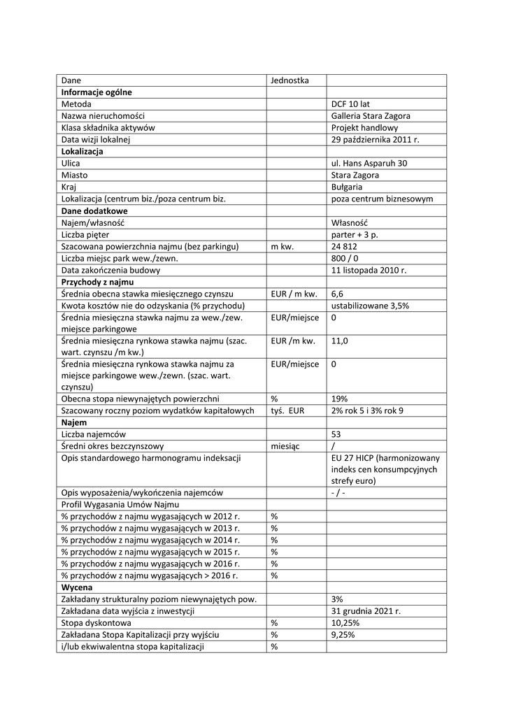 Dane Informacje ogólne Metoda Nazwa nieruchomości Klasa składnika aktywów Data wizji lokalnej Lokalizacja Ulica Miasto Kraj Lokalizacja (centrum biz./poza centrum biz. Dane dodatkowe Najem/własność Liczba pięter Szacowana powierzchnia najmu (bez parkingu) Liczba miejsc park wew./zewn. Data zakończenia budowy Przychody z najmu Średnia obecna stawka miesięcznego czynszu Kwota kosztów nie do odzyskania (% przychodu) Średnia miesięczna stawka najmu za wew./zew. miejsce parkingowe Średnia miesięczna rynkowa stawka najmu (szac. wart. czynszu /m kw.) Średnia miesięczna rynkowa stawka najmu za miejsce parkingowe wew./zewn. (szac. wart. czynszu) Obecna stopa niewynajętych powierzchni Szacowany roczny poziom wydatków kapitałowych Najem Liczba najemców Średni okres bezczynszowy Opis standardowego harmonogramu indeksacji Opis wyposażenia/wykończenia najemców Profil Wygasania Umów Najmu % przychodów z najmu wygasających w 2012 r. % przychodów z najmu wygasających w 2013 r. % przychodów z najmu wygasających w 2014 r. % przychodów z najmu wygasających w 2015 r. % przychodów z najmu wygasających w 2016 r. % przychodów z najmu wygasających > 2016 r. Wycena Zakładany strukturalny poziom niewynajętych pow. Zakładana data wyjścia z inwestycji Stopa dyskontowa Zakładana Stopa Kapitalizacji przy wyjściu i/lub ekwiwalentna stopa kapitalizacji Jednostka DCF 10 lat Galleria Stara Zagora Projekt handlowy 29 października 2011 r. ul. Hans Asparuh 30 Stara Zagora Bułgaria poza centrum biznesowym m kw. EUR / m kw. Własność parter + 3 p. 24 812 800 / 0 11 listopada 2010 r. EUR/miejsce 6,6 ustabilizowane 3,5% 0 EUR /m kw. 11,0 EUR/miejsce 0 % tyś. EUR 19% 2% rok 5 i 3% rok 9 miesiąc 53 / EU 27 HICP (harmonizowany indeks cen konsumpcyjnych strefy euro) -/- % % % % % % % % % 3% 31 grudnia 2021 r. 10,25% 9,25% Wartość rynkowa (przy podstawie 100%) na dzień tys. euro 37 620 31.12.2011 r. Komentarze Koszt nie do odzyskania rozpoczyna się z wyższego poziomu z kilku powodów, tj. stopa niewynajętych powierzchni, umowy z najemcami. Podstawowy czynsz jest niższy, ze względu na rezerwy na czynsz z kilkoma najemcami. Rezerwa na stracone zadłużenie została dodana na początku w wys. 2% a potem spadła do 1%.