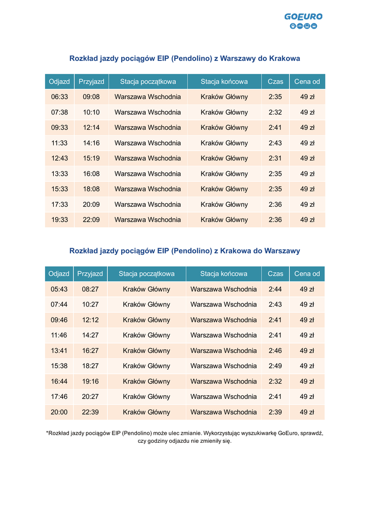 Rozkład jazdy pociągów EIP (Pendolino) z Warszawy do Krakowa Odjazd Przyjazd Stacja początkowa Stacja końcowa Czas Cena od 06:33 09:08 Warszawa Wschodnia Kraków Główny 2:35 49 zł 07:38 10:10 Warszawa Wschodnia Kraków Główny 2:32 49 zł 09:33 12:14 Warszawa Wschodnia Kraków Główny 2:41 49 zł 11:33 14:16 Warszawa Wschodnia Kraków Główny 2:43 49 zł 12:43 15:19 Warszawa Wschodnia Kraków Główny 2:31 49 zł 13:33 16:08 Warszawa Wschodnia Kraków Główny 2:35 49 zł 15:33 18:08 Warszawa Wschodnia Kraków Główny 2:35 49 zł 17:33 20:09 Warszawa Wschodnia Kraków Główny 2:36 49 zł 19:33 22:09 Warszawa Wschodnia Kraków Główny 2:36 49 zł Rozkład jazdy pociągów EIP (Pendolino) z Krakowa do Warszawy Odjazd Przyjazd Stacja początkowa Stacja końcowa Czas Cena od 05:43 08:27 Kraków Główny Warszawa Wschodnia 2:44 49 zł 07:44 10:27 Kraków Główny Warszawa Wschodnia 2:43 49 zł 09:46 12:12 Kraków Główny Warszawa Wschodnia 2:41 49 zł 11:46 14:27 Kraków Główny Warszawa Wschodnia 2:41 49 zł 13:41 16:27 Kraków Główny Warszawa Wschodnia 2:46 49 zł 15:38 18:27 Kraków Główny Warszawa Wschodnia 2:49 49 zł 16:44 19:16 Kraków Główny Warszawa Wschodnia 2:32 49 zł 17:46 20:27 Kraków Główny Warszawa Wschodnia 2:41 49 zł 20:00 22:39 Kraków Główny Warszawa Wschodnia 2:39 49 zł *Rozkład jazdy pociągów EIP (Pendolino) może ulec zmianie. Wykorzystując wyszukiwarkę GoEuro, sprawdź, czy godziny odjazdu nie zmieniły się.