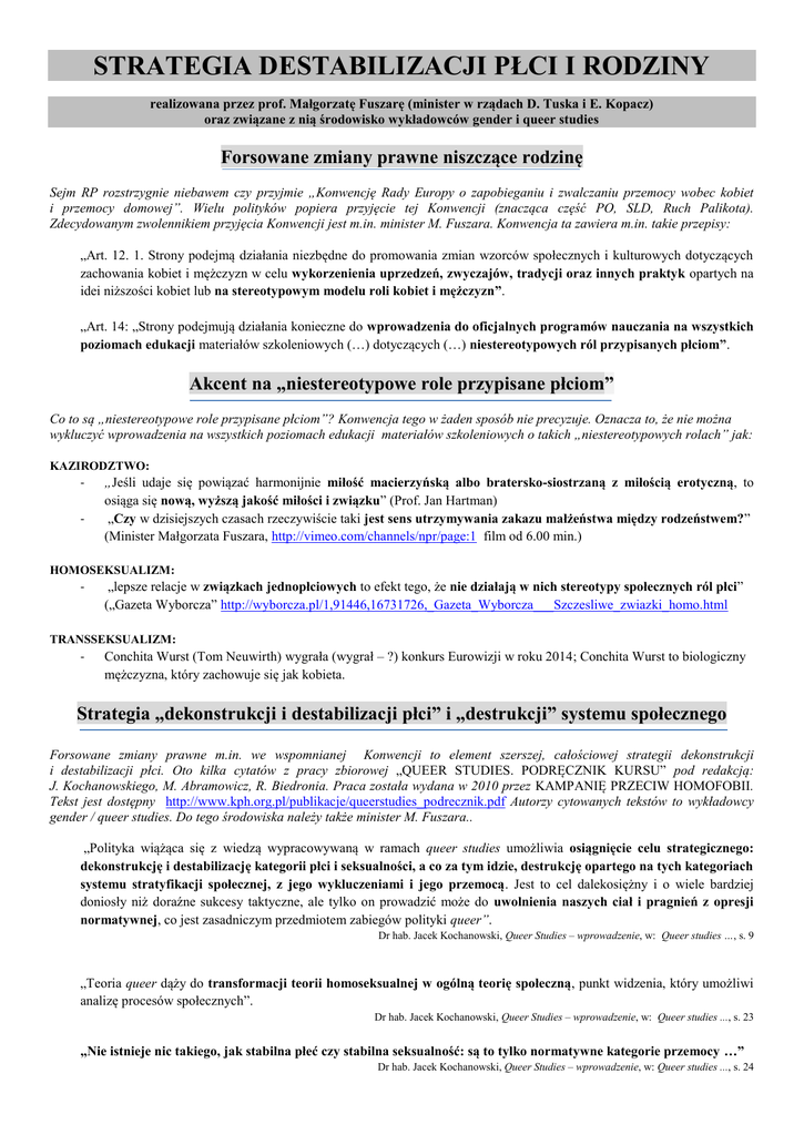 STRATEGIA DESTABILIZACJI PŁCI I RODZINY realizowana przez prof. Małgorzatę Fuszarę (minister w rządach D. Tuska i E. Kopacz) oraz związane z nią środowisko wykładowców gender i queer studies Forsowane zmiany prawne niszczące rodzinę Sejm RP rozstrzygnie niebawem czy przyjmie „Konwencję Rady Europy o zapobieganiu i zwalczaniu przemocy wobec kobiet i przemocy domowej”. Wielu polityków popiera przyjęcie tej Konwencji (znacząca część PO, SLD, Ruch Palikota). Zdecydowanym zwolennikiem przyjęcia Konwencji jest m.in. minister M. Fuszara. Konwencja ta zawiera m.in. takie przepisy: „Art. 12. 1. Strony podejmą działania niezbędne do promowania zmian wzorców społecznych i kulturowych dotyczących zachowania kobiet i mężczyzn w celu wykorzenienia uprzedzeń, zwyczajów, tradycji oraz innych praktyk opartych na idei niższości kobiet lub na stereotypowym modelu roli kobiet i mężczyzn”. „Art. 14: „Strony podejmują działania konieczne do wprowadzenia do oficjalnych programów nauczania na wszystkich poziomach edukacji materiałów szkoleniowych (…) dotyczących (…) niestereotypowych ról przypisanych płciom”. Akcent na „niestereotypowe role przypisane płciom” Co to są „niestereotypowe role przypisane płciom”? Konwencja tego w żaden sposób nie precyzuje. Oznacza to, że nie można wykluczyć wprowadzenia na wszystkich poziomach edukacji materiałów szkoleniowych o takich „niestereotypowych rolach” jak: KAZIRODZTWO: - „Jeśli udaje się powiązać harmonijnie miłość macierzyńską albo bratersko-siostrzaną z miłością erotyczną, to osiąga się nową, wyższą jakość miłości i związku” (Prof. Jan Hartman) „Czy w dzisiejszych czasach rzeczywiście taki jest sens utrzymywania zakazu małżeństwa między rodzeństwem?” (Minister Małgorzata Fuszara, http://vimeo.com/channels/npr/page:1 film od 6.00 min.) HOMOSEKSUALIZM: - „lepsze relacje w związkach jednopłciowych to efekt tego, że nie działają w nich stereotypy społecznych ról płci” („Gazeta Wyborcza” http://wyborcza.pl/1,91446,16731726,_Gazeta_Wyborcza___Szczesliwe_zwiazki_homo.html TRANSSEKSUALIZM: - Conchita Wurst (Tom Neuwirth) wygrała (wygrał – ?) konkurs Eurowizji w roku 2014; Conchita Wurst to biologiczny mężczyzna, który zachowuje się jak kobieta. Strategia „dekonstrukcji i destabilizacji płci” i „destrukcji” systemu społecznego Forsowane zmiany prawne m.in. we wspomnianej Konwencji to element szerszej, całościowej strategii dekonstrukcji i destabilizacji płci. Oto kilka cytatów z pracy zbiorowej „QUEER STUDIES. PODRĘCZNIK KURSU” pod redakcją: J. Kochanowskiego, M. Abramowicz, R. Biedronia. Praca została wydana w 2010 przez KAMPANIĘ PRZECIW HOMOFOBII. Tekst jest dostępny http://www.kph.org.pl/publikacje/queerstudies_podrecznik.pdf Autorzy cytowanych tekstów to wykładowcy gender / queer studies. Do tego środowiska należy także minister M. Fuszara.. „Polityka wiążąca się z wiedzą wypracowywaną w ramach queer studies umożliwia osiągnięcie celu strategicznego: dekonstrukcję i destabilizację kategorii płci i seksualności, a co za tym idzie, destrukcję opartego na tych kategoriach systemu stratyfikacji społecznej, z jego wykluczeniami i jego przemocą. Jest to cel dalekosiężny i o wiele bardziej doniosły niż doraźne sukcesy taktyczne, ale tylko on prowadzić może do uwolnienia naszych ciał i pragnień z opresji normatywnej, co jest zasadniczym przedmiotem zabiegów polityki queer”. Dr hab. Jacek Kochanowski, Queer Studies – wprowadzenie, w: Queer studies …, s. 9 „Teoria queer dąży do transformacji teorii homoseksualnej w ogólną teorię społeczną, punkt widzenia, który umożliwi analizę procesów społecznych”. Dr hab. Jacek Kochanowski, Queer Studies – wprowadzenie, w: Queer studies ..., s. 23 „Nie istnieje nic takiego, jak stabilna płeć czy stabilna seksualność: są to tylko normatywne kategorie przemocy …” Dr hab. Jacek Kochanowski, Queer Studies – wprowadzenie, w: Queer studies ..., s. 24 „Teoria queer oznacza zatem kres złudzenia stabilnych i jednoznacznych kategorii normatywnych, w tym kategorii płci i seksualności, oraz krytykę opartych na tym złudzeniu narracji politycznych i teoretycznych”. Dr hab. Jacek Kochanowski, Queer Studies – wprowadzenie, w: Queer studies ..., s. 24 „Chodzi nam o współtworzenie wiedzy/oporu, która może być następnie przekładana na indywidualne i wspólne strategie politycznego sprzeciwu wobec przemocy powiązanej z wymuszaniem obowiązkowej heteroseksualności oraz poprawnego odgrywania płci”. Dr hab. Jacek Kochanowski, Queer Studies – wprowadzenie, w: Queer studies ..., s. 25 „ … teoria queer postuluje odrzucenie chronionych normatywnie, kulturowych wzorów zachowań seksualnych i ról płciowych. (…) w kulturze i życiu społecznym powinno się odrzucić przypisywanie jednostkom trwałych ról i tożsamości, raz na zawsze definiujących osobę co do jej orientacji seksualnej. Świat szczęśliwy społecznie ma być światem, w którym i kobiety, i mężczyźni określają się w płynny, dynamiczny sposób co do swych seksualnych preferencji”. Prof. Ireneusz Krzemiński, Społeczna historia homoseksualności. Ruch wyzwolenia , w: Queer studies …, s. 50 „ … Warner domaga się rezygnacji z żądań wprowadzenia ślubów osób tej samej płci ponieważ małżeństwo zawsze dzieli na ludzi na tych, którzy pozostają w związkach usankcjonowanych, a przez to lepszych, i tych gorszych, pozbawionych społecznego uznania. Rozwiązaniem nie jest więc wprowadzenie małżeństw dla lesbijek i gejów, ale całkowita likwidacja instytucji małżeństwa, także dla par heteroseksualnych. Oczywiście nie wiadomo, jak dziś można by ten projekt zrealizować, ale tymczasem ruch na rzecz praw mniejszości seksualnych nie powinien asymilować się do przyjętych wzorców społecznych kosztem członków