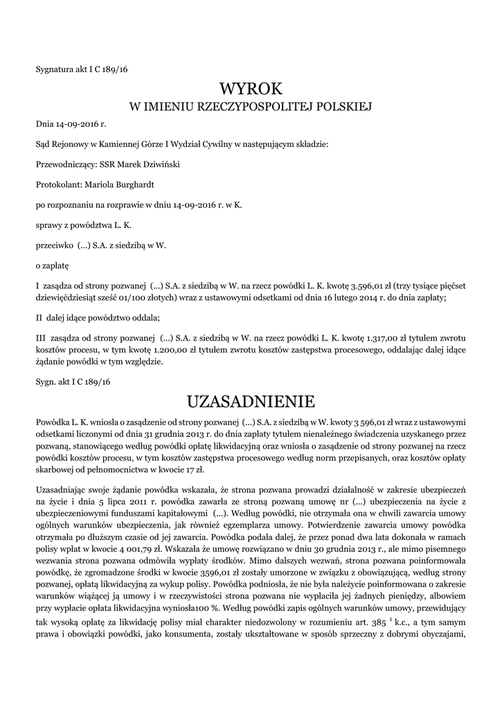 Sygnatura akt I C 189/16 WYROK W IMIENIU RZECZYPOSPOLITEJ POLSKIEJ Dnia 14-09-2016 r. Sąd Rejonowy w Kamiennej Górze I Wydział Cywilny w następującym składzie: Przewodniczący: SSR Marek Dziwiński Protokolant: Mariola Burghardt po rozpoznaniu na rozprawie w dniu 14-09-2016 r. w K. sprawy z powództwa L. K. przeciwko (...) S.A. z siedzibą w W. o zapłatę I zasądza od strony pozwanej (...) S.A. z siedzibą w W. na rzecz powódki L. K. kwotę 3.596,01 zł (trzy tysiące pięćset dziewięćdziesiąt sześć 01/100 złotych) wraz z ustawowymi odsetkami od dnia 16 lutego 2014 r. do dnia zapłaty; II dalej idące powództwo oddala; III zasądza od strony pozwanej (...) S.A. z siedzibą w W. na rzecz powódki L. K. kwotę 1.317,00 zł tytułem zwrotu kosztów procesu, w tym kwotę 1.200,00 zł tytułem zwrotu kosztów zastępstwa procesowego, oddalając dalej idące żądanie powódki w tym względzie. Sygn. akt I C 189/16 UZASADNIENIE Powódka L. K. wniosła o zasądzenie od strony pozwanej (...) S.A. z siedzibą w W. kwoty 3 596,01 zł wraz z ustawowymi odsetkami liczonymi od dnia 31 grudnia 2013 r. do dnia zapłaty tytułem nienależnego świadczenia uzyskanego przez pozwaną, stanowiącego według powódki opłatę likwidacyjną oraz wniosła o zasądzenie od strony pozwanej na rzecz powódki kosztów procesu, w tym kosztów zastępstwa procesowego według norm przepisanych, oraz kosztów opłaty skarbowej od pełnomocnictwa w kwocie 17 zł. Uzasadniając swoje żądanie powódka wskazała, że strona pozwana prowadzi działalność w zakresie ubezpieczeń na życie i dnia 5 lipca 2011 r. powódka zawarła ze stroną pozwaną umowę nr (...) ubezpieczenia na życie z ubezpieczeniowymi funduszami kapitałowymi (...). Według powódki, nie otrzymała ona w chwili zawarcia umowy ogólnych warunków ubezpieczenia, jak również egzemplarza umowy. Potwierdzenie zawarcia umowy powódka otrzymała po dłuższym czasie od jej zawarcia. Powódka podała dalej, że przez ponad dwa lata dokonała w ramach polisy wpłat w kwocie 4 001,79 zł. Wskazała że umowę rozwiązano w dniu 30 grudnia 2013 r., ale mimo pisemnego wezwania strona pozwana odmówiła wypłaty środków. Mimo dalszych wezwań, strona pozwana poinformowała powódkę, że zgromadzone środki w kwocie 3596,01 zł zostały umorzone w związku z obowiązującą, według strony pozwanej, opłatą likwidacyjną za wykup polisy. Powódka podniosła, że nie była należycie poinformowana o zakresie warunków wiążącej ją umowy i w rzeczywistości strona pozwana nie wypłaciła jej żadnych pieniędzy, albowiem przy wypłacie opłata likwidacyjna wyniosła100 %. Według powódki zapis ogólnych warunków umowy, przewidujący tak wysoką opłatę za likwidację polisy miał charakter niedozwolony w rozumieniu art. 385 1 k.c., a tym samym prawa i obowiązki powódki, jako konsumenta, zostały ukształtowane w sposób sprzeczny z dobrymi obyczajami, rażąco naruszając jej interesy. W ocenie powódki sankcja w postaci obciążania powódki opłatą likwidacyjną, która stanowi 100% zgromadzonych przez powódkę środków, a jednocześnie jest narzucana konsumentowi jednostronnie przez przedsiębiorcę, nie odpowiada rzeczywiście poniesionym przez stronę pozwaną wydatkom. Podnosząc brak u konsumenta możliwości realnej oceny korzyści lub ich braku z zawarcia umowy ze stroną pozwaną, powódka zarzuciła postanowieniom OWU, że jako będące niedozwolonymi klauzulami umownymi, nie wiążą powódki a pobrana na ich podstawie opłata likwidacyjna ma charakter świadczenia nienależnego i w konsekwencji podlegać winna zwrotowi na podst. art. 405 k.c. w zw. z art. 410 k.c. Powódka podkreśliła również, że strona pozwana za prowadzenie rachunku naliczała opłatę administracyjną oraz opłatę za zarządzanie, a w związku z tym nie domaga się kwoty 4 001,79 zł, którą łącznie wpłaciła, ale kwoty pomniejszonej o 405,78 zł, co stanowi 10% wszystkich wpłaconych przez powódkę środków. W odpowiedzi na pozew strona pozwana wniosła o oddalenie powództwa w całości, jak i o zasądzenie kosztów procesu, w tym kosztów zastępstwa procesowego według norm przepisanych oraz kosztów opłaty skarbowej od pełnomocnictwa. Strona pozwana przyznała, że zawarła z powódką umowę ubezpieczenia na życie z ubezpieczeniowymi funduszami kapitałowymi (...). Wskazała, że polisa została zawarta na podstawie własnoręcznie podpisanego przez powódkę wniosku, a w dniu 27 lipca 2011 r. powódka własnoręcznym podpisem potwierdziła, że otrzymała pakiet ubezpieczeniowy zawierający między innymi polisę ubezpieczeniową oraz oświadczyła, że w dniu podpisania wniosku o zawarcie umowy ubezpieczenia otrzymała OWU. Pozwana zarzuciła powódce, że ta miała pełną świadomość co do zasad produktu i mogła bez jakichkolwiek konsekwencji w terminie 30 dni od daty zawarcia umowy od niej odstąpić. Powódka, opłacając składki, była objęta ochroną ubezpieczeniową. Strona pozwana dokonała ustalenia wartości wykupu polisy w oparciu o postanowienia OWU i załączoną do nich Tabelę. Według strony pozwanej zasady rezygnacji z ubezpieczenia zostały napisane więcej niż prostym językiem i były łatwe do zrozumienia dla klienta, a sama powódka nie zgłaszała żadnych uwag czy zastrzeżeń w odniesieniu do treści OWU przez czas trwania umowy. Strona pozwana podkreśliła również, że wartość świadczenia wykupu nie ma na celu penalizacji wcześniejszego rozwiązania umowy przez konsumenta czy uzyskania wygórowanej kompensaty tytułem rozwiązania umowy a jedynie są to koszty związane z zawarciem umowy i prowadzeniem działalności gospodarczej. Stąd według strony pozwanej żadne z postanowień OWU nie naruszyło treści przepisu art. 385 1 k.c., ponieważ stwierdzenie, że w umowie zawarte są niedozwolone postanowienia wymaga zaistnienia łącznie wszystkich przesłanek określonych w wymienionym 