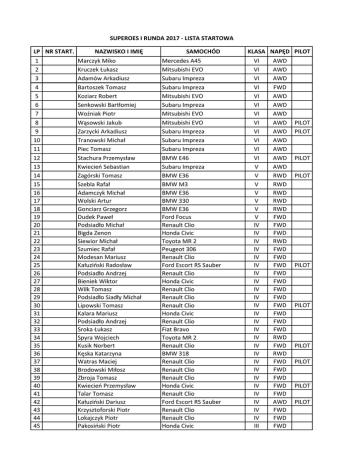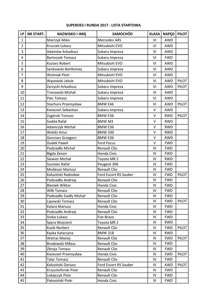 SUPEROES I RUNDA 2017 - LISTA STARTOWA LP NR START. 1 2 3 4 5 6 7 8 9 10 11 12 13 14 15 16 17 18 19 20 21 22 23 24 25 26 27 28 29 30 31 32 33 34 35 36 37 38 39 40 41 42 43 44 45 NAZWISKO I IMIĘ SAMOCHÓD Marczyk Miko Kruczek Łukasz Adamów Arkadiusz Bartoszek Tomasz Koziarz Robert Senkowski Bartłomiej Woźniak Piotr Wąsowski Jakub Zarzycki Arkadiusz Tranowski Michał Piec Tomasz Stachura Przemysław Kwiecień Sebastian Zagórski Tomasz Szebla Rafał Adamczyk Michał Wolski Artur Gonciarz Grzegorz Dudek Paweł Podsiadło Michał Bigda Zenon Siewior Michał Szumiec Rafał Modesan Mariusz Kałuziński Radosław Podsiadło Andrzej Bieniek Wiktor Wilk Tomasz Podsiadło Siadły Michał Lipowski Tomasz Kalara Mariusz Podsiadło Andrzej Sroka Łukasz Spyra Wojciech Kusik Norbert Kęska Katarzyna Watras Maciej Brodowski Miłosz Zbroja Tomasz Kwiecień Przemysław Talar Tomasz Kałuziński Dariusz Krzysztoforski Piotr Lokajczyk Piotr Pakosiński Piotr Mercedes A45 Mitsubishi EVO Subaru Impreza Subaru Impreza Mitsubishi EVO Subaru Impreza Mitsubishi EVO Mitsubishi EVO Subaru Impreza Subaru Impreza Subaru Impreza BMW E46 Subaru Impreza BMW E36 BMW M3 BMW E36 BMW 330 BMW E36 Ford Focus Renault Clio Honda Civic Toyota MR 2 Peugeot 306 Renault Clio Ford Escort RS Sauber Renault Clio Honda Civic Renault Clio Renault Clio Renault Clio Honda Civic Renault Clio Fiat Bravo Toyota MR 2 Renault Clio BMW 318 Renault Clio Renault Clio Renault Clio Honda Civic Renault Clio Ford Escort RS Sauber Renault Clio Renault Clio Honda Civic KLASA NAPĘD PILOT VI VI VI VI VI VI VI VI VI VI VI VI V V V V V V V IV IV IV IV IV IV IV IV IV IV IV IV IV IV IV IV IV IV IV IV IV IV IV IV IV III AWD AWD AWD FWD AWD AWD AWD AWD AWD AWD AWD AWD AWD RWD RWD RWD RWD RWD FWD FWD FWD RWD FWD FWD FWD FWD FWD FWD FWD FWD FWD FWD FWD RWD FWD RWD FWD FWD FWD FWD FWD AWD FWD FWD FWD PILOT PILOT PILOT PILOT PILOT PILOT PILOT PILOT PILOT PILOT 46 47 48 49 50 51 52 53 54 55 56 57 58 59 60 61 62 63 64 65 66 67 68 69 70 71 72 73 Paciura Paweł Przędzik Andrzej Pałacha Marek Wojtunik Adam Jantura Łukasz Borówka Mariusz Mazur Mariusz Szmit Robert Piotrowicz Łukasz Muczko Aleksander Zachara Łukasz Stokłosa Piotr Piotrowicz Mariusz Piotrowski Szymon Wójcik Hubert Piotrowski Szymon Kuraś Karol Mazurkiewicz Marcin Kurkowski Mateusz Hady Mateusz Witecki Mateusz Ślefarski Maciej Snopek Kajetan Jorż Igor Bartman Jacek Wołek Przemysław Warszawa Łukasz Zygan Rafał KIA PRO CEED GT Łada 2105 VFTS Subaru Impreza Honda Civic Peugeot 106 Honda CRX Honda Civic Honda Civic Fiat Punto Fiat CC Opel Corsa Fiat SC Fiat Punto Nissan Micra VW Polo Nissan Micra Honda Civic Suzuki Swift Fiat SC Fiat SC Suzuki Swift Fiat SC VW Polo Fiat 126p KIA Picanto Daewoo Tico Nissan Micra Fiat 126p III III III III III III III III II II II II II II II II II II II II II II II I I I I I FWD RWD PILOT FWD FWD FWD FWD FWD FWD FWD FWD FWD FWD FWD FWD FWD FWD FWD FWD FWD FWD FWD FWD RWD FWD FWD FWD RWD PILOT PILOT PILOT PILOT PILOT PILOT bz bz