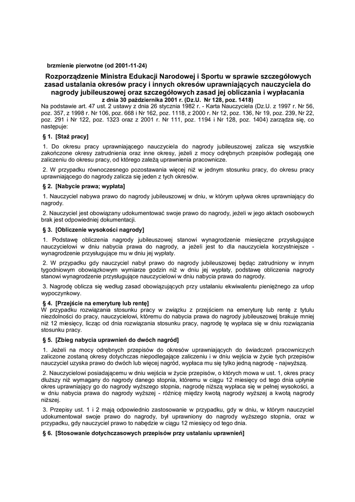 brzmienie pierwotne (od 2001-11-24) Rozporządzenie Ministra Edukacji Narodowej i Sportu w sprawie szczegółowych zasad ustalania okresów pracy i innych okresów uprawniających nauczyciela do nagrody jubileuszowej oraz szczegółowych zasad jej obliczania i wypłacania z dnia 30 października 2001 r. (Dz.U. Nr 128, poz. 1418) Na podstawie art. 47 ust. 2 ustawy z dnia 26 stycznia 1982 r. - Karta Nauczyciela (Dz.U. z 1997 r. Nr 56, poz. 357, z 1998 r. Nr 106, poz. 668 i Nr 162, poz. 1118, z 2000 r. Nr 12, poz. 136, Nr 19, poz. 239, Nr 22, poz. 291 i Nr 122, poz. 1323 oraz z 2001 r. Nr 111, poz. 1194 i Nr 128, poz. 1404) zarządza się, co następuje: § 1. [Staż pracy] 1. Do okresu pracy uprawniającego nauczyciela do nagrody jubileuszowej zalicza się wszystkie zakończone okresy zatrudnienia oraz inne okresy, jeżeli z mocy odrębnych przepisów podlegają one zaliczeniu do okresu pracy, od którego zależą uprawnienia pracownicze. 2. W przypadku równoczesnego pozostawania więcej niż w jednym stosunku pracy, do okresu pracy uprawniającego do nagrody zalicza się jeden z tych okresów. § 2. [Nabycie prawa; wypłata] 1. Nauczyciel nabywa prawo do nagrody jubileuszowej w dniu, w którym upływa okres uprawniający do nagrody. 2. Nauczyciel jest obowiązany udokumentować swoje prawo do nagrody, jeżeli w jego aktach osobowych brak jest odpowiedniej dokumentacji. § 3. [Obliczenie wysokości nagrody] 1. Podstawę obliczenia nagrody jubileuszowej stanowi wynagrodzenie miesięczne przysługujące nauczycielowi w dniu nabycia prawa do nagrody, a jeżeli jest to dla nauczyciela korzystniejsze wynagrodzenie przysługujące mu w dniu jej wypłaty. 2. W przypadku gdy nauczyciel nabył prawo do nagrody jubileuszowej będąc zatrudniony w innym tygodniowym obowiązkowym wymiarze godzin niż w dniu jej wypłaty, podstawę obliczenia nagrody stanowi wynagrodzenie przysługujące nauczycielowi w dniu nabycia prawa do nagrody. 3. Nagrodę oblicza się według zasad obowiązujących przy ustalaniu ekwiwalentu pieniężnego za urlop wypoczynkowy. § 4. [Przejście na emeryturę lub rentę] W przypadku rozwiązania stosunku pracy w związku z przejściem na emeryturę lub rentę z tytułu niezdolności do pracy, nauczycielowi, któremu do nabycia prawa do nagrody jubileuszowej brakuje mniej niż 12 miesięcy, licząc od dnia rozwiązania stosunku pracy, nagrodę tę wypłaca się w dniu rozwiązania stosunku pracy. § 5. [Zbieg nabycia uprawnień do dwóch nagród] 1. Jeżeli na mocy odrębnych przepisów do okresów uprawniających do świadczeń pracowniczych zaliczone zostaną okresy dotychczas niepodlegające zaliczeniu i w dniu wejścia w życie tych przepisów nauczyciel uzyska prawo do dwóch lub więcej nagród, wypłaca mu się tylko jedną nagrodę - najwyższą. 2. Nauczycielowi posiadającemu w dniu wejścia w życie przepisów, o których mowa w ust. 1, okres pracy dłuższy niż wymagany do nagrody danego stopnia, któremu w ciągu 12 miesięcy od tego dnia upłynie okres uprawniający go do nagrody wyższego stopnia, nagrodę niższą wypłaca się w pełnej wysokości, a w dniu nabycia prawa do nagrody wyższej - różnicę między kwotą nagrody wyższej a kwotą nagrody niższej. 3. Przepisy ust. 1 i 2 mają odpowiednio zastosowanie w przypadku, gdy w dniu, w którym nauczyciel udokumentował swoje prawo do nagrody, był uprawniony do nagrody wyższego stopnia, oraz w przypadku, gdy nauczyciel prawo to nabędzie w ciągu 12 miesięcy od tego dnia. § 6. [Stosowanie dotychczasowych przepisów przy ustalaniu uprawnień] Nauczycielom, którzy przed dniem wejścia w życie rozporządzenia nabyli prawo do nagrody jubileuszowej, do okresu pracy uprawniającego do kolejnych nagród zalicza się okresy zaliczane na podstawie rozporządzenia, o którym mowa w § 7. § 7. [Uprawnienie do nagrody na podstawie odrębnych przepisów] Traci moc rozporządzenie Ministra Edukacji Narodowej z dnia 4 lutego 1997 r. w sprawie szczegółowych zasad ustalania okresów pracy i innych okresów uprawniających nauczyciela do nagrody jubileuszowej oraz szczegółowych zasad jej obliczania i wypłacania (Dz.U. Nr 14, poz. 77). § 8. [Wejście w życie] Rozporządzenie wchodzi w życie po upływie 14 dni od dnia ogłoszenia.