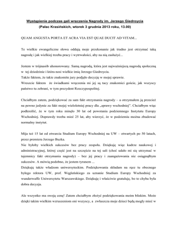 Wystąpienie podczas gali wręczenia Nagrody im. Jerzego Giedroycia (Pałac Krasińskich, wtorek 3 grudnia 2013 roku, 13.00) QUAM ANGUSTA PORTA ET ACRA VIA EST QUAE DUCIT AD VITAM... Te wielkie ewangeliczne słowa oddają moje przekonanie jak trudno jest otrzymać taką nagrodę i jak wielkiej trzeba pracy i wytrwałości, aby na nią zasłużyć... Jestem w trójnasób uhonorowany. Samą nagrodą, która jest najważniejszą nagrodą społeczną w tej dziedzinie i która nosi wielkie imię Jerzego Giedroycia. Także faktem, że takie znakomite jury podjęło decyzję w mojej sprawie. Wreszcie faktem że świadkami wręczenia mi jej są tacy znakomici goście, jak wszyscy państwo tu zebrani, w tym prezydent Rzeczypospolitej. Chciałbym zatem, podziękować za sam fakt otrzymania nagrody – a otrzymałem ją przecież na pewno jedynie za fakt mojej wieloletniej pracy dla „sprawy wschodniej”. Chciałbym więc podkreślić, że w tym roku minęło 30 lat od powstania podziemnego Instytutu Europy Wschodniej. Doprawdy trzeba mieć 25 lat, aby wierzyć, że w podziemiu można zbudować normalny instytut. Mija też 15 lat od otwarcia Studium Europy Wschodniej na UW – otwartych po 50 latach, przez premiera Jerzego Buzka. Nie byłoby wielkich sukcesów bez pracy zespołu. Dziękuję więc kadrze naukowej i administracyjnej, której część jest na szczęście na tej sali (choć udało mi się utrzymać w tajemnicy fakt otrzymania nagrody) – bez jej pracy i zaangażowania nie osiągnąłbym sukcesów. A mówią podobno, że jestem tyranem ... Dziękuję także władzom uniwersyteckim. Podziękowania składam na ręce tu obecnego byłego rektora UW, prof. Węgleńskiego za uznanie Studium Europy Wschodniej za wunderwaffe Uniwersytetu Warszawskiego. Dziękuję i właściwie gratuluję, bo to chyba była dobra decyzja. Ale wszystko ma swoją cenę! Zatem chciałbym złożyć podziękowania moim bliskim. Może dzięki takim wielkim wzruszeniom oni wszyscy, a zwłaszcza moje dzieci będą mogły mieć w tym jakąś własną przyjemność, jakiś element satysfakcji za to, że ich ojca tak często nie ma w domu, że jak tylko dzieje się jakaś rewolucja, to on na pewno wyjedzie... Dodam, że oczywiście i dziś byłbym w Kijowie tak jak 9 lat temu, ale jak państwo widzą Nagroda im. Jerzego Giedroycia ważniejsza jest nawet od rewolucji... W tak wielkiej dla mnie chwili chciałbym wspomnieć spośród wielu osób, którym tak wiele zawdzięczam, prof. Aleksandra Gieysztora, mego Mistrza - porzuciłem co prawda mediewistykę i łacinę średniowieczną, ale na zawsze go zapamiętam... Chciałbym także wspomnieć mego śp. Ojca, zmarłego nieomal 30 lat temu. Byłem dzieckiem bardzo dojrzałego mężczyzny, co może było piękne, ale przyniosło także smutek śmierci, gdy on miał co prawda lat 90, ale ja tylko 27... Urodzony w1896 roku, był członkiem POW, żołnierzem wojny polsko-bolszewickiej, żołnierzem podziemia w latach II wojny światowej (pseud. „Liść II"), żołnierzem WIN-u, dwukrotnym więźniem w latach 50. ... Miał na mnie wielki wpływ, miał wpływ na to, jak myślę. Wierzę, że byłby dziś ze mnie bardzo dumny. Chciałbym jedynie wspomnieć obrazek z 1981 roku, gdy przyjechałem po dłuższej nieobecności do rodziców. Opowiadałem im, jak pracujemy, jak demonstrujemy, drukujemy w czasie „Solidarności”. Nagle moja śp. Mama przerażona zupełnie, mówi: „przecież zamkną Cię do więzienia, wyrzucą z uniwersytetu. Do czego prowadzisz. Nie wiesz, co się działo z ojcem, z Twoim rodzeństwem?” I prosi Ojca, który właśnie przyszedł:-„zrób coś, powiedz mu coś”. Pamiętam do dziś odpowiedź Ojca: „A cóż tu mówić, zwyczajna patriotyczna robota”. Pamiętam tę scenę jak dziś, sylwetkę Ojca w drzwiach, staje mi przed oczyma... Nie wiem, co to jest nowoczesny patriotyzm. Ja widzę go najprościej, zwyczajnie – trzeba kochać swój kraj, swoją ojczyznę i jeśli będzie trzeba, należy być gotowym nawet na największe poświęcenia i ofiary. Po prostu! A równocześnie należy z wielkim uszanowanie podchodzić do innych narodów. Jest to zwłaszcza ważne dla Polaka, ponieważ Polska obecna jest jednym z dziedziców dawnej wielonarodowej Rzeczypospolitej. Takie podejście winno być dla nas rzeczą naturalną. Ale w życiu codziennym, gdy wielkie ofiary nie są potrzebne starajmy się stosować prostą zasadę wielkiego działacza i patrioty, ks. Stanisława Staszica, aby „być narodowi pożytecznym...”. Bądźmy narodowi pożytecznymi... Ojczyzna nasza jest niestety jeszcze ciągle zbyt słaba, za biedna, aby zaangażować prawdziwie wielkie środki w pomoc dla krajów sąsiednich. Chodzi o wsparcie, wymianę młodzieży i studentów, stypendia itd. Tu potrzeba znacznie więcej środków, aby odegrać rolę, jaką moglibyśmy odegrać i na jaką Polska zasługuje. Ale aby osiągnąć wielkie cele musimy – wszyscy razem i każdy z osobna – ciężko pracować, każdy tam, gdzie go życie postawiło – dla siebie, dla rodziny, dla instytucji, dla ojczyzny wreszcie. Ciężka wytrwała praca zawsze daje wyniki. Kończąc zdaję sobie niestety sprawę, że już drugi raz tej wielkiej nagrody nie dostanę. Byłem wielokrotnie do niej nominowany (chyba z 10 razy), zawsze w gronie bardzo wybitnych kandydatów, co już jest zaszczytem, dostawałem stale gratulacje z powodu bycia nominowanym. I z tym już będzie koniec. W dodatku, teraz już sam będę musiał wybierać spośród następnych znakomitych kandydatów – tylko jednego. A to już nie jest ani miłe, ani łatwe... Jestem ogromnie wzruszony. Dziękuję i winszuję pismu „Rzeczpospolita” za utrzymanie pięknej tradycji Nagrody im. Jerzego Giedroycia. Dodam, że otrzymałem tę nagrodę w wyjątkowym dla mnie roku, kiedy zostałem niedawno dwukrotnie uhonorowany tytułem doktora honoris causa, czyli najwyższym honorem w tradycji akademickiej. A teraz z kolei otrzymuj