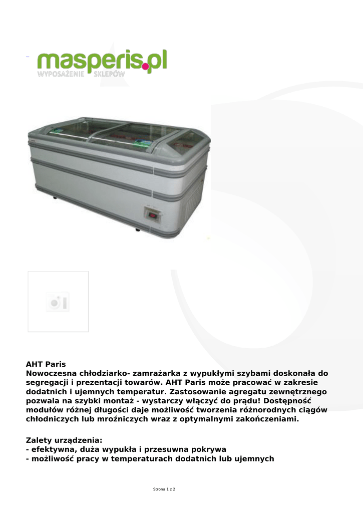 AHT Paris Nowoczesna chłodziarko- zamrażarka z wypukłymi szybami doskonała do segregacji i prezentacji towarów. AHT Paris może pracować w zakresie dodatnich i ujemnych temperatur. Zastosowanie agregatu zewnętrznego pozwala na szybki montaż - wystarczy włączyć do prądu! Dostępność modułów różnej długości daje możliwość tworzenia różnorodnych ciągów chłodniczych lub mroźniczych wraz z optymalnymi zakończeniami. Zalety urządzenia: - efektywna, duża wypukła i przesuwna pokrywa - możliwość pracy w temperaturach dodatnich lub ujemnych Strona 1 z 2 - gwarancja jakości produktu lepsza prezentacja towaru automatyczny system rozmrażania oszczędność energii gwarantowana dzięki przesuwnym szybom niskie koszty inwestycji i eksploatacji napięcie 230 V - tylko wstawić i włączyć do prądu! Zakresy temperatur(w zależności od modelu) chłodzenie: +3 °C do +15 °C mrożenie: -18 °C do -20 °C (-23 °C) chłodzenie mięsa i mięsa mielonego: 0 °C do +2 °C Wymiary zewnętrzne: Długość:185[SZYBY BOCZNE] 210,250 cm Szerokość: 87 cm Wysokość: 87cm Strona 2 z 2