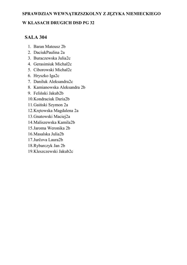 SPRAWDZIAN WEWNĄTRZSZKOLNY Z JĘZYKA NIEMIECKIEGO W KLASACH DRUGICH DSD PG 32 SALA 304 1. Baran Mateusz 2b 2. DaciukPaulina 2a 3. Buraczewska Julia2c 4. Gerasimiuk Michał2c 5. Ciborowski Michał2c 6. Hryszko Iga2c 7. Daniluk Aleksandra2c 8. Kamianowska Aleksandra 2b 9. Feliński Jakub2b 10.Kondraciuk Daria2b 11.Gaiński Szymon 2a 12.Krętowska Magdalena 2a 13.Gnatowski Maciej2a 14.Maliszewska Kamila2b 15.Jaroma Weronika 2b 16.Masalska Julia2b 17.Jurčova Laura2b 18.Rybarczyk Jan 2b 19.Kleszczewski Jakub2c SPRAWDZIAN WEWNĄTRZSZKOLNY Z JĘZYKA NIEMIECKIEGO W KLASACH DRUGICH DSD PG 32 SALA 305 1. Konopka Elżbieta 2b 2. Stepaniuk Katarzyna 2b 3. Kulik Julia 2b 4. Toczydłowski Kacper 2b 5. Puciłowska Urszula 2a 6. Urbańska Aleksandra 2a 7. Tomaszuk Magdalena 2b 8. Wasiluk Piotr 2b 9. Turkowska Kinga 2c 10.Wensław Marta 2c 11.Wołosik Kacper 2b 12.Wojtkielewicz Kamila 2c 13.Zajkowska Wiktoria 2a 14.Wojtkowski Wojciech 2c 15.Żoładkowska Maria 2a 16.Zdrodowska Kinga 2c 17. Błażko Milena 2a. 18.Jakoniuk Kamil 2b 19. Hankowska Oliwia 2c SPRAWDZIAN WEWNĄTRZSZKOLNY Z JĘZYKA NIEMIECKIEGO W KLASACH DRUGICH DSD PG 32 SALA 308 1. Jóżwik Karol 2c 2. Fudali Ernest 2a 3. Zińczuk Grzegorz 2a 4. Kuzyka Julia 2b 5. Rusiłowicz Karolina 2a 6. Sokołowski Mateusz 2a 7. Szaciło Konrad 2c 8. Brzostek Julia 2b 9. Marciniak Karolina 2b 10. Niezabitowski Jakub 2b 11.WęglarzAnna2b 12. Chren Julia 2c 13.Guzowska Julia 2a 14.Wilczyński Bartek 2c 15. Wojnowska Julia 2c 16.Tomkowicz Wiktoria 2a 17. Wyszyński Piotr 2c 18. Owczarz Joanna 2c 19. Szerenos Maciej 2c SPRAWDZIAN WEWNĄTRZSZKOLNY Z JĘZYKA NIEMIECKIEGO W KLASACH DRUGICH DSD PG 32 SALA 307 1. Pilarski Jan 2a 2. Droździewicz Wojciech 2a 3. Zacharczuk Jakub 2b 4. Bogusz Julia 2a 5. Muśko Weronika 2c 6. Guszcza Gabriela 2b 7. Stasiewicz Jan 2c 8. Grycel Karolina 2a 9. Klebus Natalia 2c 10.Jewsiejenko Artemi 2a 11.Wyszyński Piotr 2c 12.Kalinowska Urszula 2b 13.Boćkowska Kinga 2c 14.Paczkowska Katarzyna 2b 15.Puchnowska Magdalena 2c 16.Panas Zuzanna 2a 17.Szymborska Elwira 2c 18.Chodnicka Oliwia 2a 19.Sitnik Hubert 2b