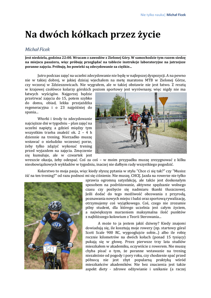 Nie tylko nauka| Michał Ficek Na dwóch kółkach przez życie Michał Ficek Jest niedziela, godzina 22:00. Wracam z zawodów z Zielonej Góry. W samochodzie tym razem siedzę na miejscu pasażera, więc próbuję przeglądać na tablecie instrukcje laboratoryjne na jutrzejsze poranne zajęcia. Próbuję, bo powieki są zdecydowanie za ciężkie... Jutro podczas zajęc na uczelni zdecydowanie nie będę w najlepszej dyspozycji. A na pewno nie w takiej dobrej, w jakiej dzisiaj wjechałem na metę maratonu MTB w Zielonej Gorze, czy wczoraj w Zdzieszowicach. Nie wygrałem, ale w takiej obstawie nie jest łatwo. Z resztą w krajowej czołowce kolarzy gorskich poziom sportowy jest wyrownany, więc nigdy nie ma łatwych wyscigow. Najgorzej będzie przetrwac zajęcia do 15, potem szybko do domu, obiad, lekka przejazdzka regeneracyjna i o 23 najpozniej do spania... Wtorki i srody to zdecydowanie najcięzsze dni w tygodniu – plan zajęc na uczelni napięty, a gdzies między tym wszystkim trzeba znalezc ok. 2 – 4 h dziennie na trening. Nierzadko muszę wstawac o nieludzko wczesnej porze, zeby tylko zdązyc wykonac trening przed wyjazdem na zajęcia. Zmęczenie się kumuluje, ale w czwartek jest wreszcie okazja, zeby odespac. Cos za cos – w moim przypadku muszę zrezygnowac z kilku nieobowiązkowych wykładow w tygodniu, inaczej nie dałbym rady wszystkiego pogodzic. Kolarstwo to moja pasja, więc kiedy słyszę pytania w stylu "Chce ci się tak?" czy "Musisz isc na ten trening?" od razu podnosi mi się cisnienie. Nie muszę, CHCĘ. Jazda na rowerze nie tylko sprawia ogromną satysfakcję, ale takze jest doskonałym sposobem na podrozowanie, aktywne spędzanie wolnego czasu czy pozbycie się nadmiaru tkanki tłuszczowej. Jesli dodac do tego mozliwosc obcowania z przyrodą, poznawania nowych miejsc i ludzi oraz sportową rywalizację, otrzymujemy cos wyjątkowego. Cos, czego nie zrozumie pilny student, dla ktorego uczelnia jest całym zyciem, a największym marzeniem maksymalna ilosc punktow z najblizszego kolowium z Teorii Sterowania... A moze to ja jestem jakis dziwny? Kiedy znajomi dowiadują się, ile kosztują moje rowery (np. startowy goral Scott Scale 900 RC, wygooglujcie sobie...) albo ile robię rocznie kilometrow na dwoch kołach (ponad 15 tysięcy) pukają się w głowę. Przez pierwsze trzy lata studiow mieszkałem w akademiku, oczywiscie z rowerem. Nie muszę chyba pisac o tym, ze poranne wstawanie na trening niezaleznie od pogody i pory roku, czy chodzenie spac przed połnocą nie jest zbyt popularną praktyką wsrod mieszkancow akademikow. Nie bez znaczenia jest takze aspekt diety - zdrowe odzywianie i unikanie (a raczej Nie tylko nauka| Michał Ficek ograniczanie) alkoholu jest nieuniknione w przypadku sportowcow wytrzymałosciowych. Nie mowiąc juz o pilnowaniu poziomu tkanki tłuszczowej, ktory u mnie w sezonie waha się w granicach 5%. Bez poswięcen nie ma rezultatow. Bardzo wiele zawdzięczam moim sponsorom (Volkswagen Samochody Uzytkowe oraz Scott), ktorzy wciąz umozliwiają mi "zabawę" w kolarstwo. Nie jest to tani sport, dlatego na tym poziomie wsparcie z zewnątrz jest nieocenione. Łączenie studiow na niełatwym kierunku z profesjonalnym uprawianiem sportu nie jest rzeczą prostą, jednak efektywne pogodzenie dwoch tak roznych od siebie swiatow potrafi dac duzą dawkę satysfakcji. Na koniec wazna rada – podczas studiow nie rezygnujcie ze swoich pasji! Liczenie całek nie jest najwazniejszą umiejętnoscią w zyciu człowieka, dlatego nie ograniczajmy swojego zycia tylko do murow uczelni. Carpe Diem!