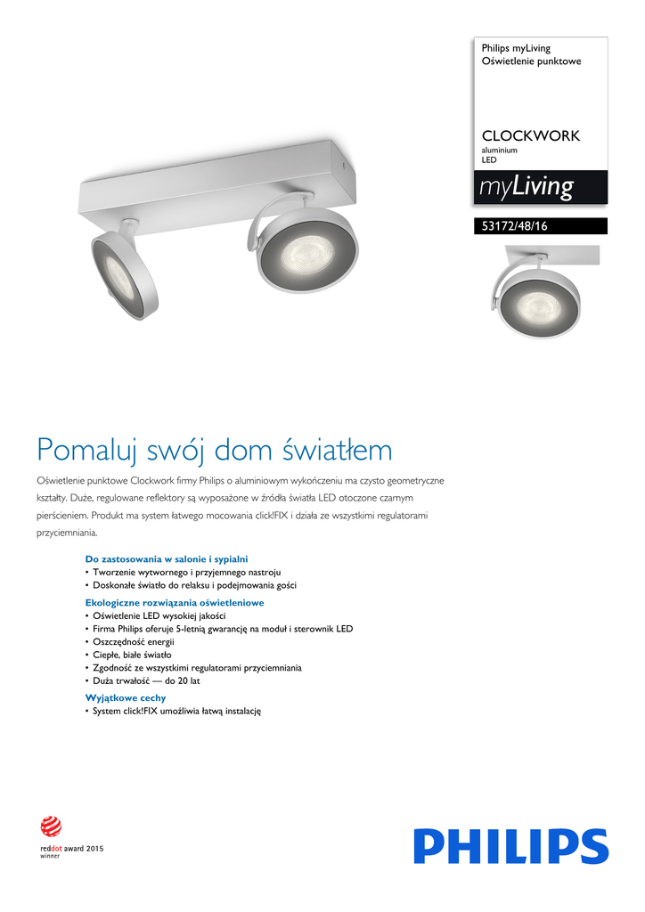 Philips myLiving Oświetlenie punktowe CLOCKWORK aluminium LED myLiving 53172/48/16 Pomaluj swój dom światłem Oświetlenie punktowe Clockwork firmy Philips o aluminiowym wykończeniu ma czysto geometryczne kształty. Duże, regulowane reflektory są wyposażone w źródła światła LED otoczone czarnym pierścieniem. Produkt ma system łatwego mocowania click!FIX i działa ze wszystkimi regulatorami przyciemniania. Do zastosowania w salonie i sypialni • Tworzenie wytwornego i przyjemnego nastroju • Doskonałe światło do relaksu i podejmowania gości Ekologiczne rozwiązania oświetleniowe • Oświetlenie LED wysokiej jakości • Firma Philips oferuje 5-letnią gwarancję na moduł i sterownik LED • Oszczędność energii • Ciepłe, białe światło • Zgodność ze wszystkimi regulatorami przyciemniania • Duża trwałość — do 20 lat Wyjątkowe cechy • System click!FIX umożliwia łatwą instalację winner 531724816 Oświetlenie punktowe CLOCKWORK aluminium, LED Zalety Oświetlenie LED wysokiej jakości Zgodność ze wszystkimi regulatorami przyciemniania światła, co pozwala zmniejszyć rachunki za prąd i przyczynia się do ochrony środowiska. Duża trwałość Technologia LED zastosowana w tej lampie firmy Philips to wyjątkowe rozwiązanie opracowane przez firmę Philips. Natychmiast się włącza, pozwala na uzyskanie optymalnej wydajności oświetlenia oraz podkreśla i ożywia kolory w Twoim domu. Ta lampa LED firmy Philips jest wyposażona w najnowszą technologię LED, która współpracuje niemal ze wszystkimi regulatorami przyciemniania. Możesz użyć posiadanego regulatora lub dowolnego innego! Ciepłe, białe światło System łatwego mocowania click!FIX Światło może mieć różne temperatury barwowe oznaczane za pomocą jednostek zwanych kelwinami (K). Lampy o niskiej wartości kelwinów zapewniają ciepłe, bardziej przytulne światło, natomiast lampy o wysokiej wartości kelwinów dają chłodne, bardziej pobudzające światło. Ta lampa firmy Philips rzuca ciepłe, białe światło, które zapewnia przytulną atmosferę. Lampa LED wykorzystuje system click!FIX, czyli nowy, rewolucyjny system mocowania opatentowany przez firmę Philips. Korzystając z systemu click!FIX, można łatwo zamontować lampę w 4 prostych krokach. To proste i szybkie! Oszczędność energii Ta energooszczędna lampa firmy Philips zużywa mniej energii niż tradycyjne źródła Produkt godny zaufania. Trwałość wbudowanych źródeł światła LED wykorzystanych w tej lampie LED firmy Philips wynosi nawet 20 tysięcy godzin (co oznacza 20 lat w przypadku średniego użycia przez 3 godziny dziennie, przy co najmniej 13 000 włączeń i wyłączeń). Już nie musisz się martwić naprawą lub wymianą żarówki, ciesząc się doskonałym, nastrojowym oświetleniem w domu. Tworzenie wytwornego nastroju Ta lampa została stworzona w oparciu o nowoczesne poczucie smaku, trendy i style życia. Doskonale wtapia się w wystrój wnętrza i pozwala stworzyć wymarzony, niepowtarzalny nastrój. Doskonałe światło do relaksu i podejmowania gości Salon jest sercem każdego domu — to miejsce przeznaczone do rodzinnych spotkań, odpoczynku i podejmowania gości. Oświetlenie w salonie i w sypialni powinno dawać dużą swobodę i możliwość dostosowania do potrzeb użytkowników, dzięki czemu będzie mogło sprostać ich wymaganiom w ciągu całego dnia. Przemyślane rozmieszczenie różnych typów oświetlenia i umiejętna zabawa światłem mogą nie tylko pomóc w stworzeniu wrażenia ciepła i otwartości, ale też sprawić, że pomieszczenie wyda się bardziej przestronne. 531724816 Oświetlenie punktowe CLOCKWORK aluminium, LED Dane techniczne Stylistyka i wykończenie • Materiał: metal • Kolor: aluminium Dodatkowe funkcje/akcesoria w zestawie • Zgodność ze wszystkimi regulatorami przyciemniania • Wbudowane diody LED • Precyzyjne wiązki światła • System mocowania click!FIX • Reflektor z możliwością regulacji • 5 lat gwarancji na moduł LED Wymiary i waga produktu • • • • Wysokość: 9,0 cm Długość: 25,5 cm Szerokość: 9,3 cm Waga netto: 0,690 kg • Łączna moc strumienia świetlnego oprawy w lumenach: 1000 lm • Oprawa z możliwością przyciemniania • LED • Maksymalny okres eksploatacji: 30 000 godz. • Współczynnik IP: IP20, ochrona przed przedmiotami powyżej 12,5 mm, brak ochrony przed wodą • Klasa ochronności: I — uziemienie Serwis • Gwarancja: 5 lat Wymiary i waga opakowania • • • • Wysokość: 29,8 cm Długość: 11,3 cm Szerokość: 11,3 cm Waga: 0,830 kg Różne Dane techniczne • Zasilanie sieciowe: Przedział 220–240 V, 50–60 Hz • Liczba źródeł światła: 2 • Moc źródła światła w zestawie: 4,5 W • Opracowano z myślą o: Salon i sypialnia • Styl: Nowoczesna • Typ: Oświetlenie punktowe • Data wydania 2016-07-17 © 2016 Philips Lighting Holding B.V. Wszelkie prawa zastrzeżone. Wersja: 3.0.1 Dane techniczne mogą ulec zmianie bez powiadomienia. Znaki towarowe są własnością Philips Lighting Holding B.V. lub własnością odpowiednich firm. 12 NC: 9150 043 31101 EAN: 87 18291 48816 3 www.philips.com