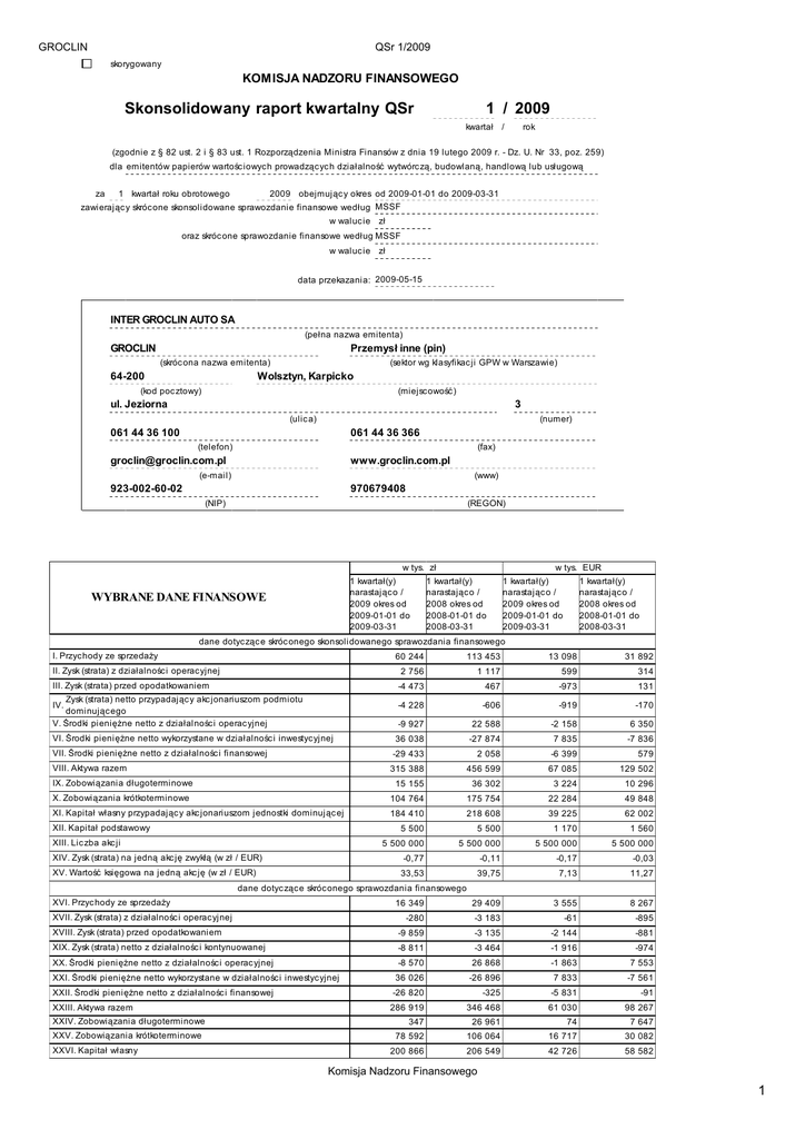 GROCLIN QSr 1/2009 skorygowany KOMISJA NADZORU FINANSOWEGO Skonsolidowany raport kwartalny QSr 1 / 2009 kwartał / rok (zgodnie z § 82 ust. 2 i § 83 ust. 1 Rozporządzenia Ministra Finansów z dnia 19 lutego 2009 r. - Dz. U. Nr 33, poz. 259) dla emitentów papierów wartośc iowyc h prowadząc yc h działalność wytwórc zą, budowlaną, handlową lub usługową za 1 kwartał roku obrotowego 2009 obejmując y okres od 2009-01-01 do 2009-03-31 zawierając y skróc one skonsolidowane sprawozdanie finansowe według MSSF w waluc ie zł oraz skróc one sprawozdanie finansowe według MSSF w waluc ie zł data przekazania: 2009-05-15 INTER GROCLIN AUTO SA (pełna nazwa emitenta) GROCLIN Przemysł inne (pin) (skróc ona nazwa emitenta) 64-200 (sektor wg klasyfikac ji GPW w Warszawie) Wolsztyn, Karpicko (kod poc ztowy) (miejsc owość ) ul. Jeziorna 3 (ulic a) (numer) 061 44 36 100 061 44 36 366 (telefon) (fax) [email protected] www.groclin.com.pl (e-mail) (www) 923-002-60-02 970679408 (NIP) (REGON) w tys. zł 1 kwartał(y) narastając o / 2009 okres od 2009-01-01 do 2009-03-31 WYBRANE DANE FINANSOWE w tys. EUR 1 kwartał(y) narastając o / 2008 okres od 2008-01-01 do 2008-03-31 1 kwartał(y) narastając o / 2009 okres od 2009-01-01 do 2009-03-31 1 kwartał(y) narastając o / 2008 okres od 2008-01-01 do 2008-03-31 dane dotyc ząc e skróc onego skonsolidowanego sprawozdania finansowego I. Przyc hody ze sprzedaży 60 244 113 453 13 098 31 892 II. Zysk (strata) z działalnośc i operac yjnej 2 756 1 117 599 314 III. Zysk (strata) przed opodatkowaniem -4 473 467 -973 131 Zysk (strata) netto przypadając y akc jonariuszom podmiotu dominując ego V. Środki pieniężne netto z działalnośc i operac yjnej IV. -4 228 -606 -919 -170 -9 927 22 588 -2 158 6 350 VI. Środki pieniężne netto wykorzystane w działalnośc i inwestyc yjnej 36 038 -27 874 7 835 -7 836 VII. Środki pieniężne netto z działalnośc i finansowej -29 433 2 058 -6 399 579 315 388 456 599 67 085 129 502 VIII. Aktywa razem IX. Zobowiązania długoterminowe 15 155 36 302 3 224 10 296 X. Zobowiązania krótkoterminowe 104 764 175 754 22 284 49 848 XI. Kapitał własny przypadając y akc jonariuszom jednostki dominując ej 184 410 218 608 39 225 62 002 5 500 5 500 1 170 1 560 5 500 000 5 500 000 5 500 000 5 500 000 -0,77 -0,11 -0,17 -0,03 33,53 39,75 7,13 11,27 16 349 29 409 3 555 8 267 -280 -3 183 -61 -895 XVIII. Zysk (strata) przed opodatkowaniem -9 859 -3 135 -2 144 -881 XIX. Zysk (strata) netto z działalnośc i kontynuowanej -8 811 -3 464 -1 916 -974 XX. Środki pieniężne netto z działalnośc i operac yjnej -8 570 26 868 -1 863 7 553 XXI. Środki pieniężne netto wykorzystane w działalnośc i inwestyc yjnej 36 026 -26 896 7 833 -7 561 XXII. Środki pieniężne netto z działalnośc i finansowej -26 820 -325 -5 831 -91 286 919 346 468 61 030 98 267 XII. Kapitał podstawowy XIII. Lic zba akc ji XIV. Zysk (strata) na jedną akc ję zwykłą (w zł / EUR) XV. Wartość księgowa na jedną akc ję (w zł / EUR) dane dotyc ząc e skróc onego sprawozdania finansowego XVI. Przyc hody ze sprzedaży XVII. Zysk (strata) z działalnośc i operac yjnej XXIII. Aktywa razem XXIV. Zobowiązania długoterminowe XXV. Zobowiązania krótkoterminowe XXVI. Kapitał własny 347 26 961 74 7 647 78 592 106 064 16 717 30 082 200 866 206 549 42 726 58 582 Komisja Nadzoru Finansowego 1 GROCLIN QSr 1/2009 XXVII. Kapitał podstawowy XXVIII. Lic zba akc ji XXIX. Zysk (strata) na jedną akc ję zwykłą (w zł / EUR) XXX. Wartość księgowa na jedną akc ję (w zł / EUR) 5 500 5 500 1 170 1 560 5 500 000 5 500 000 5 500 000 5 500 000 -1,60 -0,63 -0,35 -0,18 36,52 37,55 7,77 10,65 Raport powinien zostać przekazany do Komisji Nadzoru Finansowego, Giełdy Papierów Wartośc iowyc h w Warszawie S.A. oraz agenc ji informac yjnej zgodnie z przepisami prawa ZAWARTOŚĆ RAPORTU Plik Opis SF-MSSF grupa IGA Iq_2009_ESPI.pdf Skonsolidowany rozszerzony raport kwartalny grupy kapitałowej Inter Groc lin Auto za I kwartał 2009 r. PODPISY OSÓB REPREZENTUJĄCYCH SPÓŁKĘ Data Imię i Nazwisko Stanowisko/Funkc ja Podpis 2009-05-15 Zbigniew Drzymała Prezes Zarządu Zbigniew Drzymała 2009-05-15 Barbara Sikorska Członek Zarządu Barbara Sikorska 2009-05-15 Tadeusz Rębac z Członek Zarządu Tadeusz Rębac z 2009-05-15 Piotr Musiał Członek Zarządu Piotr Musiał Komisja Nadzoru Finansowego 2 Nazwa grupy kapitałowej Inter Groclin Auto Okres objęty sprawozdaniem finansowym: 01-01-2009 - 31-03-2009 Poziom zaokrągleń: tysiące Waluta sprawozdawcza: złoty polski (PLN) SKONSOLIDOWANY BILANS Aktywa AKTYWA TRWAŁE Wartości niematerialne Wartość firmy jednostek podporządkowanych Rzeczowe aktywa trwałe Nieruchomości inwestycyjne Długoterminowe aktywa finansowe dostępne do sprzedaŜy Pozostałe długoterminowe aktywa finansowe NaleŜności długoterminowe Aktywa z tytułu odroczonego podatku dochodowego AKTYWA OBROTOWE Zapasy NaleŜności z tytułu dostaw i usług NaleŜności z tytułu bieŜącego podatku dochodowego Pozostałe naleŜności krótkoterminowe Krótkoterminowe aktywa finansowe dostępne do sprzedaŜy Krótkoterminowe aktywa finansowe przeznaczone do obrotu Pozostałe krótkoterminowe aktywa finansowe Środki pienięŜne i ich ekwiwalenty Aktywa trwałe zaklasyfikowane jako przeznaczone do sprzedaŜy AKTYWA RAZEM Pasywa KAPITAŁ WŁASNY Kapitał własny przypadający akcjonariuszom jednostki dominującej Kapitał podstawowy Kapitał zapasowy Kapitał z aktualizacji wyceny Akcje własne Kapitały rezerwowe RóŜnice kursowe z przeliczenia jednostek zagranicznych Ujęte bezpośrednio w kapitale kwoty dotyczące aktywów trwałych przeznaczonych do sprzedaŜy Zysk (strata) z lat ubiegłych i roku bieŜącego Udziały mniejszości ZOBOWIĄZANIA Zobowiązania długoterminowe Długoterminowe kredyty i poŜyczki Pozostałe długoterminowe zobowiązania finansowe Pozostałe zobowiązania długoterminowe Rezerwa z tytułu odroczonego podatku dochodowego Re