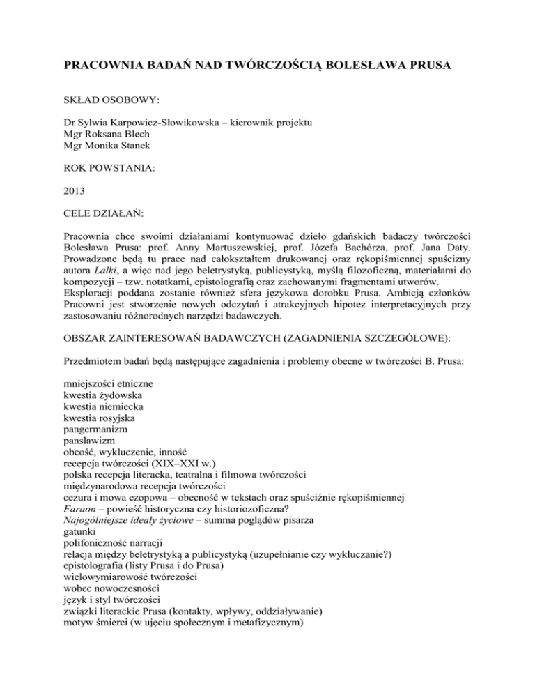 PRACOWNIA BADAŃ NAD TWÓRCZOŚCIĄ BOLESŁAWA PRUSA SKŁAD OSOBOWY: Dr Sylwia Karpowicz-Słowikowska – kierownik projektu Mgr Roksana Blech Mgr Monika Stanek ROK POWSTANIA: 2013 CELE DZIAŁAŃ: Pracownia chce swoimi działaniami kontynuować dzieło gdańskich badaczy twórczości Bolesława Prusa: prof. Anny Martuszewskiej, prof. Józefa Bachórza, prof. Jana Daty. Prowadzone będą tu prace nad całokształtem drukowanej oraz rękopiśmiennej spuścizny autora Lalki, a więc nad jego beletrystyką, publicystyką, myślą filozoficzną, materiałami do kompozycji – tzw. notatkami, epistolografią oraz zachowanymi fragmentami utworów. Eksploracji poddana zostanie również sfera językowa dorobku Prusa. Ambicją członków Pracowni jest stworzenie nowych odczytań i atrakcyjnych hipotez interpretacyjnych przy zastosowaniu różnorodnych narzędzi badawczych. OBSZAR ZAINTERESOWAŃ BADAWCZYCH (ZAGADNIENIA SZCZEGÓŁOWE): Przedmiotem badań będą następujące zagadnienia i problemy obecne w twórczości B. Prusa: mniejszości etniczne kwestia żydowska kwestia niemiecka kwestia rosyjska pangermanizm panslawizm obcość, wykluczenie, inność recepcja twórczości (XIX–XXI w.) polska recepcja literacka, teatralna i filmowa twórczości międzynarodowa recepcja twórczości cezura i mowa ezopowa – obecność w tekstach oraz spuściźnie rękopiśmiennej Faraon – powieść historyczna czy historiozoficzna? Najogólniejsze ideały życiowe – summa poglądów pisarza gatunki polifoniczność narracji relacja między beletrystyką a publicystyką (uzupełnianie czy wykluczanie?) epistolografia (listy Prusa i do Prusa) wielowymiarowość twórczości wobec nowoczesności język i styl twórczości związki literackie Prusa (kontakty, wpływy, oddziaływanie) motyw śmierci (w ujęciu społecznym i metafizycznym) ZADANIA DO REALIZACJI: Aplikowanie o granty badawcze NCN, Narodowego Programu Rozwoju Humanistyki. Organizowanie konferencji poświęconych twórczości B. Prusa. Publikacje naukowe i popularnonaukowe. Udział w pracach Komitetu Edycji Krytycznej Pism Wszystkich Bolesława Prusa (w ramach grantu Towarzystwa Literackiego im. Adama Mickiewicza NPRH 0134/FNiTP/H11/80/2011) – S. Karpowicz-Słowikowska Udział w projekcie "Młodzi pozytywiści warszawscy" (grant NPRH 11H 13 058182) – S. Karpowicz-Słowikowska Popularyzacja wiedzy na temat biografii oraz twórczości B. Prusa poprzez współpracę ze szkołami oraz ośrodkami kulturalnymi (np. odczyty). Upublicznianie osiągnięć oraz idei poprzez organizację wykładów gościnnych. Współpraca ze studenckim Kołem Naukowym „Pozytywnie Zakręconych” (m.in. w zakresie przygotowania konferencji) PUBLIKACJE I WYSTĄPIENIA CZŁONKÓW PRACOWNI: S. Karpowicz-Słowikowska, „Gdzie bowiem spojrzę, widzę tylko chmury” – wiek XIX w publicystyce Bolesława Prusa, [w:] Literackie zmierzchy dziewiętnastowieczności, pod red. S. Brzozowskiej, A. Mazur, Opole 2013, s. 35-49, ISBN 978-83-7395-540-0. S. Karpowicz-Słowikowska, „Swoi” i „obcy”. Kresy w publicystyce Bolesława Prusa, [w:] Pogranicza, Kresy, Wschód a idee Europy, seria I: Prace dedykowane Profesor Swietłanie Musijenko, pod red. A. Janickiej, G. Kowalskiego, Ł. Zabielskiego, Białystok 2013, s. 543563, ISBN 978-83-63470-13-5. S. Karpowicz-Słowikowska, Między służbą a duszpasterstwem. Bolesława Prusa wizja kapłaństwa. Referat wygłoszony na ogólnopolskiej konferencji naukowej: „Postać księdza w literaturze”19-20.04.2013. Organizatorami byli: Towarzystwo Naukowe KUL, Katedra Literatury Realizmu i Naturalizmu KUL, Wyższe Seminarium Duchowne w Kielcach. S. Karpowicz-Słowikowska, Czy kobieta potrafi zarabiać pieniądze? Przypadek „Emancypantek” Bolesława Prusa. Refera wygłoszony na konferencji naukowo-krytycznej „Literatura, pieniądze, kobieta” 5-8.06.2013. Organizator:Uniwersytet Szczeciński. S. Karpowicz-Słowikowska, Prusowski projekt kobiecości: Bovary – Androgyne – Salome. Przypadek Izabeli („Lalka” Bolesława Prusa). Referat wygłoszony na międzynarodowej konferencji naukowej „Przemiany formuły emancypacji kobiet od XVIII wieku do dwudziestolecia międzywojennego” 26-27.09.2013. Organizator: Uniwersytet w Białymstoku. S. Karpowicz-Słowikowska, „Szorstka przyjaźń”. Żeromski i Prus – korespondencyjnie, [w:] Żeromski. Tradycja i eksperyment, pod red. A. Janickiej, A. Kowalczykowej, G. Kowalskiego, Białystok-Rapperswil 2014, ISBN 978-83-63470-19-7 R. Blech, "Bajka o rybaku i rybce" jako kontekst dla "Historii o ubogim pisarzu" (z "Faraona" Bolesława Prusa); referat wygłoszony na sesji Bestiarium: Akwarium na Uniwersytecie Gdańskim dniu 1.04.2014; R. Blech, Bolesław Prus czyta Ernesta Renana; referat wygłoszony na konferencji naukowej Apokryfy w literaturze polskiej od średniowiecza do współczesności; Gdańsk 21-22.05.2014; R. Blech, O dwóch pieśniach żydowskich (w "Faraonie" Bolesława Prusa), [w:] Biblia w literaturze polskiej. Romantyzm - Pozytywizm - Młoda Polska. Stary Testament, pod red. E. Jakiela i J. Mosakowskiego, Gdańsk 2014, s. 61-71. R. Blech, Opus magnum Bolesława Prusa, [w:] Bolesław Prus, Faraon, wydanie analityczno-krytyczne, Warszawa 2014, s. 597–607. S. Karpowicz-Słowikowska, Między służbą a duszpasterstwem. Bolesława Prusa wizja kapłaństwa, [w:] Postać księdza w literaturze, pod red. G. Głąba, S. Radziszewskiego, Radom 2014, s. 27-41, ISBN 978-83-7789-306-7. R. Blech, Samentu – kapłan boga Seta. Studium postaci, [w:] Postać księdza w literaturze, red. G. Głąb, S. Radziszewski, Radom 2014, s. 43–51. R. Blech, Przygotowanie kompletnego wykazu publikacji poświęconych Faraonowi Bolesława Prusa (przy współudziale prof. dr. hab. Andrzeja Niwińskiego), napisanych przez polskich autorów w latach 1897–2014. Wykaz został dołączony do najnowszego wydania Faraona (B. Prus, Faraon, wydanie analitycznokrytyczne, Warszawa 2014, s. 677–686). S. 