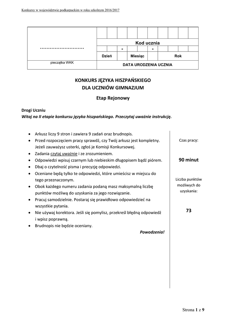 Konkursy w województwie podkarpackim w roku szkolnym 2016/2017 Kod ucznia ……………………… Dzień pieczątka WKK Miesiąc Rok DATA URODZENIA UCZNIA KONKURS JĘZYKA HISZPAŃSKIEGO DLA UCZNIÓW GIMNAZJUM Etap Rejonowy Drogi Uczniu Witaj na II etapie konkursu języka hiszpańskiego. Przeczytaj uważnie instrukcję. Arkusz liczy 9 stron i zawiera 9 zadań oraz brudnopis. Przed rozpoczęciem pracy sprawdź, czy Twój arkusz jest kompletny. Jeżeli zauważysz usterki, zgłoś je Komisji Konkursowej. Zadania czytaj uważnie i ze zrozumieniem. Odpowiedzi wpisuj czarnym lub niebieskim długopisem bądź piórem. Dbaj o czytelność pisma i precyzję odpowiedzi. Oceniane będą tylko te odpowiedzi, które umieścisz w miejscu do tego przeznaczonym. Obok każdego numeru zadania podaną masz maksymalną liczbę punktów możliwą do uzyskania za jego rozwiązanie. Pracuj samodzielnie. Postaraj się prawidłowo odpowiedzieć na wszystkie pytania. Nie używaj korektora. Jeśli się pomylisz, przekreśl błędną odpowiedź i wpisz poprawną. Brudnopis nie będzie oceniany. Powodzenia! Czas pracy: 90 minut Liczba punktów możliwych do uzyskania: 73 Strona 1 z 9 Konkursy w województwie podkarpackim w roku szkolnym 2016/2017 COMPRENSIÓN LECTORA I. Przeczytaj tekst. Do każdego akapitu (1-8) dopasuj właściwy nagłówek (A-I). Wpisz odpowiednią literę obok numeru każdego akapitu. (0-8p.) Uwaga! Jeden nagłówek został podany dodatkowo i nie pasuje do żadnego akapitu. ¿Cómo hacer amigos? Si quieres hacer amigos, primero necesitas ser extrovertido con el fin de conocer gente. Siéntate en algún lugar con otras personas. Recuerda, los amigos rara vez tocarán tu puerta si lo único que haces es estar sentado en tu casa jugando juegos de ordenador. 1. ________________________________ . Una gran manera de conocer personas de todas las edades es realizando labores humanitarias o colaborando en organizaciones de beneficiencia. 2. ________________________________ . Aprende a escuchar con atención lo que dice la gente, recuerda los detalles importantes acerca de ellos. La capacidad para demostrar interés te ganará muchos amigos. 3. ________________________________ . No esperes que los demás te hablen. Es aconsejable buscar el contacto y ser el primero que empiece el diálogo. 4. ________________________________ . Una vez que hayas empezado a pasar tiempo con un posible amigo, recuerda hacer tu parte (por ejemplo: iniciar algunas actividades, recordar su cumpleaños, preguntarle cómo se siente, etc.) o de lo contrario vuestra amistad dejará de funcionar. 5. ________________________________ . Tomar o comer algo juntos es la mejor oportunidad para hablar y llegar a conocerse un poco major. 6. ________________________________ . No es aconsejable llamar a alguien repetidamente o visitarle sin avisar. En genral, hay que tomar la amistad con calma y no tratar de forzar que la intimidad crezca rápidamente. El cambio de ser un conocido a un amigo puede tomar mucho tiempo. 7. ________________________________ . Parte de ser un amigo real es estar preparado para sacrificar tu tiempo y energía con el fin de ayudar a tus amigos. Si un amigo necesita ayuda, debes estar ahí para él. Nunca te quejes de un amigo ni hables mal de él a sus espaldas. 8. ________________________________ . Adaptado de: http://es.wikihow.com/hacer-amigos Strona 2 z 9 Konkursy w województwie podkarpackim w roku szkolnym 2016/2017 A) B) C) D) E) F) G) H) I) Sé un buen oyente. Invítale a comer o a tomar un café. Sé un buen amigo. No hagas nada para presionar a alguien a que sea tu amigo. Inicia una conversación. Motiva a tu amigo. Haz voluntariado. Pasa más tiempo rodeado de personas. Sé leal a tus amigos. II. Przeczytaj tekst i odpowiedz, czy zdania z tabeli, która znajduje się poniżej są prawdziwe (V) czy fałszywe (F). (0-7p.) Alimentación sana La dieta mediterránea es un ejemplo de dieta equilibrada según muchos estudios serios. Para comer de manera saludable y evitar problemas con el sobrepeso o el colesterol, debemos comer alimentos muy variados y hacer ejercicio moderado diariamente. Para que te sea más fácil, recuerda que en tu dieta deben predominar los productos vegetales, sobre todo hortalizas, verduras, legumbres, cereales y frutas, cocinar con aceite de oliva y dar prioridad al pescado, aunque también puedes comer carne con moderación, a ser posible carne blanca, no grasa. El secreto está en saber combinarlos adecuadamente. Conviene decir no a las grasas y sí a los alimentos frescos. Si tienes que hacer la comida, opta siempre por el aceite vegetal, de oliva, pero también en cantidades moderadas. No olvides que las proteínas se peuden obtener no solamente de la carne, los huevos y los productos lácteos. También las legumbres y los cereales son excelentes porque tienen proteínas, carecen de grasa y con ellos ganas en minerales, vitaminas y fibra. Consume con frecuencia ensaladas y fruta fresca y olvídate de los platos preparados y las conservas, que eliminan gran parte de las vitaminas y minerales que contienen los alimentos. La carne, el pescado y las legumbres serán mucho más nutritivos si los condimentas con un chorrito de limón. Evita abusar de los embutidos: un poco de lomo, salchichón o chorizo pueden ser una buena tapa o buen aperitivo, pero solo de vez en cuando. En la variedad y el equilibrio en la alimentación está el secreto de una dieta sana. V 1. La dieta mediterránea es insaludable. 2. Las legumbres contienen demasiadas grasas, por lo que deben evitarse. 3. Los platos preparados pierden parte de las vitaminas y los minerales de los alimentos. 4. Las proteínas se encuentran solamente en la carne. 5. La fibra es un componente que está sobre todo en los cereales y las legumbres. 6. El aceite vegetal en exceso no es recomendable. 7. El zumo de limón es muy saludable. F Strona 3 z 9 Konkursy w województwie podkarpackim w roku szkolnym 2016/2017 LÉXICO Y GRAMÁTICA